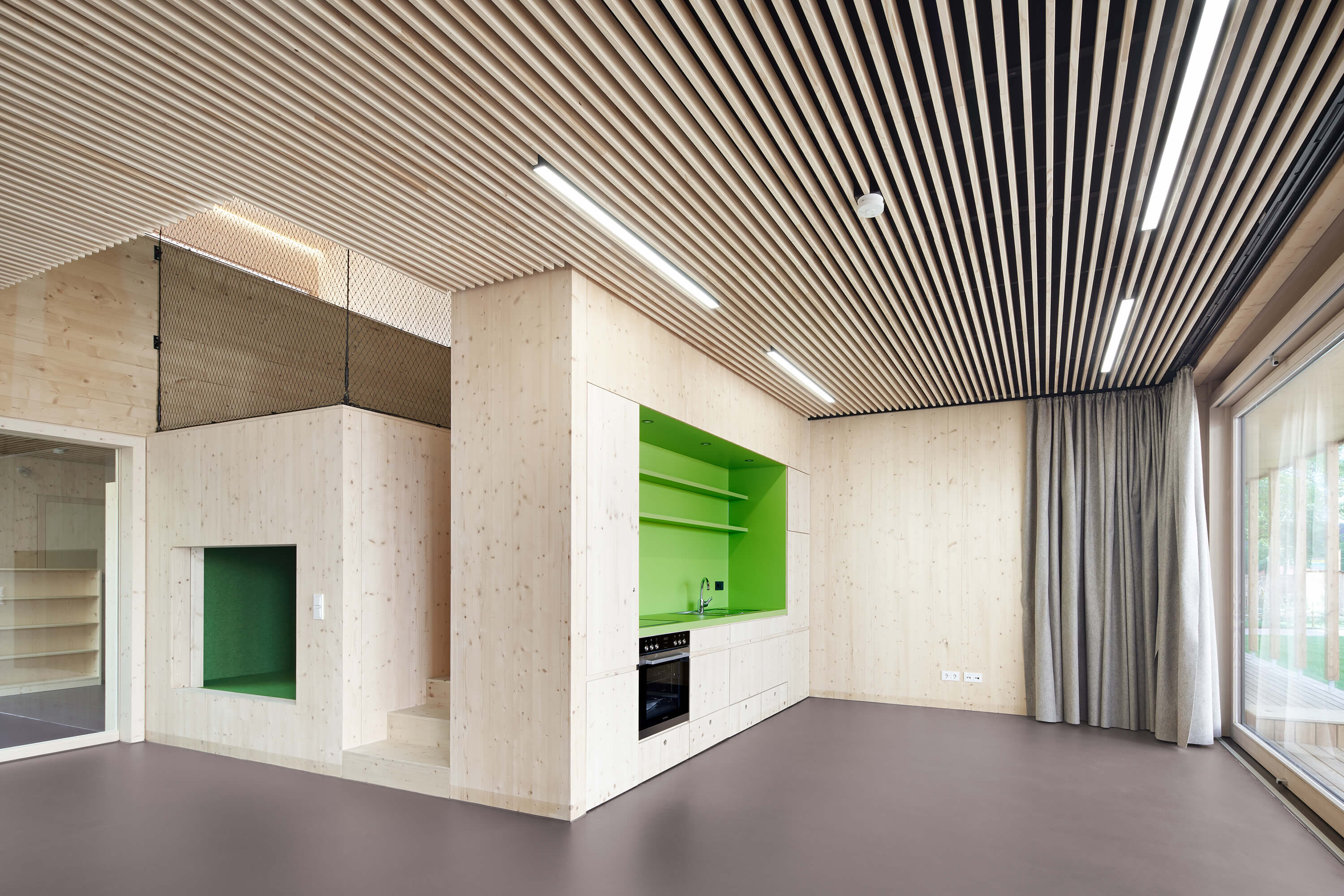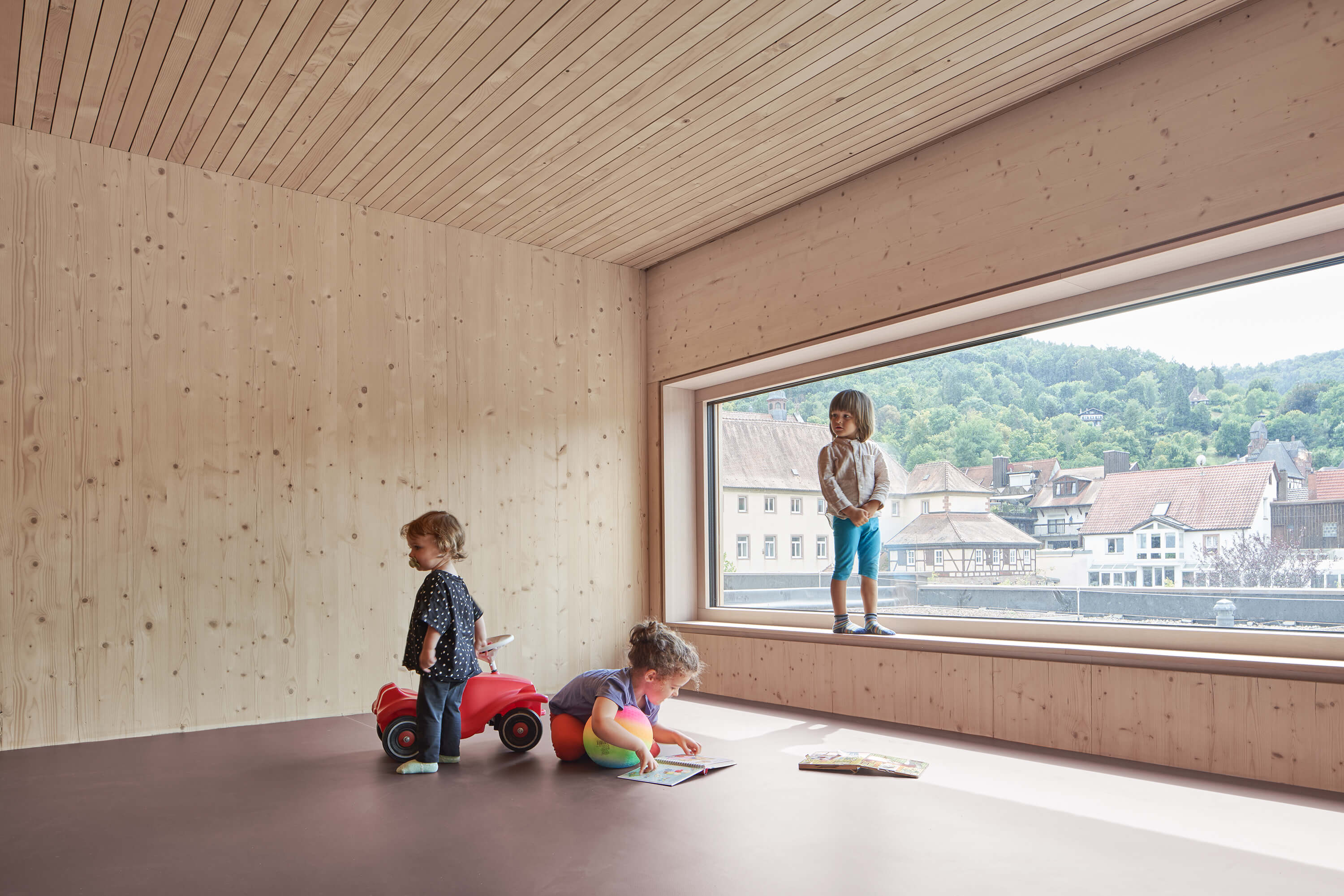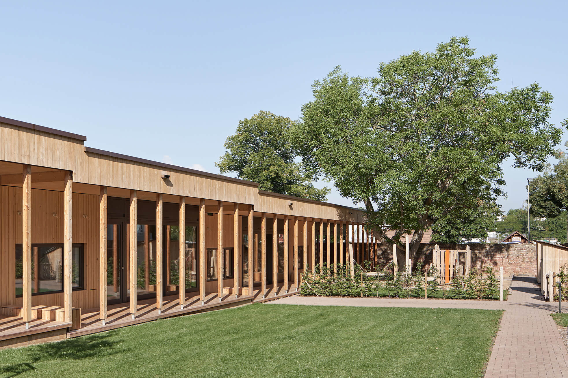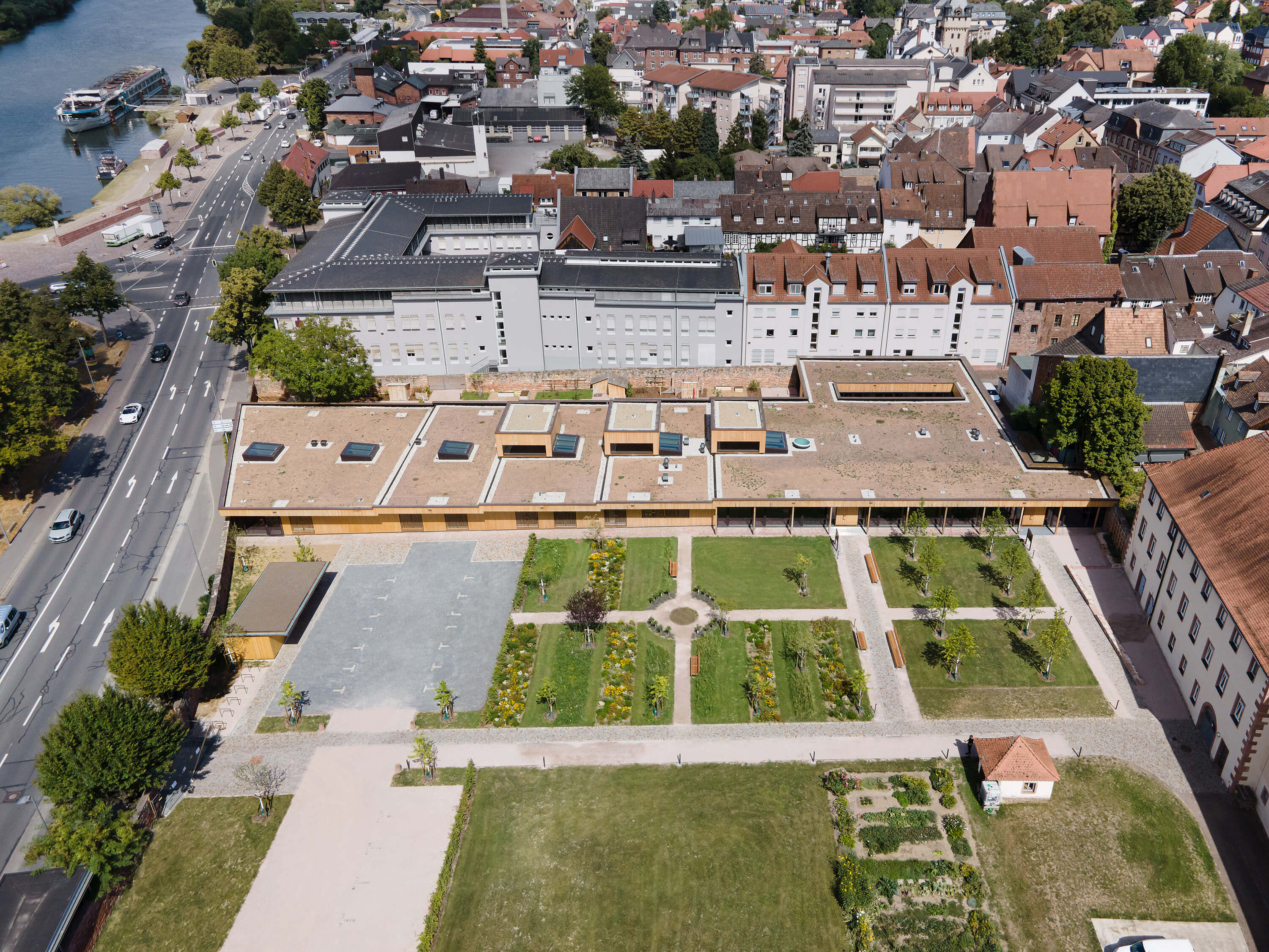Der von mächtigen, roten Sandsteinmauern umfasste Klostergarten des ehemaligen Franziskanerklosters ist eine grüne Oase im historischen Stadtzentrum Miltenbergs. Ein Ort, der auf idealtypische Weise Zentralität und Geborgenheit in sich vereint. Gleichzeitig aber auch ein sensibler Ort mit großer Geschichte, dessen Bebauung mit einer Kindertagesstätte Behutsamkeit und Präzision erfordert. Der Neubau wurde als eingeschossiger Pavillon passgenau zwischen die Klostermauern eingespannt und teilt so den Garten in den Freispielbereich der Kita und einen öffentlich zugänglichen Freiraum, der im Sinne des ehemaligen Klostergartens gestaltet wird. Das Haus wurde als konstruktiver Holzbau mit sichtbar belassenen Oberflächen erstellt. Mit seiner sanft gestaffelten Terrassierung folgt es der Topografie des Geländes. Ihre haptischen und atmosphärischen Qualitäten machen die Kita zu einem Haus zum Anfassen. Jeder Gruppenraum verfügt über ein räumlich integriertes Kletterelement, das sich als Ausguck über die begrünte Dachfläche erhebt. Hier sind für die Kinder Rückzugsorte entstanden, die zum Träumen, Lesen, Beobachten oder Nachdenken inspirieren.