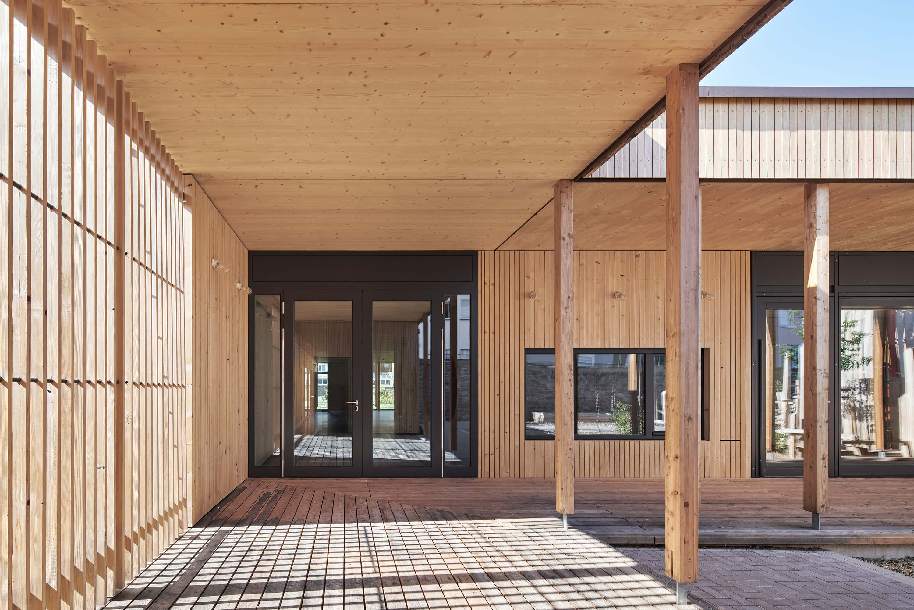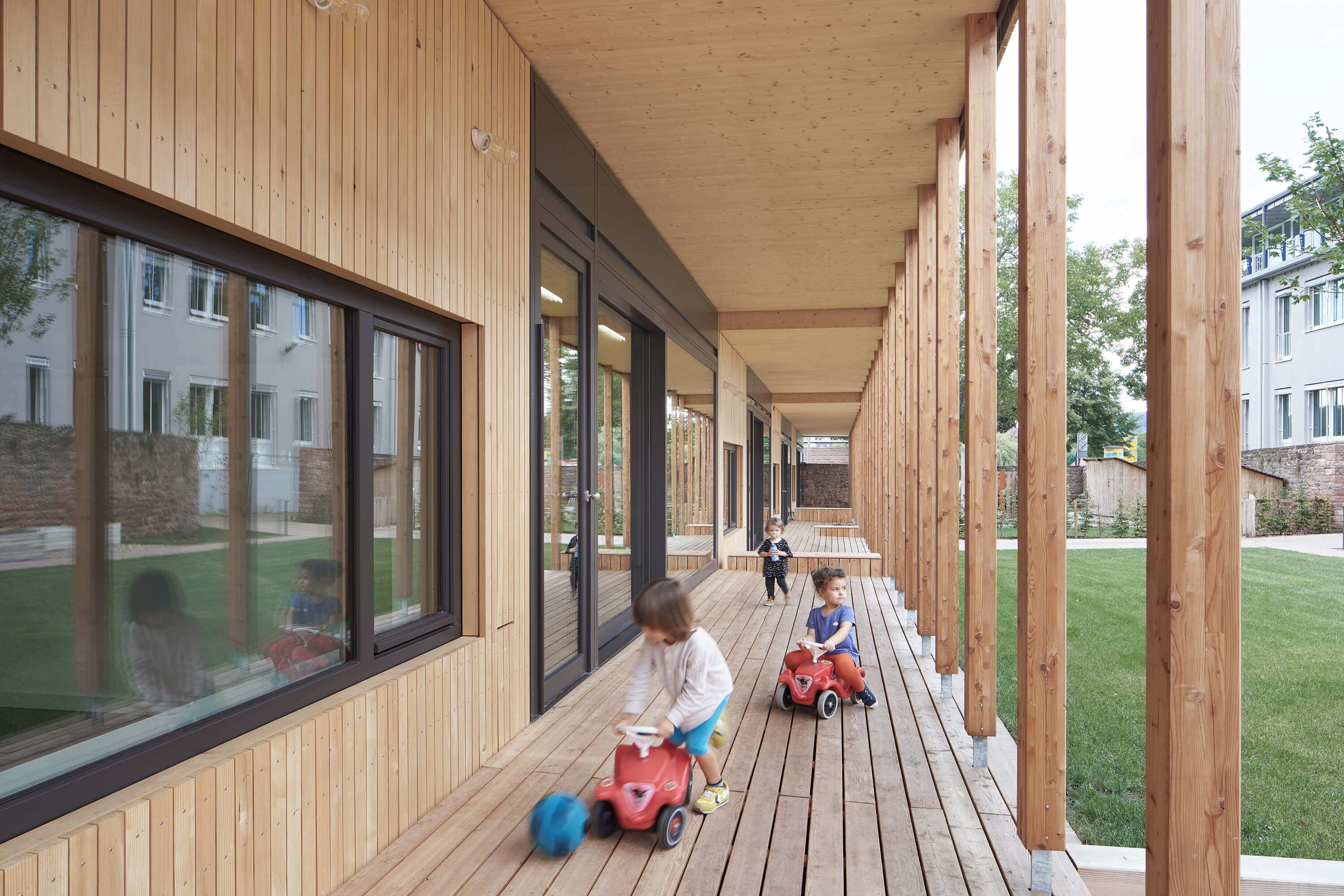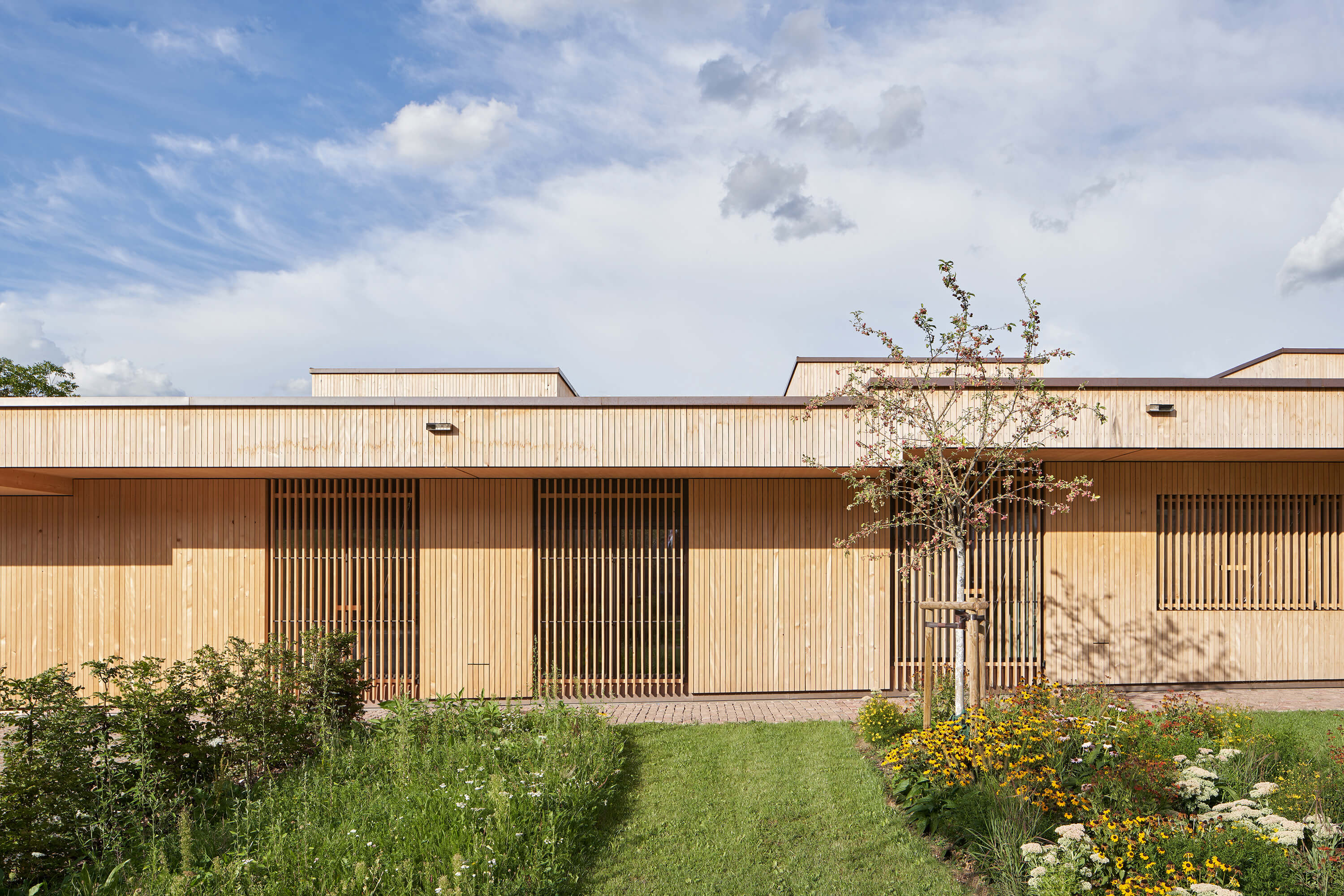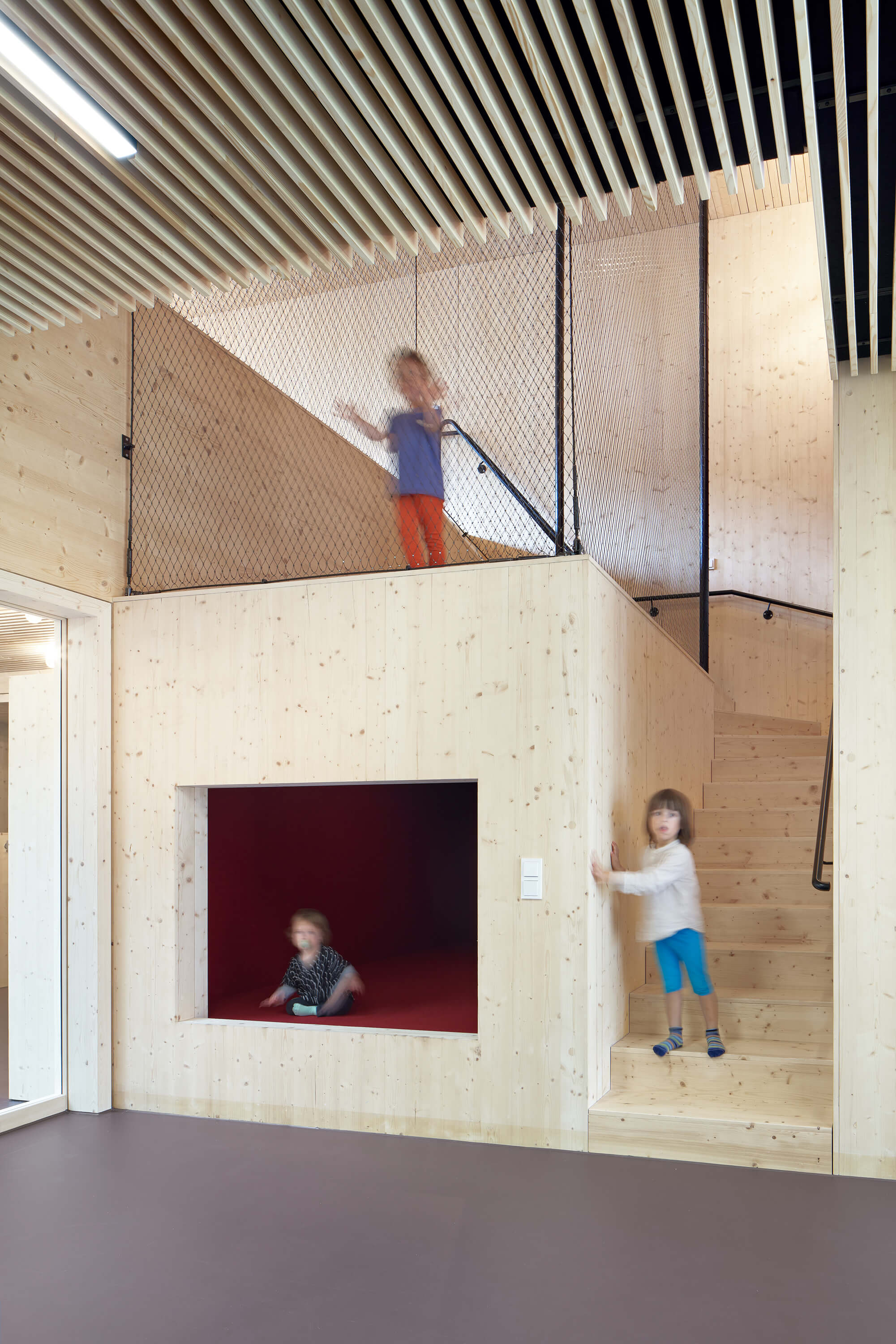 Der von mächtigen, roten Sandsteinmauern umfasste Klostergarten des ehemaligen Franziskanerklosters ist eine grüne Oase im historischen Stadtzentrum Miltenbergs. Ein Ort, der auf idealtypische Weise Zentralität und Geborgenheit in sich vereint. Gleichzeitig aber auch ein sensibler Ort mit großer Geschichte, dessen Bebauung mit einer Kindertagesstätte Behutsamkeit und Präzision erfordert. Der Neubau wurde als eingeschossiger Pavillon passgenau zwischen die Klostermauern eingespannt und teilt so den Garten in den Freispielbereich der Kita und einen öffentlich zugänglichen Freiraum, der im Sinne des ehemaligen Klostergartens gestaltet wird. Das Haus wurde als konstruktiver Holzbau mit sichtbar belassenen Oberflächen erstellt. Mit seiner sanft gestaffelten Terrassierung folgt es der Topografie des Geländes. Ihre haptischen und atmosphärischen Qualitäten machen die Kita zu einem Haus zum Anfassen. Jeder Gruppenraum verfügt über ein räumlich integriertes Kletterelement, das sich als Ausguck über die begrünte Dachfläche erhebt. Hier sind für die Kinder Rückzugsorte entstanden, die zum Träumen, Lesen, Beobachten oder Nachdenken inspirieren.
