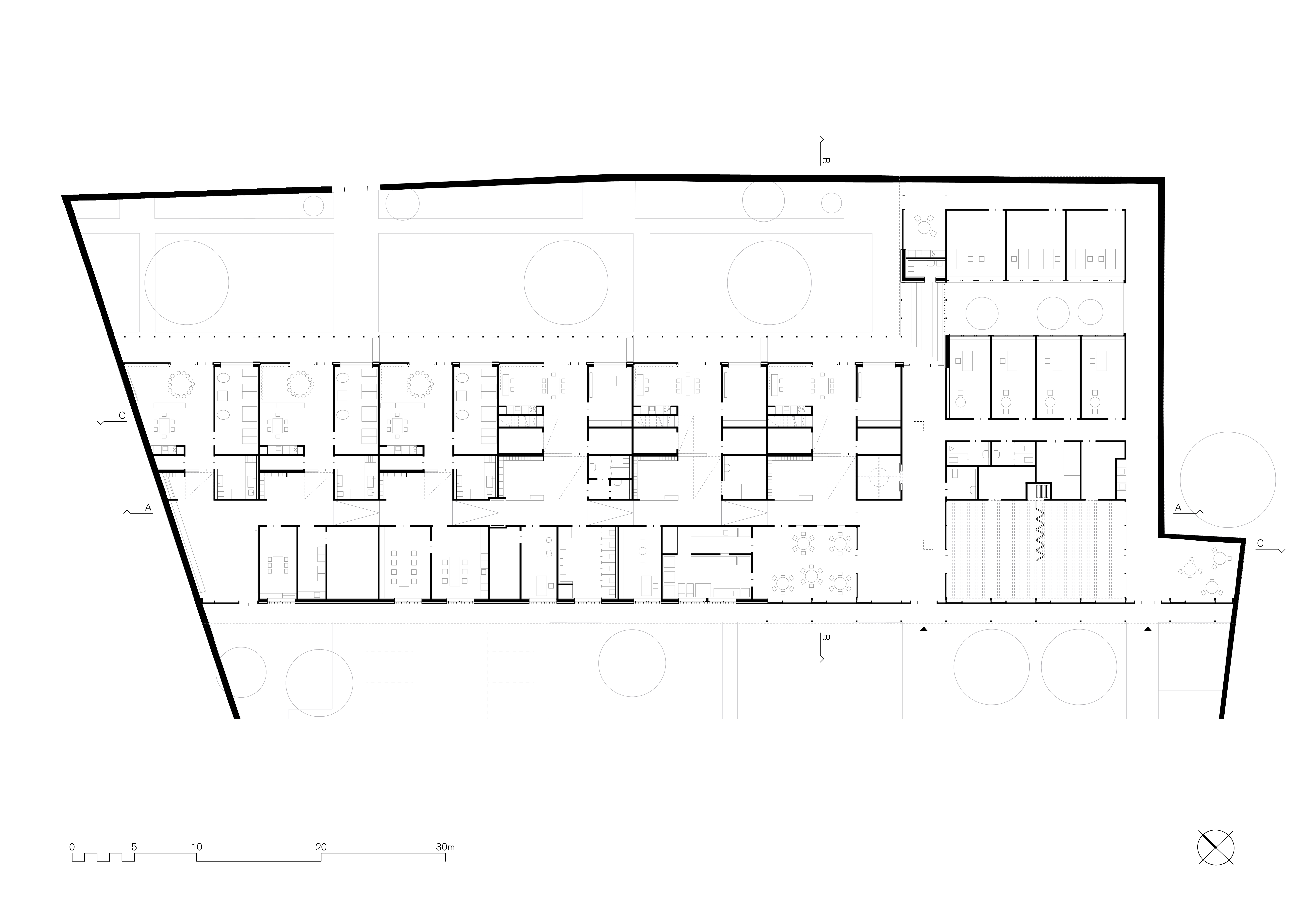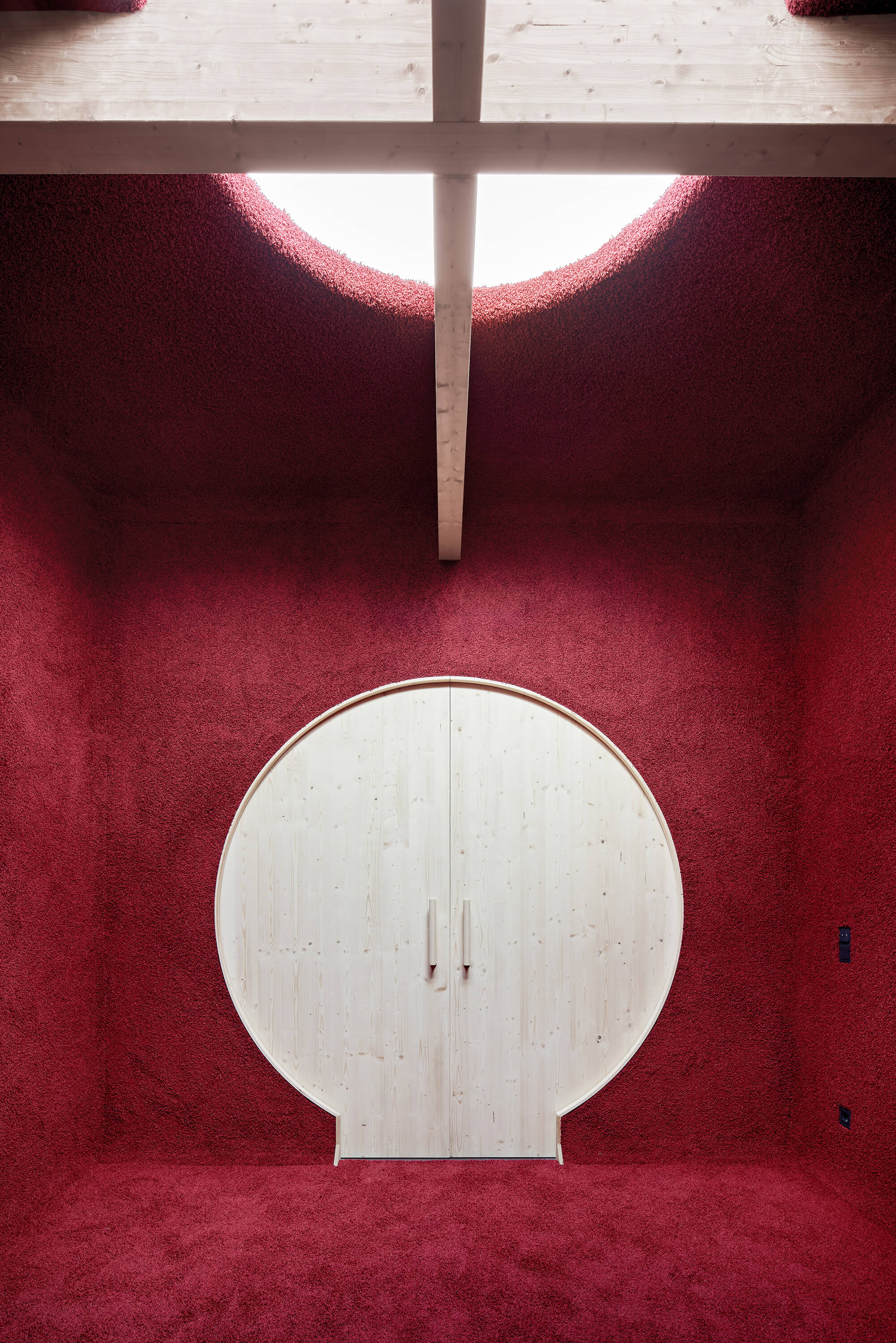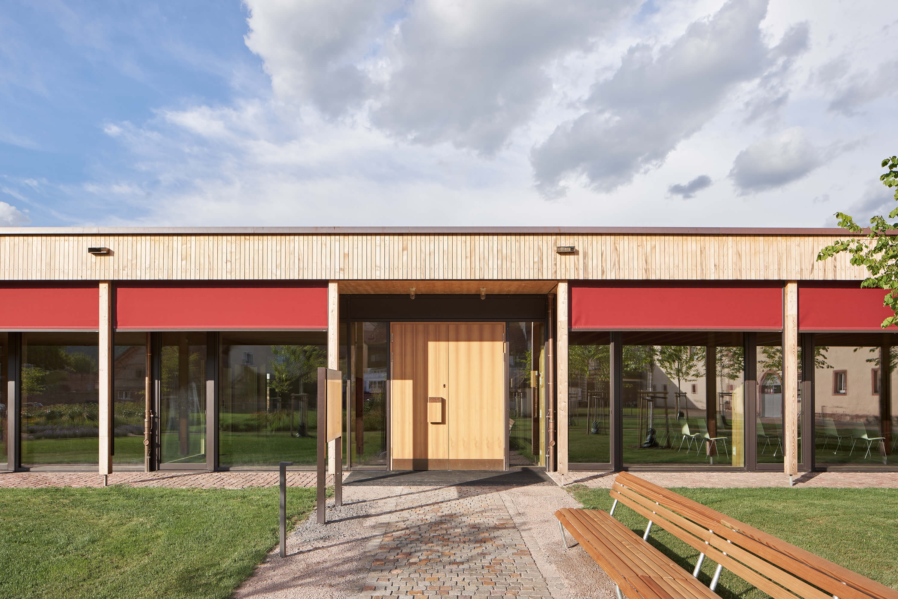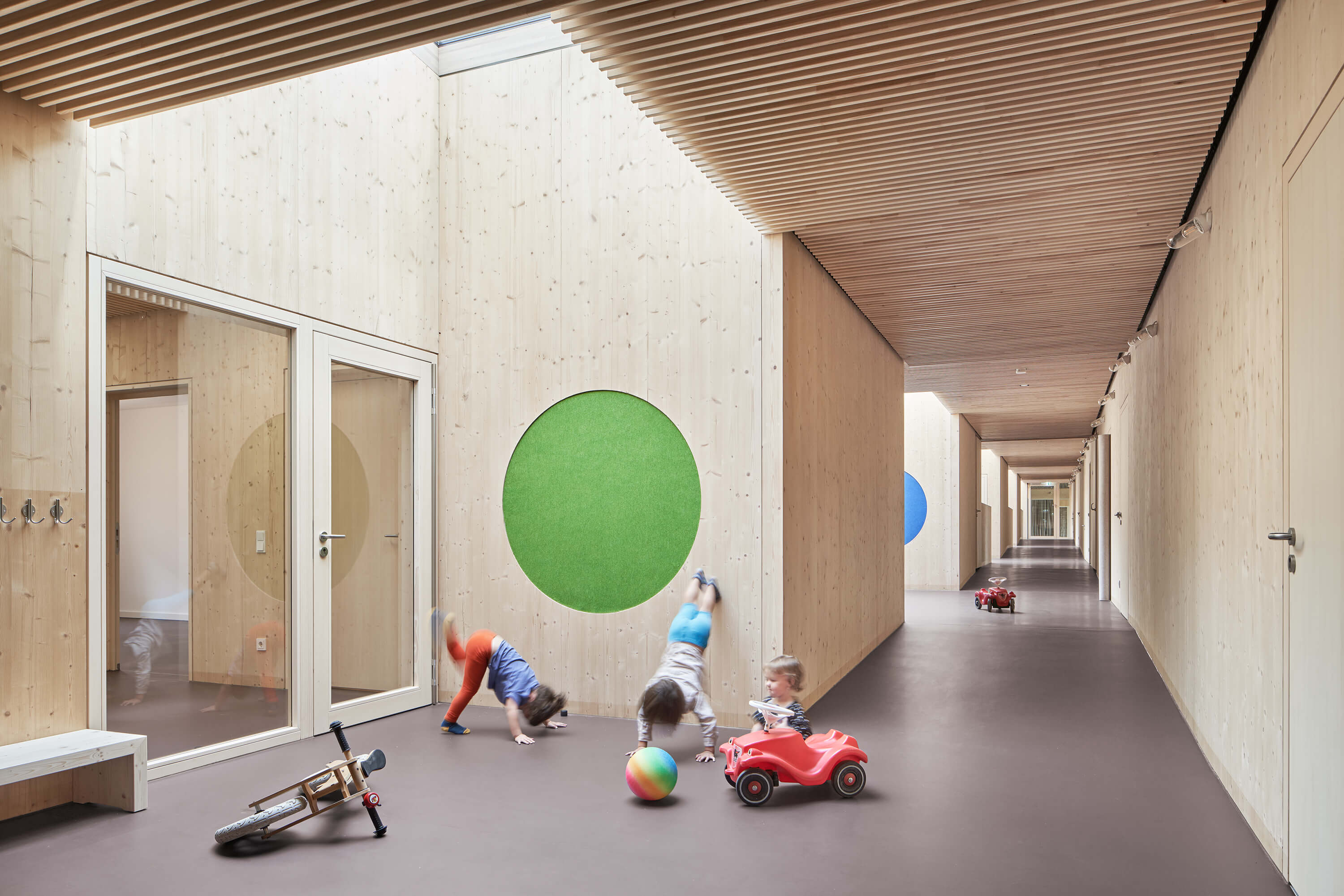 Der von mächtigen, roten Sandsteinmauern umfasste Klostergarten des ehemaligen Franziskanerklosters ist eine grüne Oase im historischen Stadtzentrum Miltenbergs. Ein Ort, der auf idealtypische Weise Zentralität und Geborgenheit in sich vereint. Gleichzeitig aber auch ein sensibler Ort mit großer Geschichte, dessen Bebauung mit einer Kindertagesstätte Behutsamkeit und Präzision erfordert. Der Neubau wurde als eingeschossiger Pavillon passgenau zwischen die Klostermauern eingespannt und teilt so den Garten in den Freispielbereich der Kita und einen öffentlich zugänglichen Freiraum, der im Sinne des ehemaligen Klostergartens gestaltet wird. Das Haus wurde als konstruktiver Holzbau mit sichtbar belassenen Oberflächen erstellt. Mit seiner sanft gestaffelten Terrassierung folgt es der Topografie des Geländes. Ihre haptischen und atmosphärischen Qualitäten machen die Kita zu einem Haus zum Anfassen. Jeder Gruppenraum verfügt über ein räumlich integriertes Kletterelement, das sich als Ausguck über die begrünte Dachfläche erhebt. Hier sind für die Kinder Rückzugsorte entstanden, die zum Träumen, Lesen, Beobachten oder Nachdenken inspirieren.
