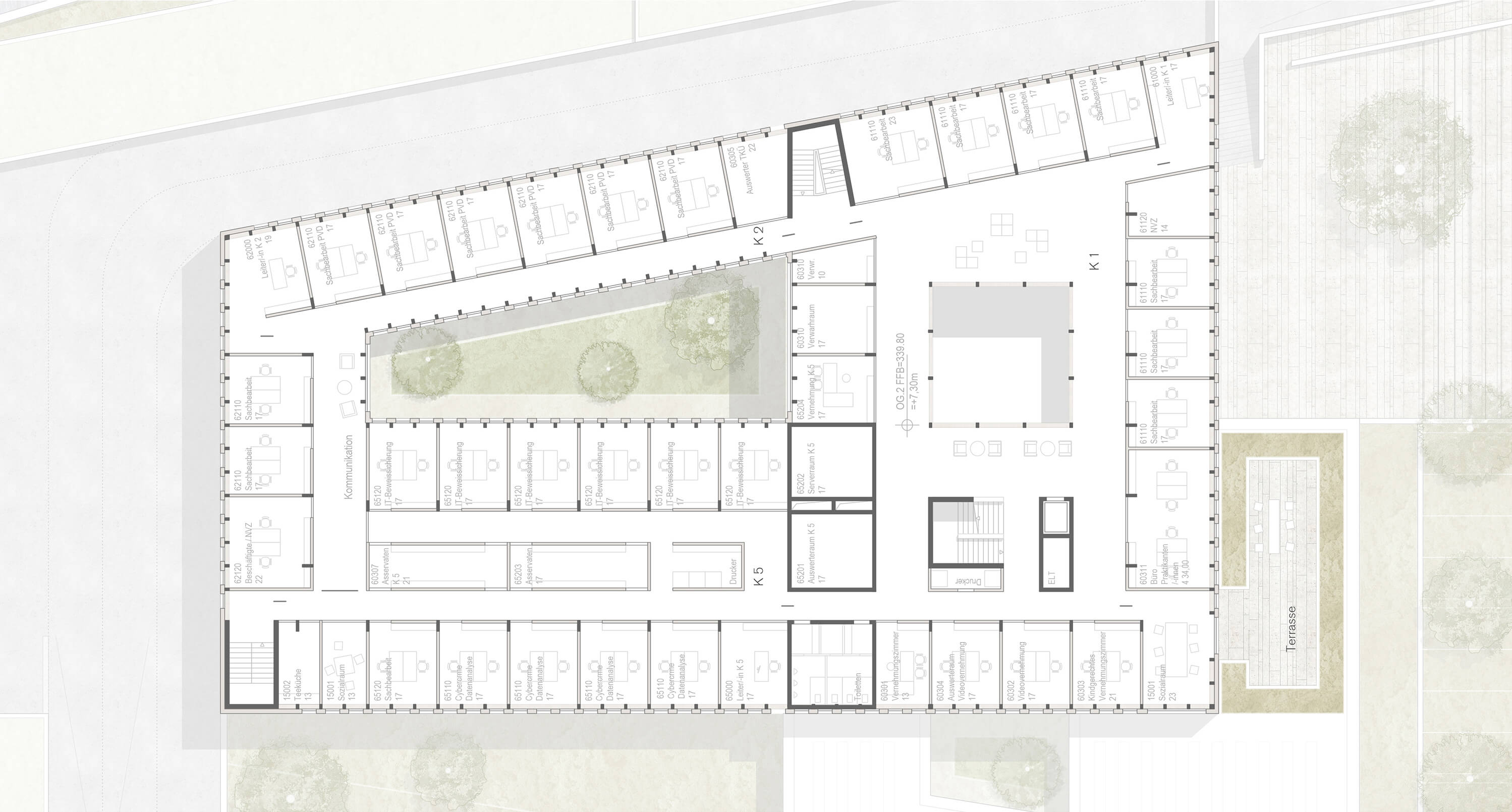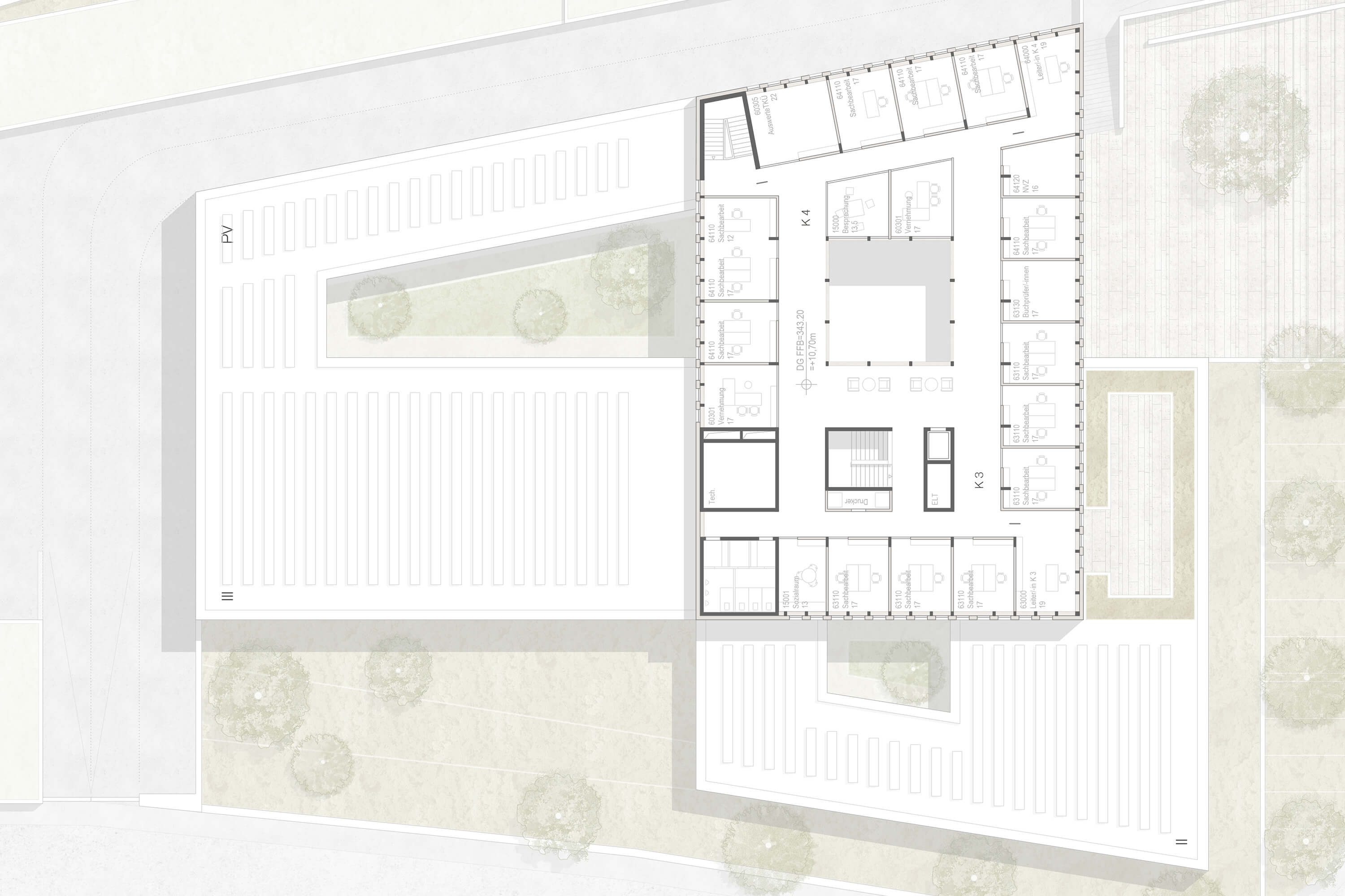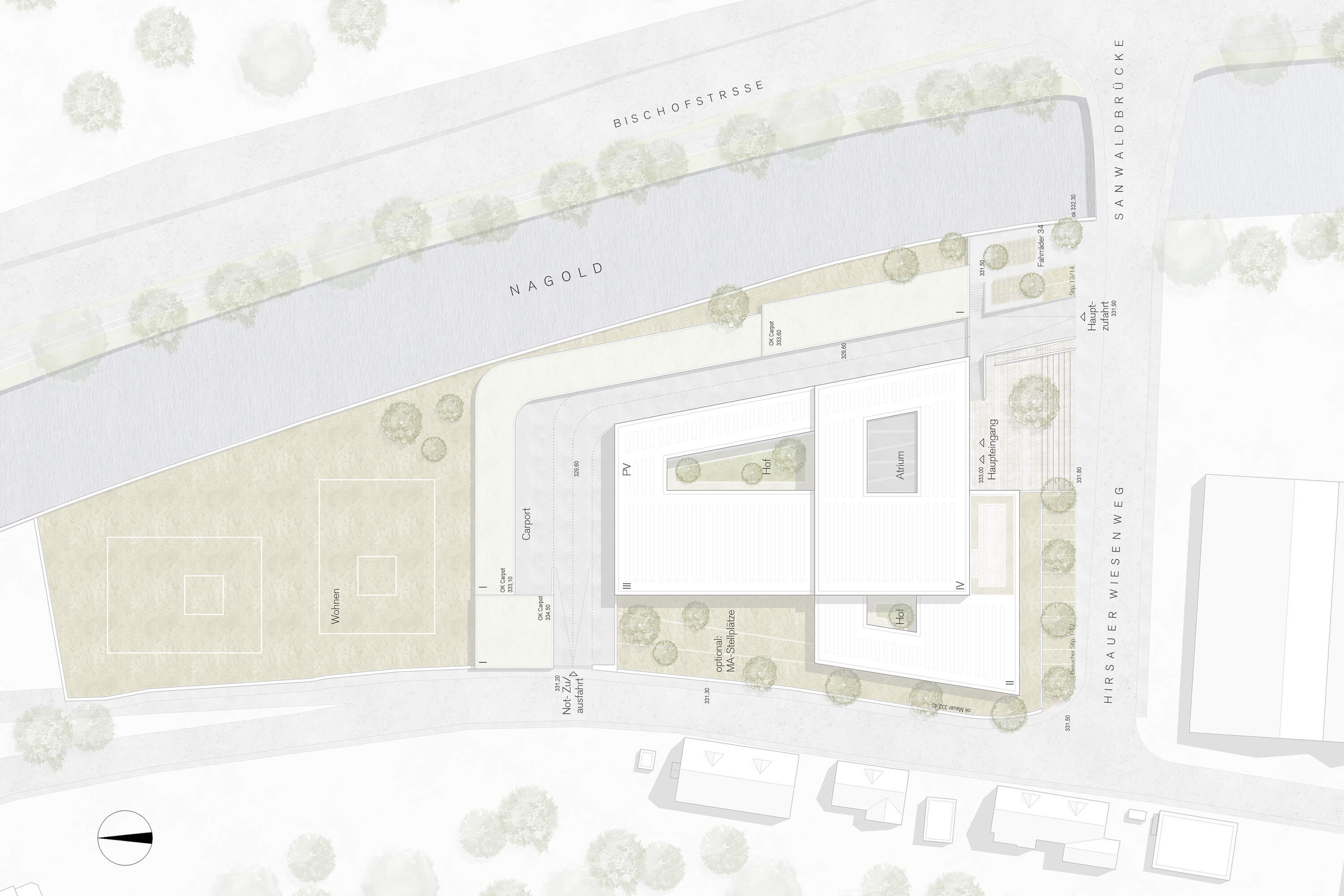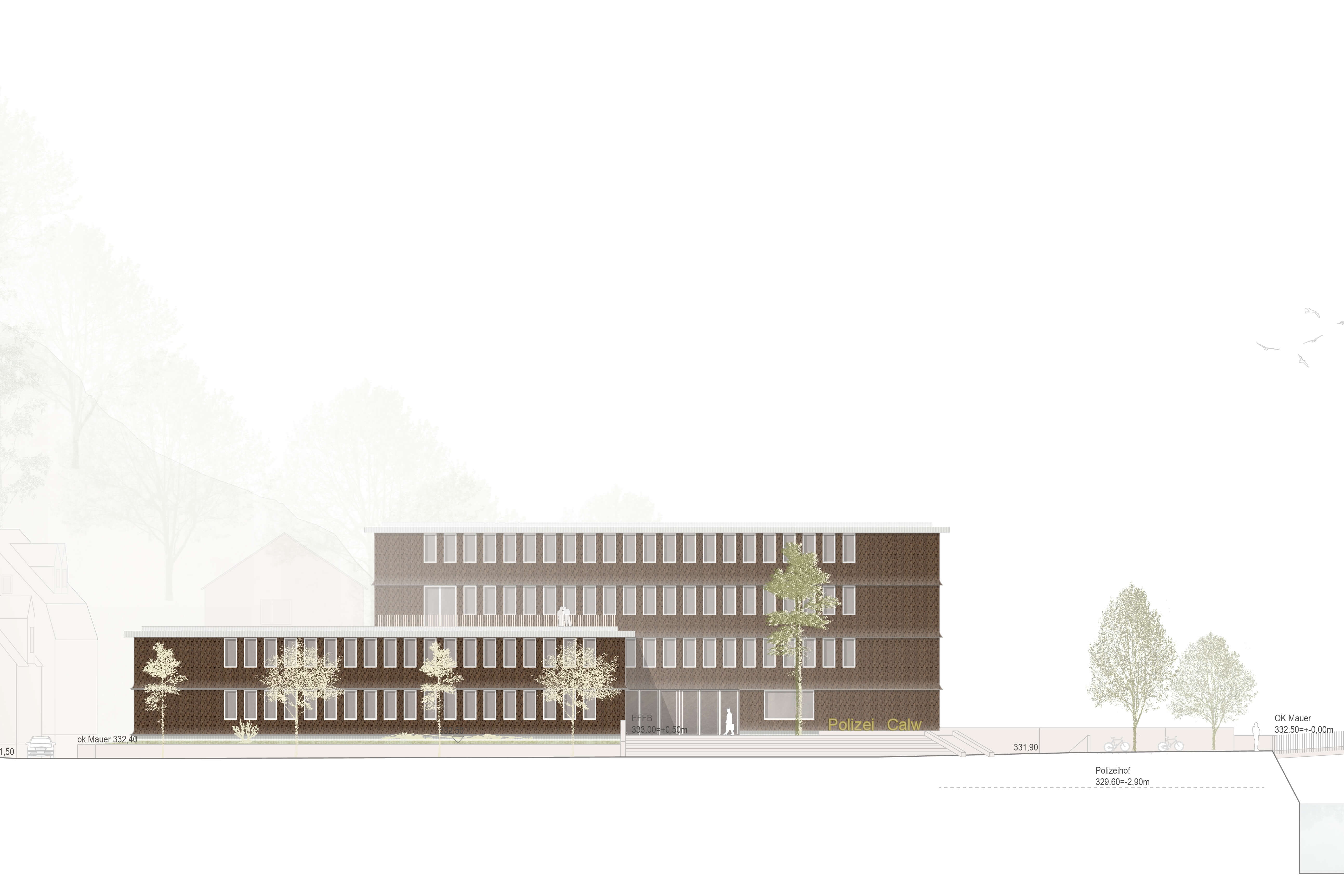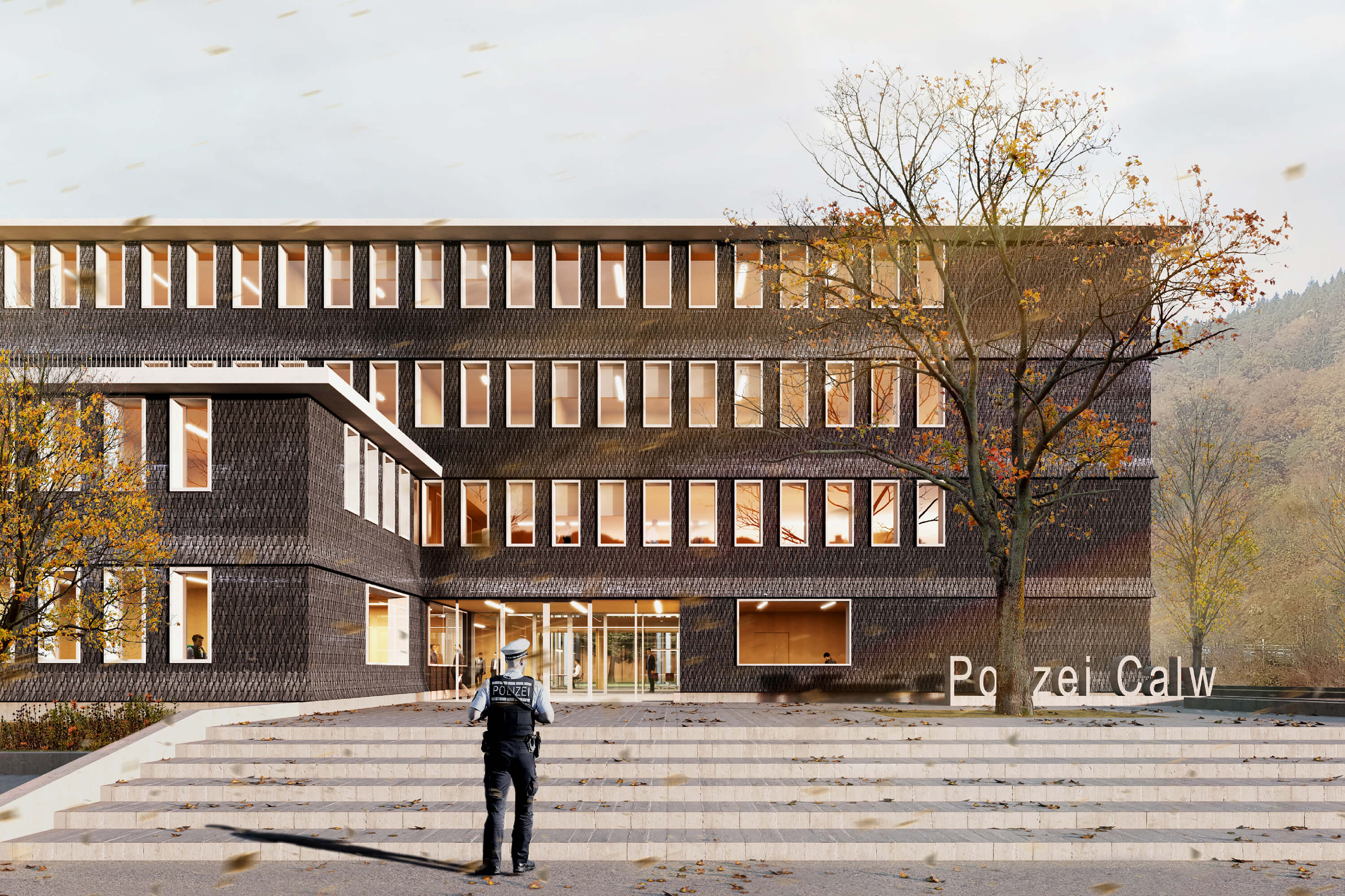 Der Neubau am Hirsauer Wiesenweg vermag durch seine exponierte Lage die nördliche Stadteinfahrt Calws maßgeblich aufzuwerten. Über die Nagold hinweg ist das markante Gebäude von der Bischofstraße aus nicht zu übersehen, durch die Sannwaldbrücke ist es zudem auf kurzem Wege erschlossen. Das Polizeigebäude gliedert sich in drei Flügel mit differenzierter Geschosszahl und erzeugt so eine dem Ort und der Funktion angemessene Maßstäblichkeit. Der viergeschossige Kopfbau markiert die platzartige Zugangssituation auf der Südseite der Parzelle. Der Vorplatz wird auf seiner Westseite von einem zweigeschossigen Bauteil flankiert, das auf die kleinteiligere Nachbarbebauung am Hirsauer Wiesenweg antwortet. Nach Norden hin begleitet ein dreigeschossiger Flügel den Lauf der Nagold, der einen Innenhof umschließt. Die äußere Geometrie des Baukörpers orientiert sich an den bestehenden Straßen und dem Flusslauf der Nagold, so dass der Neubau sehr selbstverständlich mit seinem Bauplatz verwächst. Nach Norden und Osten hin wird das Haus von einem eingeschossigen Baukörper umfasst, das die Stellplätze der Dienstfahrzeuge aufnimmt und gleichzeitig Teil der Einfriedung des Polizeihofes ist. Mit der Materialität der dunklen Holzschindeln, polygonal verlegt, wird ein Bezug zu örtlichen Traditionen und bewährter Handwerklichkeit aufgebaut. Im Zusammenwirken mit der Reihung der weiß lackierten Fenster entsteht ein Bild, das Vertrautheit ausstrahlt.