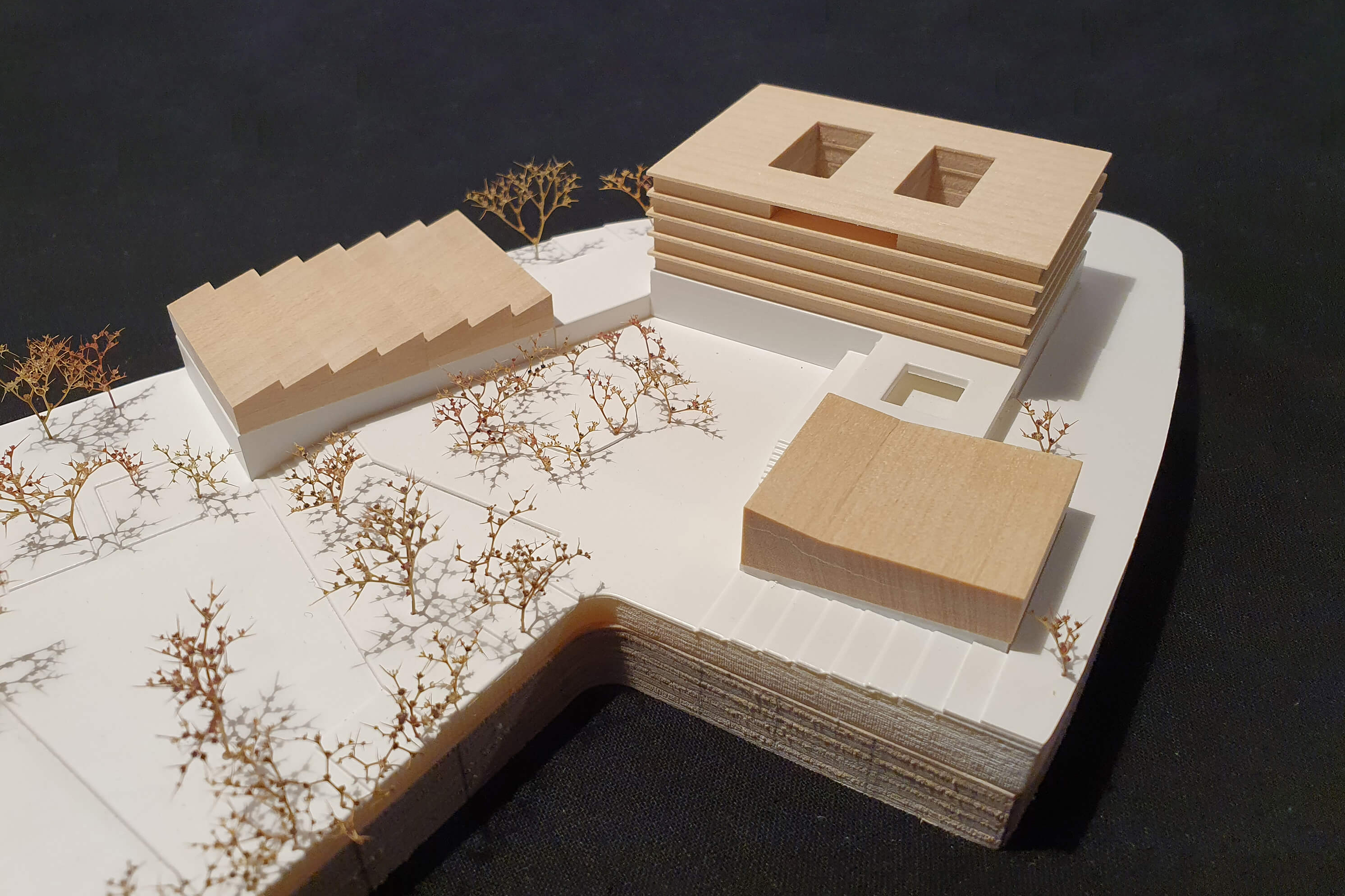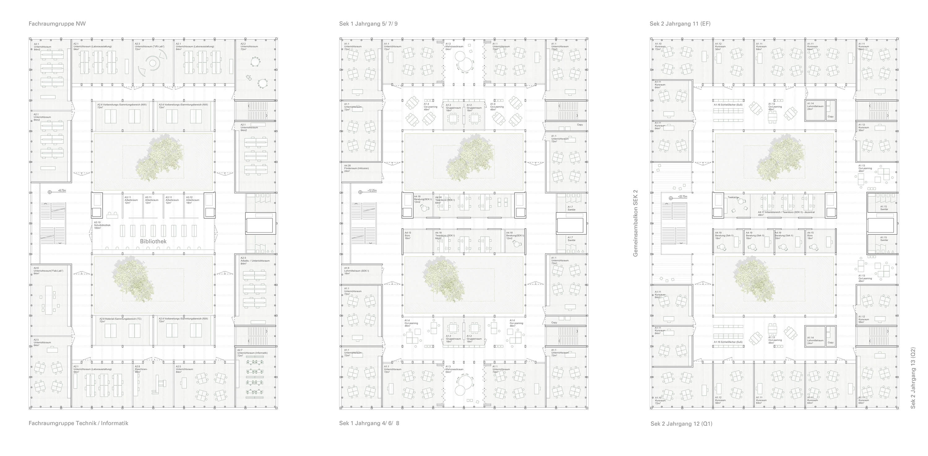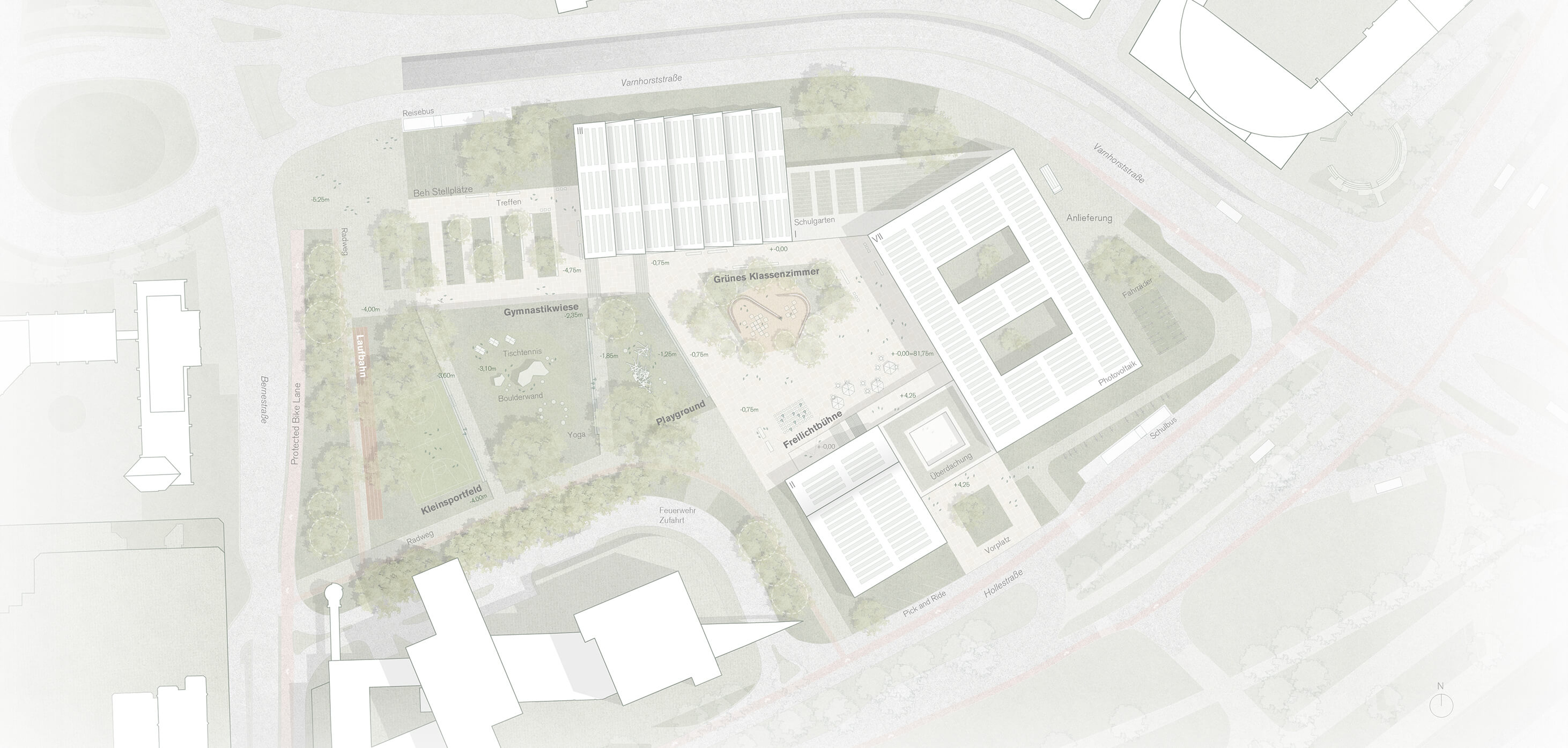 Eine Komposition aus drei Baukörpern in Holzbauweise auf einem gemeinsamen und die Bauteile verbindenden Sichtbetonsockel wird so auf dem Grundstück platziert, dass einerseits der aus städtebaulichen und Lärmschutzgründen wünschenswerte Blockschluss zur Varnhorststraße hin gelingt und andererseits durch die trotz des „Blockrands“ vorhandene Betonung der Einzelbaukörper der solitäre Charakter eines Schulgebäudes gewahrt wird und die Schule somit als solche im Stadtraum wahrnehmbar bleibt.