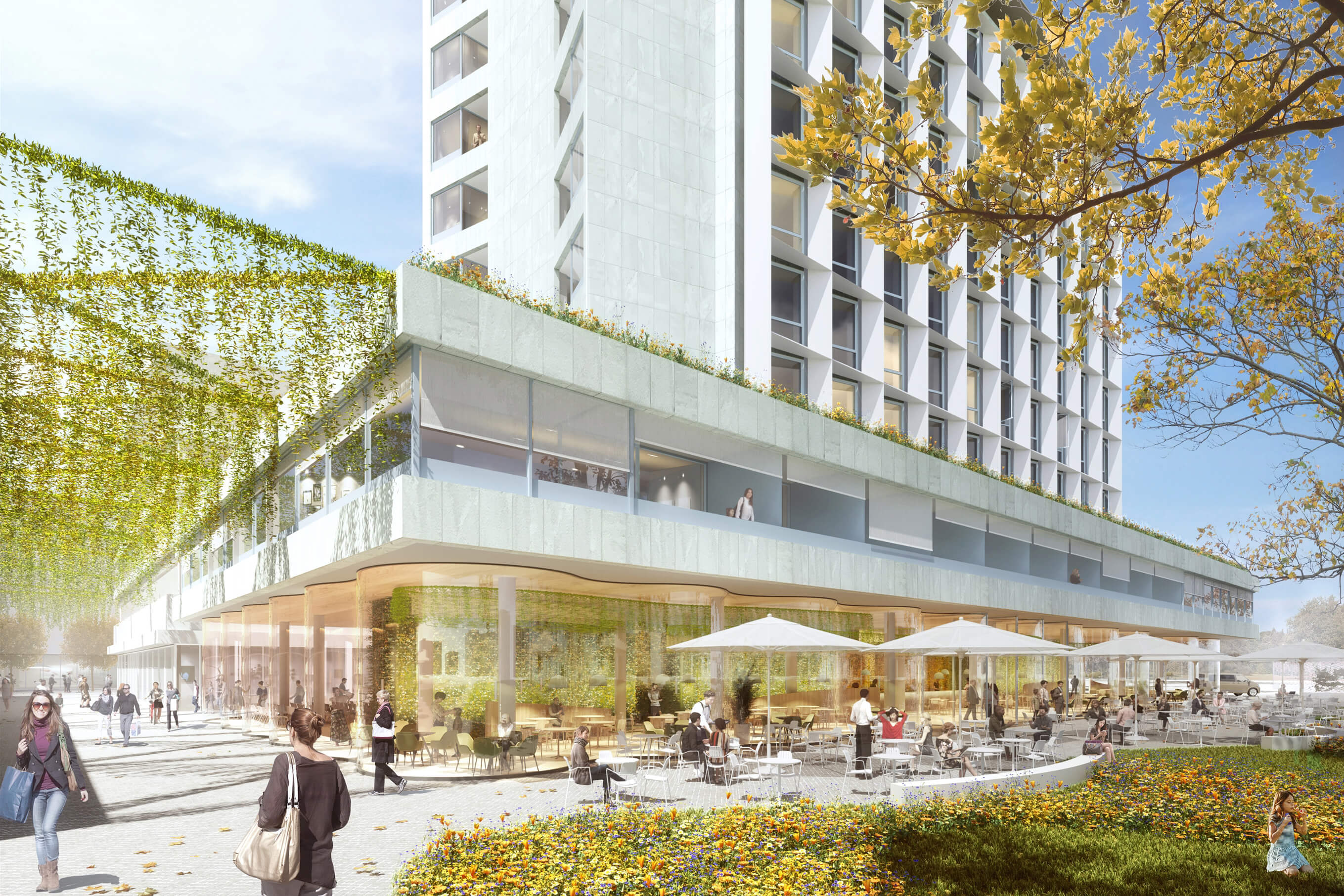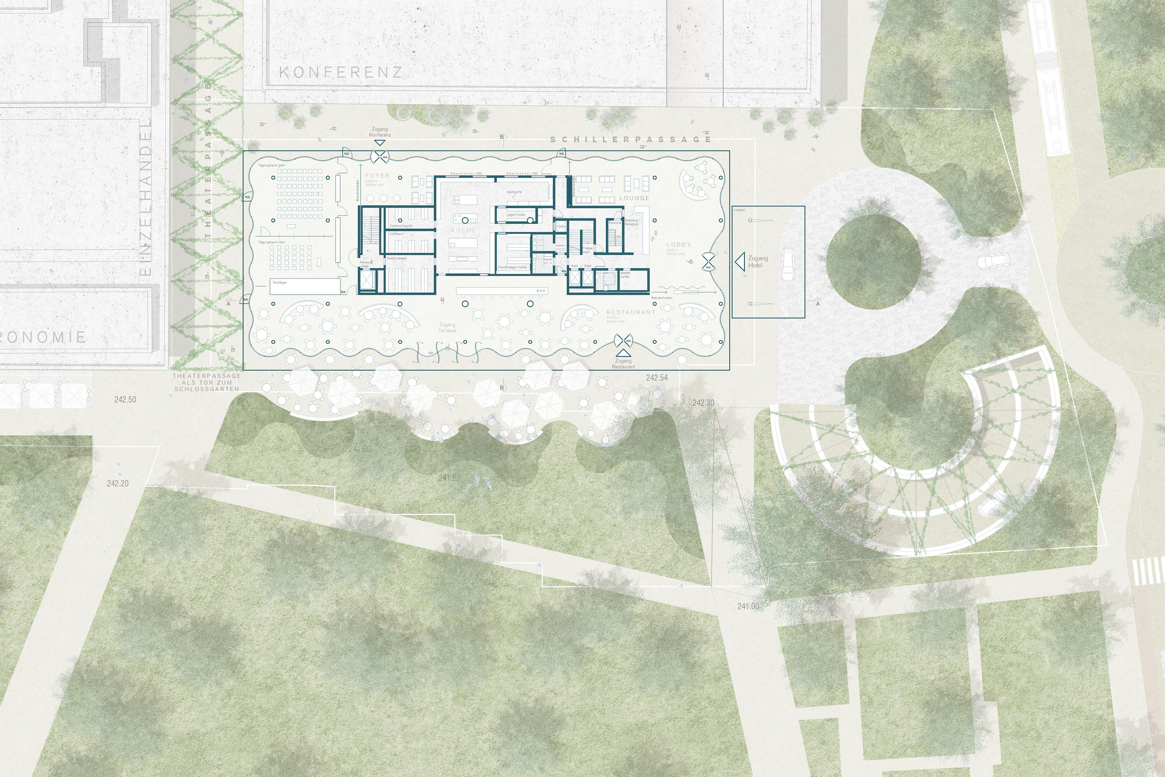 Das Hotel am Schlossgarten ist ein bemerkenswertes Haus, welches mit seiner Leichtigkeit und Eleganz beispielhaft für die Architektur der 1960er Jahre steht. Im Zuge seiner nunmehr 60-jährigen Nutzungsdauer wurden an dem Gebäude jedoch einige unsensible bauliche Eingriffe vorgenommen, die den ursprünglichen Entwurfsgedanken merklich geschwächt haben. Insbesondere in der Sockelzone ist von der einstigen Transparenz und Durchlässigkeit nichts mehr zu spüren. Als gestalterisches Leitbild unseres Entwurfs dient uns die ursprüngliche Planung des Architekten Hans Paul Schmohl. In einem entwurflichen Transferprozess wollen wir versuchen, dessen konzeptionelle Gedanken in die heutige Zeit zu übertragen. Bei den zahlreichen konstruktiven und rationalen Fragestellungen, die es bei der Revitalisierung des Hotels zu lösen gibt, ist dieses inspirierende Leitbild stets ein wichtiges Entscheidungskriterium. Neben der technisch-baulichen Ertüchtigung des Hauses ist es unser Ziel, dem Haus seinen ursprünglichen Charme zurückzugeben, so dass es auch künftig den prominenten Ort zwischen Schlossgarten, Bahnhof und Königstraße mit seiner Eleganz prägen kann.
