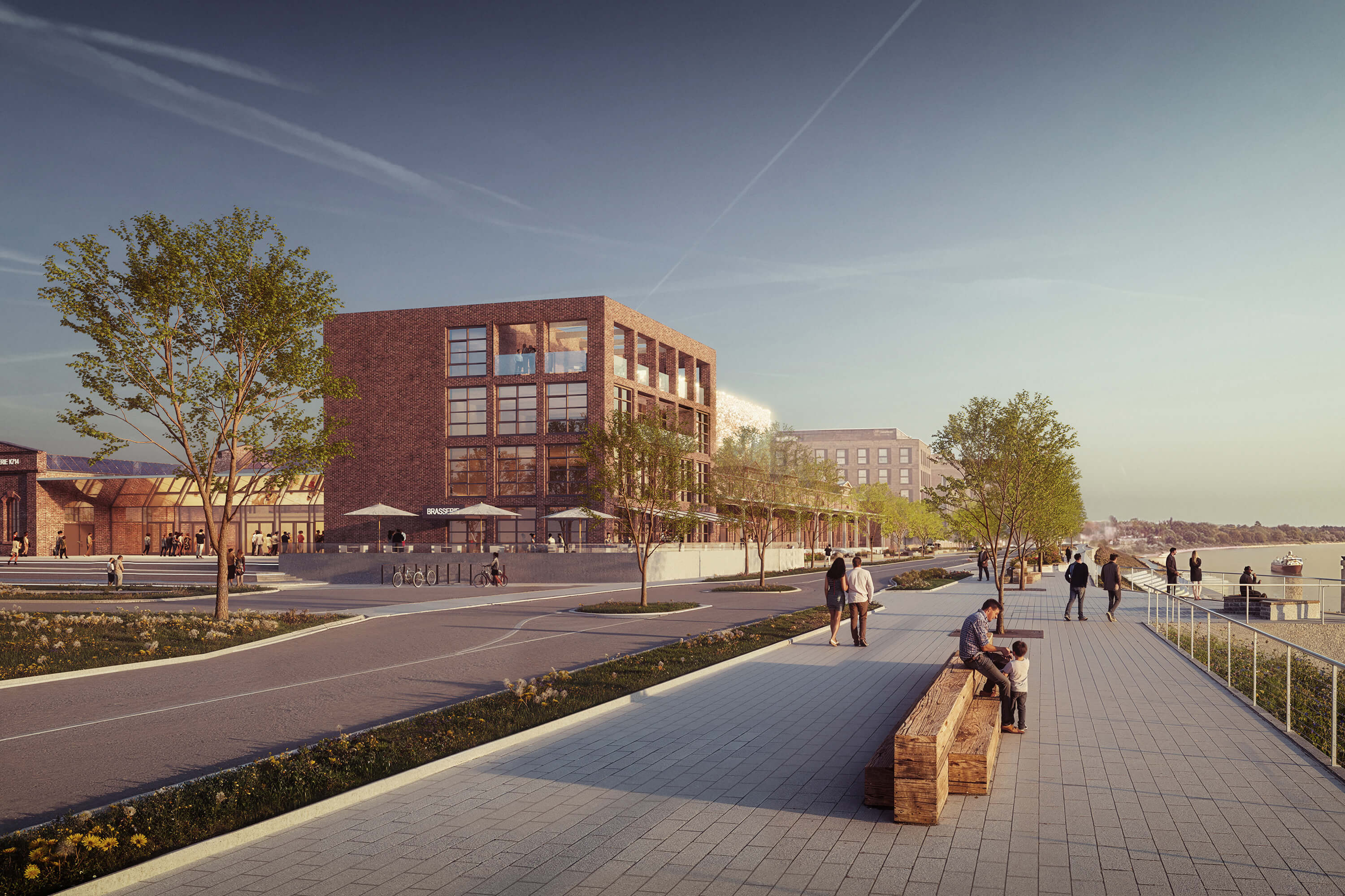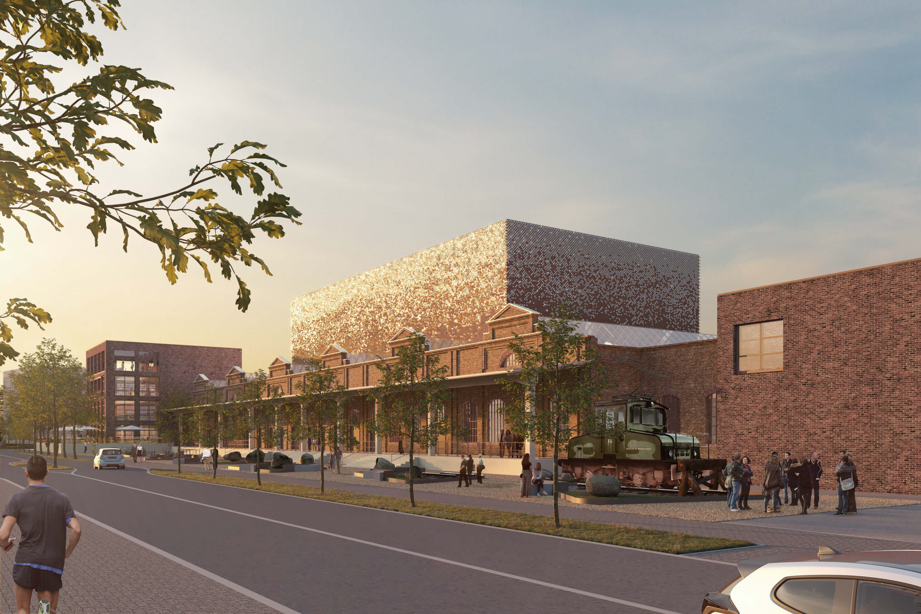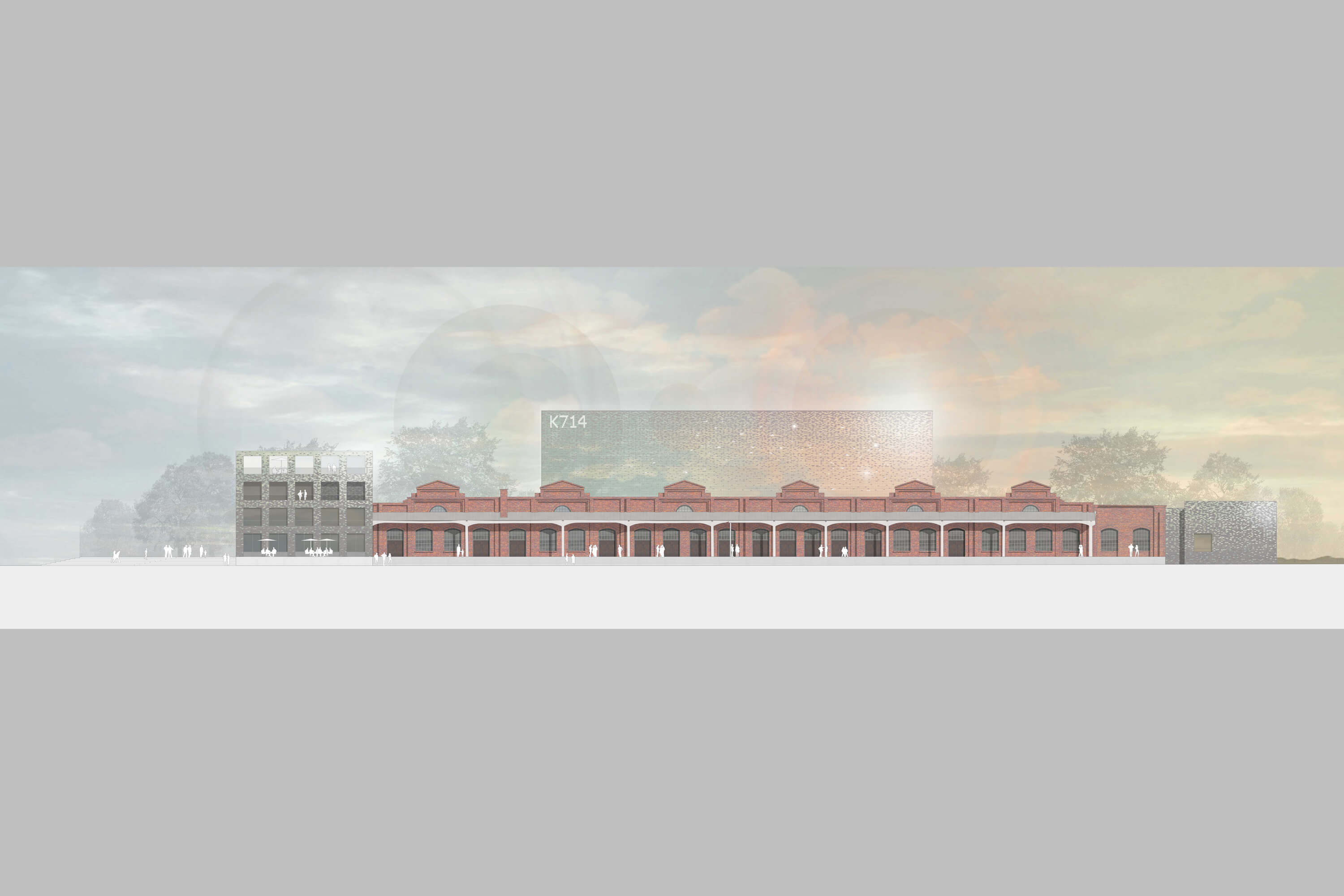 Die historische Fassabfüllhalle definiert mit ihrer elaborierten Ziegelfassade und dem markanten Tragwerk einen identitätsstiftenden Rahmen für die Schaffung eines unverwechselbaren Veranstaltungsortes. Die Kulturraffinerie befindet sich am nördlichen Rand der Stadt Monheim und wirkt von der vorbeiführenden Rheinpromenade aus als weithin sichtbare Landmarke. Direkt am Rhein gelegen, bietet die Raffinerie auch einen wunderbaren Blick über das Wasser - beste Voraussetzungen also für einen Kulturort von überregionaler Bedeutung. In unserem Entwurf erhebt sich über der ausdrucksvollen Silhouette des sechsschiffigen Ziegelbaus leicht zurückgesetzt ein entmaterialisierter Kubus, der zum sichtbaren Zeichen der neuen Funktion des Hauses wird. Tagsüber recht unscheinbar, beginnt der hinterleuchtete Kubus mit einbrechender Dunkelheit zu glimmen, seine Fassade, die multimedial bespielt werden kann, trägt Informationen über die Veranstaltungen in den Stadtraum.