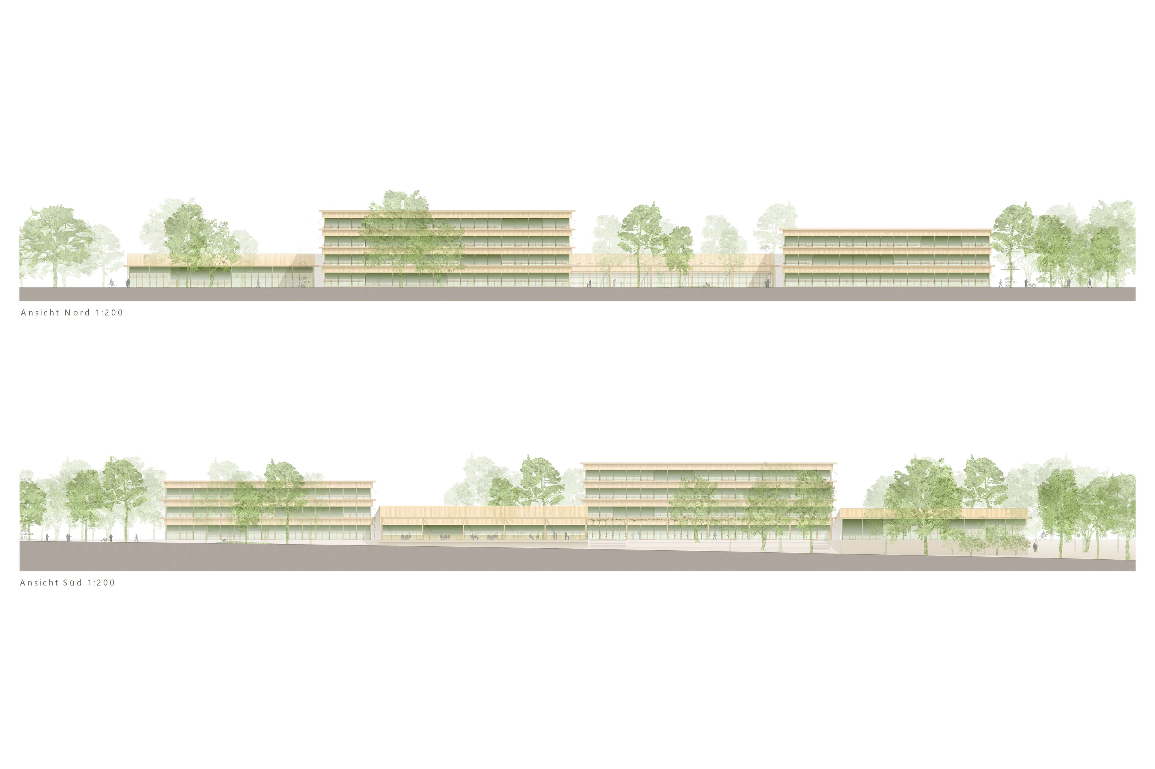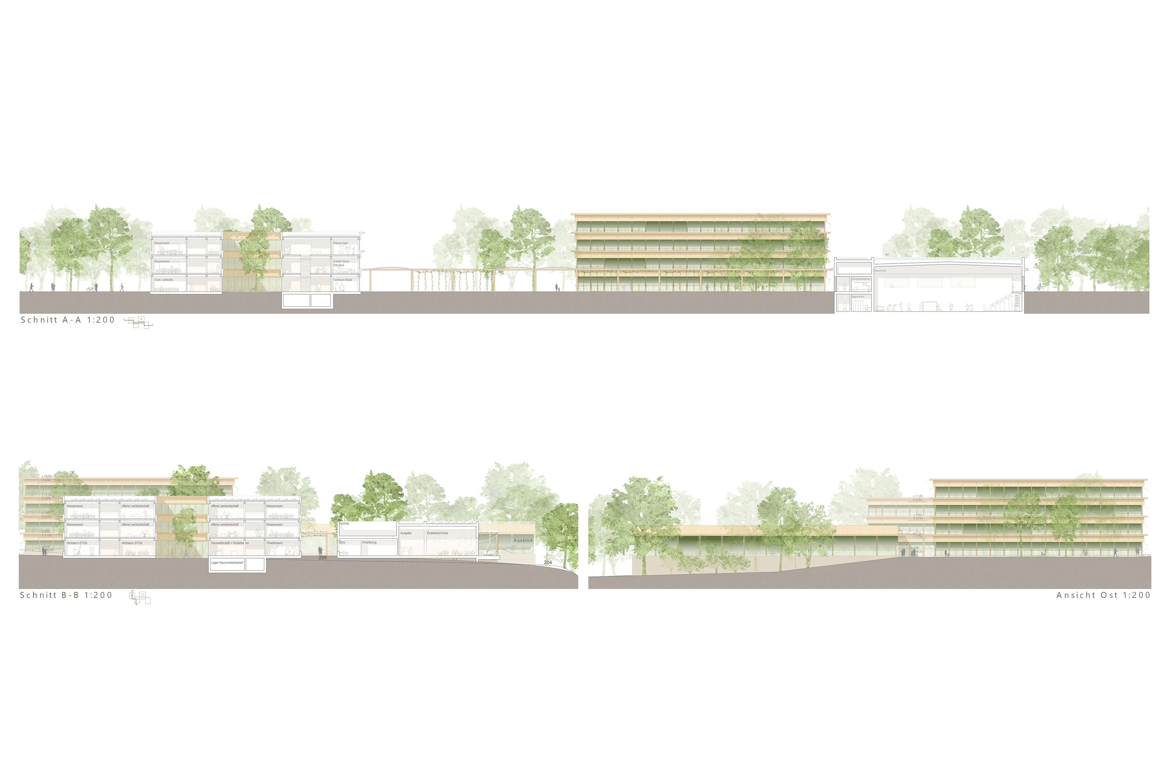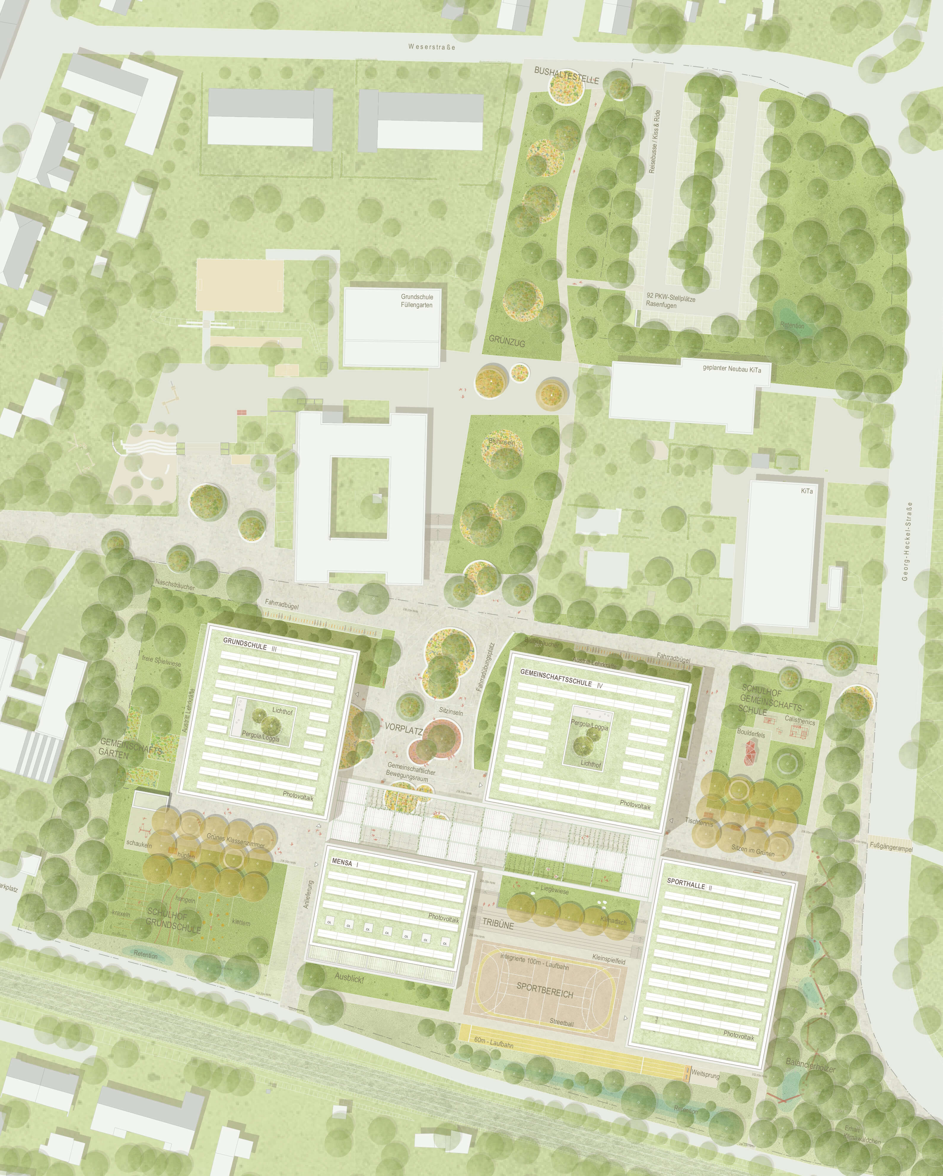 Vier in ihrer Höhe gestaffelte Baukörper zonieren das sanft nach Süden abfallende Baugrundstück im Westen von Saarbrücken. Die Neubauten werden durch eine schützende Pergola miteinander verbunden, von der aus alle vier Häuser erschlossen werden. So ergibt sich eine klare Zonierung der Freiräume und eine einfache Orientierung innerhalb des neuen Bildungscampus. Die beiden Schulhäuser besetzen den ruhigeren Nordrand des Areals und definieren gemeinsam einen adressbildenden Vorplatz. Gemeinsam mit der eingeschossigen Mensa bildet dieser Vorplatz den Abschluss des von Norden ankommenden Grünzugs. Die Frischluftschneise wird über den flachen Mensabau hinweggeführt. Die Sporthalle besetzt die südöstliche Ecke des Grundstücks und begrenzt den Campus zur Georg-Heckel-Straße hin. Für die Nutzung der Halle durch Vereine ist so eine gute Auffindbarkeit gewährleistet. Die gegeneinander versetzten Baukörper untergliedern das Grundstück in gut proportionierte Freibereiche, denen jeweils eine eindeutige Funktion zugewiesen wird.