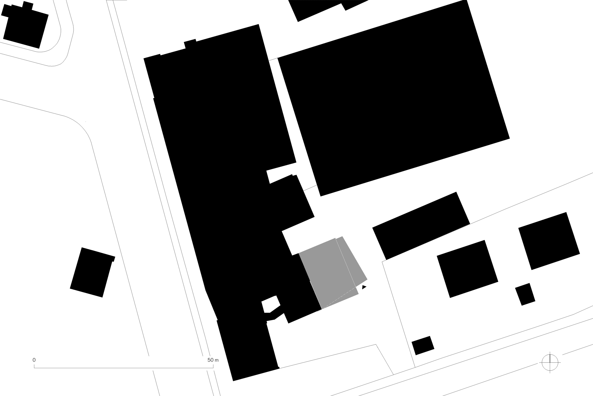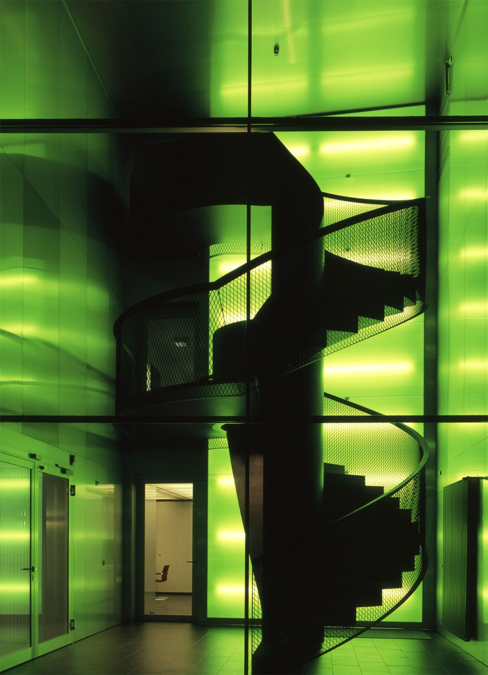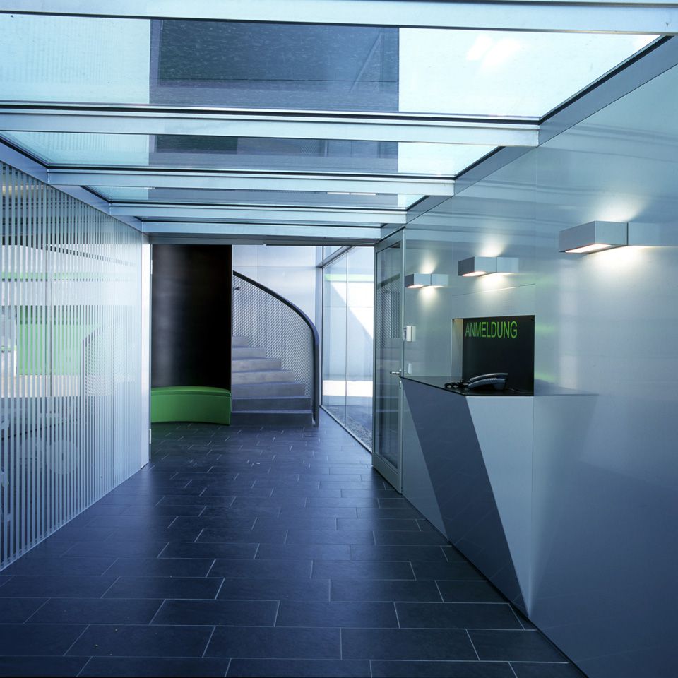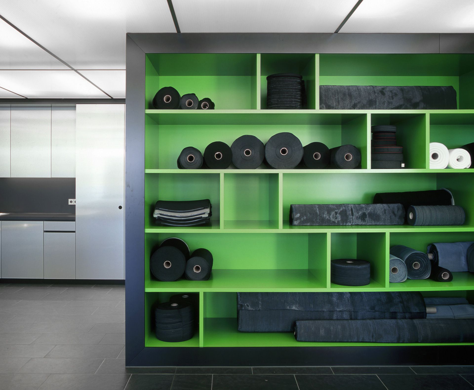 In einem ehemaligen Wohngebäude aus den 1940er Jahren ist die Verwaltung einer mittelständischen Gurtweberei untergebracht. Da das Familienunternehmen Rathgeber in zunehmendem Maße mit internationalen Möbeldesignern zusammenarbeitet, sollten im bislang ungenutzten Erdgeschoss des Gebäudes die Produkte des Unternehmens ausgestellt und Workshops abgehalten werden. Ein prismatisches, scharf geschnittenes Volumen aus Glas und Stahl durchdringt den auf seine Primärform zurückgeführten Altbau. Die kontrastierende Materialität von Alt und Neu schafft ein gestalterisch anregendes Umfeld. Eine repräsentative Wendeltreppe erschließt die Büros in den Obergeschossen.