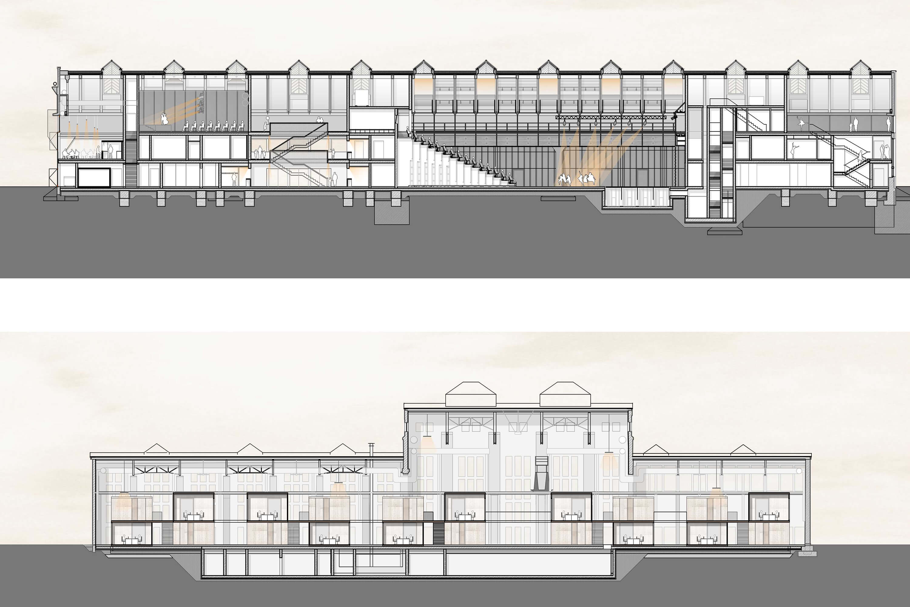 Die künftige Nutzung der beiden 1926 erbauten, denkmalgeschützten Industriehallen bildet den kulturellen Schwerpunkt im neuen Kreativquartier Münchens. Der Werkstattcharakter, der sich durch die Konservierung der alten Gebäudehüllen ergibt, soll sich dem Besucher nicht nur in der Außenwirkung, sondern auch in den Innenräumen erschließen, weshalb dem Erhalt der Tragwerksstrukturen sowie der originalen Oberflächen und Einbauten eine besondere Bedeutung zukommt. Beide Hallen werden demzufolge nach dem Haus–in–Haus–Prinzip organisiert, bei dem die Zwischenräume von historischer Hülle und neuem Einbau als Foyer- und Erschließungsflächen fungieren. Die filigrane Tonnenhalle nimmt in ihrem bandartig achsial ausgeprägten Grundriss einen großen Konzertsaal, kleinere Mehrzwecksäle sowie Gastronomieflächen auf. Die eher skulptural geprägte Jutierhalle wird mit einem modularen System von koppelbaren Atelierboxen bespielt, welches die Erlebbarkeit des Raumkontinuums der Halle auch künftig gewährleistet. Es entstehen vielfältig nutzbare Coworking spaces innerhalb, zwischen und auf den Raummodulen.