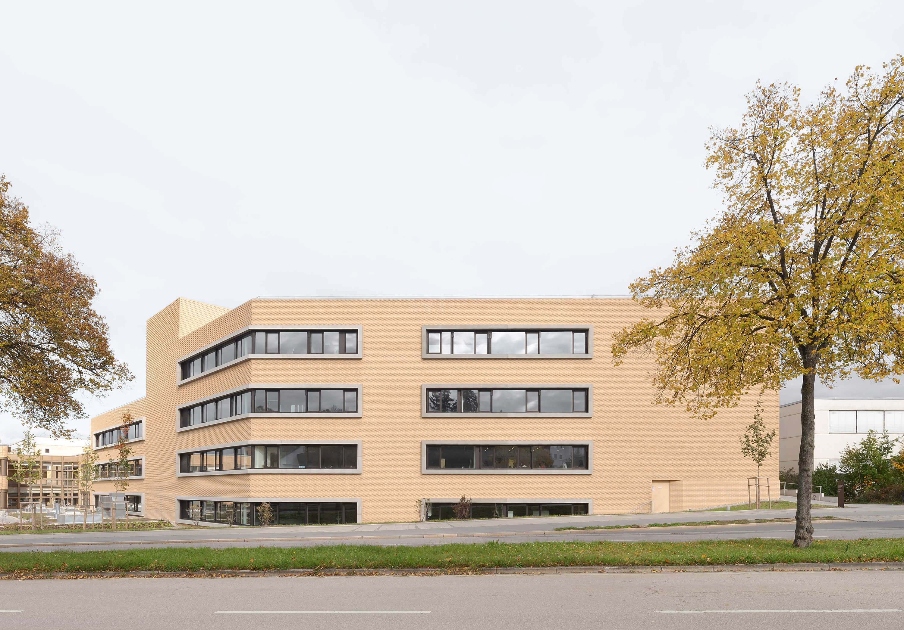 In seiner Materialisierung knüpft der Neubau an das sorgfältig detaillierte Klinkermauerwerk des Bestands an und entwickelt diese weiter. Die speziell für den Neubau gebrannten, fünfeckigen Ziegelsteine wurden lagenweise gegeneinander versetzt vermauert, wodurch ein feines Fassadenrelief mit beinahe textiler Anmutung entstand. Das Sonnenlicht zaubert ein feines Licht- und Schattenspiel auf das reliefierte Mauerwerk. Auch im Inneren setzt sich das Sichtmauerwerk der Fassaden fort. Hier akzentuiert das Streiflicht der Lichtbänder den handwerklichen Charakter des Mauerwerks und erzeugt so eine gleichermaßen wertige wie robuste Raumatmosphäre in der neuen Berufsschule.
