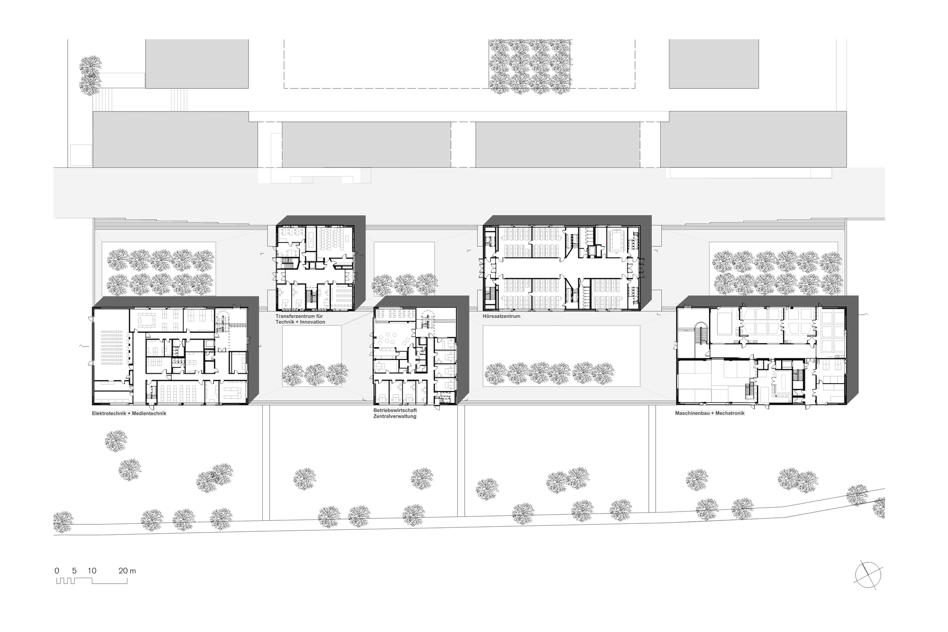 Die bestehende Hochschule wurde durch fünf präzise gesetzte Einzelbaukörper erweitert, die in ihrer Lage und Größe an das Baufeld der Bestandsgebäude anknüpfen. Durch die versetzte Anordnung entstanden maßstäbliche Platzräume, sowie eine städtebauliche Öffnung zur südlich angrenzenden Donau. Die übergeordneten gemeinschaftlichen Funktionen (Hörsaalgebäude, Verwaltung und Café) wurden zwischen Alt und Neu angeordnet, die drei Fakultätsgebäude (Maschinenbau, Elektrotechnik und Betriebswirtschaft) orientieren sich zum Gartenschaugelände entlang des Donauufers. Ein gemeinsamer Belag begrenzt das Geviert der Neubauten und staffelt sich in mehreren Terrassen unmerklich zur Deichkrone hinauf.