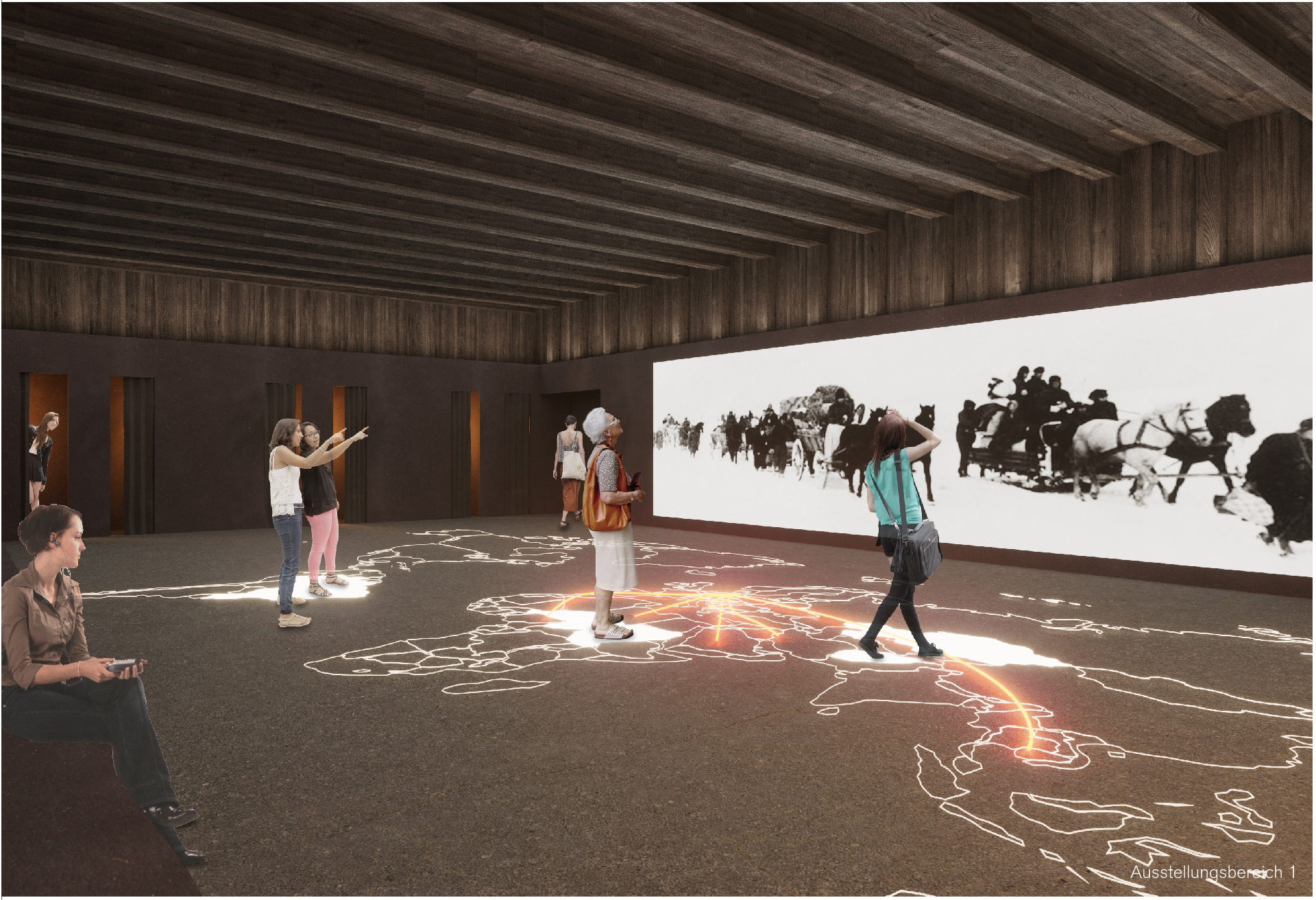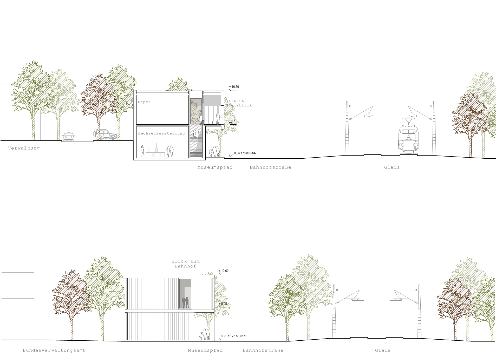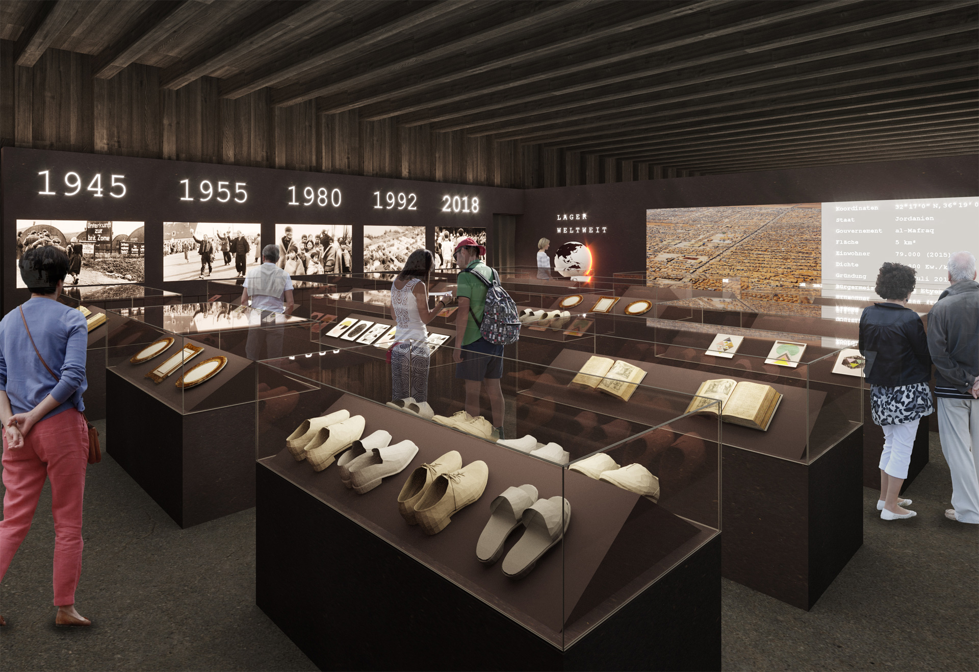 Ein langgestreckter zweigeschossiger Riegel folgt parallel dem Verlauf der Bahngleise. Seine äußere Gestalt und die innere Wegeführung reflektieren die Länge des Weges der Flüchtlinge nach Friedland und schaffen so einen spezifischen Bezug zum Ort. Durch den erdgeschossigen Wandelgang wird das Haus integraler Bestandteil des künftigen Museumspfades. Vom Wandelgang aus erfolgt der Zugang ins Foyer mit angelagerter Wechselausstellung. Über eine flach geneigte Rampentreppe gelangt der Besucher dem zenital einfallenden Licht folgend ins Obergeschoss. Hier ist von erhöhter Stelle ein Ausblick in Richtung Lager möglich. Der Weg wendet sich um 180 Grad und führt in einer Wandelhalle, die die komplette Gebäudelänge spürbar macht, zurück nach Süden. Rechts der Wandelhalle liegen die drei Ausstellungsräume, links davon öffnet sich die Aussicht zum vorgelagerten Gleisfeld. Bänke laden zum Verweilen an diesem kontemplativen Ort ein und lassen das Gleisfeld zum authentischen Teil der Ausstellung werden. Das serielle Gestaltungsprinzip und die roh belassene Materialität leiten sich von der reduzierten Ästhetik schlichter Lagerarchitekturen ab. Die reliefierte Fügung des schwarz lasierten Holzbaus zaubert ein feines Schattenspiel auf die Fassade.