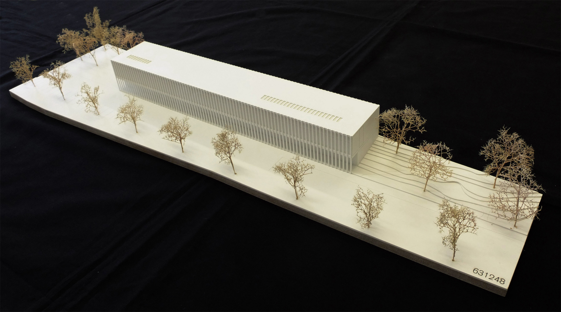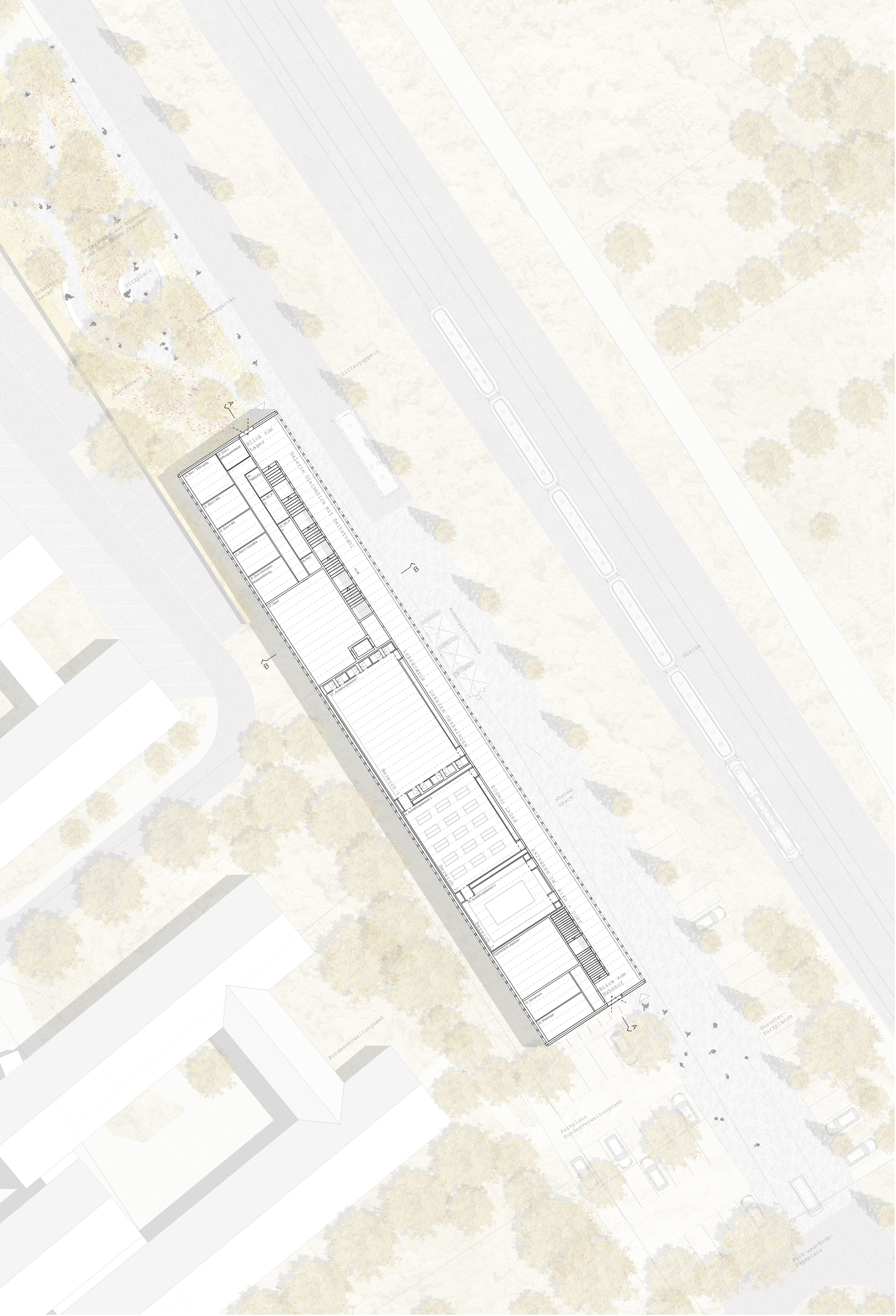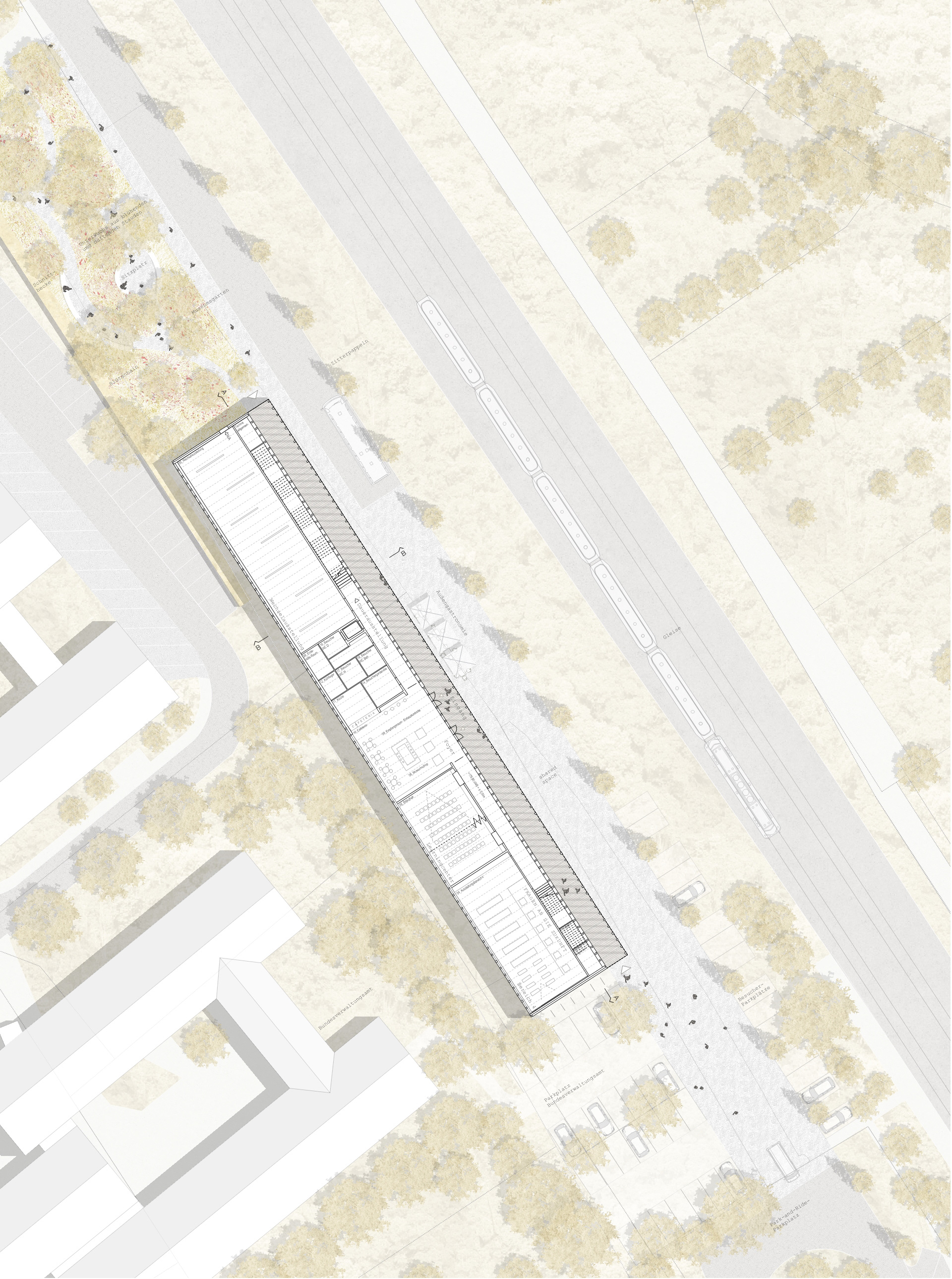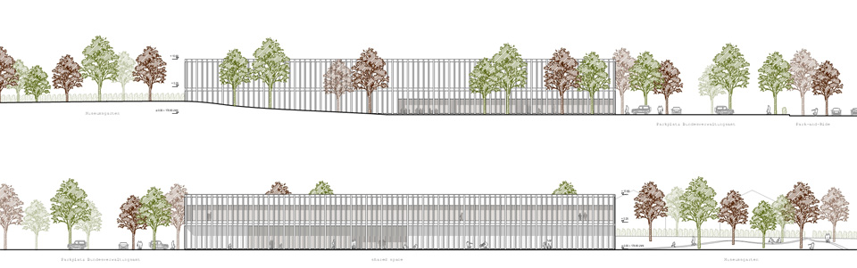 Ein langgestreckter zweigeschossiger Riegel folgt parallel dem Verlauf der Bahngleise. Seine äußere Gestalt und die innere Wegeführung reflektieren die Länge des Weges der Flüchtlinge nach Friedland und schaffen so einen spezifischen Bezug zum Ort. Durch den erdgeschossigen Wandelgang wird das Haus integraler Bestandteil des künftigen Museumspfades. Vom Wandelgang aus erfolgt der Zugang ins Foyer mit angelagerter Wechselausstellung. Über eine flach geneigte Rampentreppe gelangt der Besucher dem zenital einfallenden Licht folgend ins Obergeschoss. Hier ist von erhöhter Stelle ein Ausblick in Richtung Lager möglich. Der Weg wendet sich um 180 Grad und führt in einer Wandelhalle, die die komplette Gebäudelänge spürbar macht, zurück nach Süden. Rechts der Wandelhalle liegen die drei Ausstellungsräume, links davon öffnet sich die Aussicht zum vorgelagerten Gleisfeld. Bänke laden zum Verweilen an diesem kontemplativen Ort ein und lassen das Gleisfeld zum authentischen Teil der Ausstellung werden. Das serielle Gestaltungsprinzip und die roh belassene Materialität leiten sich von der reduzierten Ästhetik schlichter Lagerarchitekturen ab. Die reliefierte Fügung des schwarz lasierten Holzbaus zaubert ein feines Schattenspiel auf die Fassade.