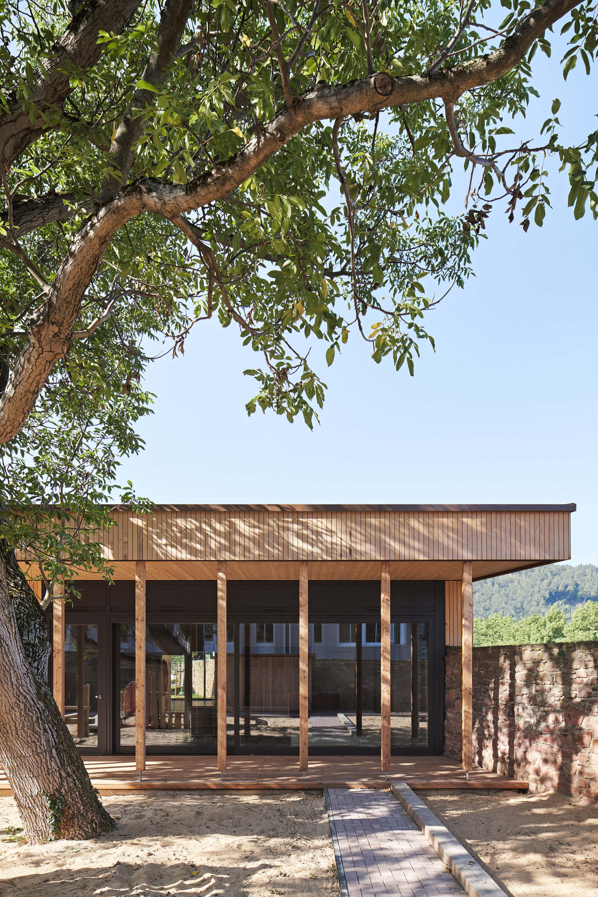Der von mächtigen, roten Sandsteinmauern umfasste Klostergarten des ehemaligen Franziskanerklosters ist eine grüne Oase im historischen Stadtzentrum Miltenbergs. Ein Ort, der auf idealtypische Weise Zentralität und Geborgenheit in sich vereint. Gleichzeitig aber auch ein sensibler Ort mit großer Geschichte, dessen Bebauung mit einer Kindertagesstätte Behutsamkeit und Präzision erfordert. Der Neubau wurde als eingeschossiger Pavillon passgenau zwischen die Klostermauern eingespannt und teilt so den Garten in den Freispielbereich der Kita und einen öffentlich zugänglichen Freiraum, der im Sinne des ehemaligen Klostergartens gestaltet wird. Das Haus wurde als konstruktiver Holzbau mit sichtbar belassenen Oberflächen erstellt. Mit seiner sanft gestaffelten Terrassierung folgt es der Topografie des Geländes. Ihre haptischen und atmosphärischen Qualitäten machen die Kita zu einem Haus zum Anfassen. Jeder Gruppenraum verfügt über ein räumlich integriertes Kletterelement, das sich als Ausguck über die begrünte Dachfläche erhebt. Hier sind für die Kinder Rückzugsorte entstanden, die zum Träumen, Lesen, Beobachten oder Nachdenken inspirieren.