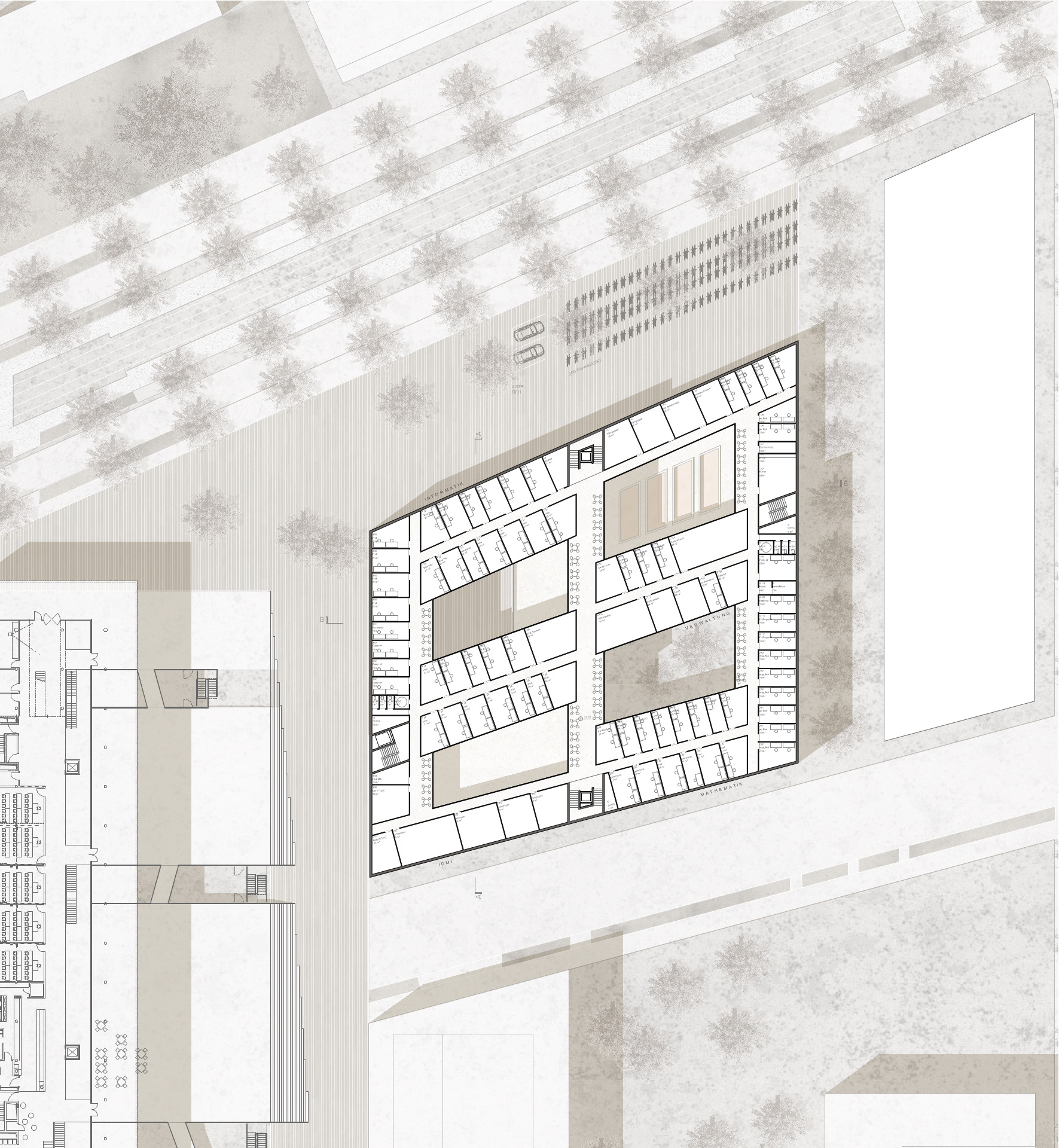Der Neubau weicht um einige Meter von der nördlich verlaufenden Riedbergallee zurück und schafft so einen Vorplatz, der das Pendant des diagonal gegenüberliegenden Riedbergplatzes bildet. Gemeinsam mit dem Otto-Stern-Zentrum formuliert er das Entrée in den südlichen Teil des Campus Riedberg. Das Haus wurde als höhengestaffelter Block mit vier Innenhöfen entwickelt, dessen schiefwinklige Ränder die angrenzenden Straßen- und Platzfluchten begleiten. Die vier Quadranten des Hauses sind zwischen 2 und 5 Geschossen hoch, wobei der höchste Bauteil die adressbildende Platzsituation an der Nordwestecke markiert. Seiner volumetrischen Scharfkantigkeit entsprechend, wird der Neubau mit großformatigen Stahlplatten bekleidet, deren Präzision und Serialität die streng getaktete Fassade des Hauses kennzeichnen. Die verzinkte Oberfläche zeigt eine abwechslungsreiche Textur, die zwischen Glanz und Mattigkeit changiert und deren Erscheinung abhängig von Sonnenstand und Jahreszeit variiert.