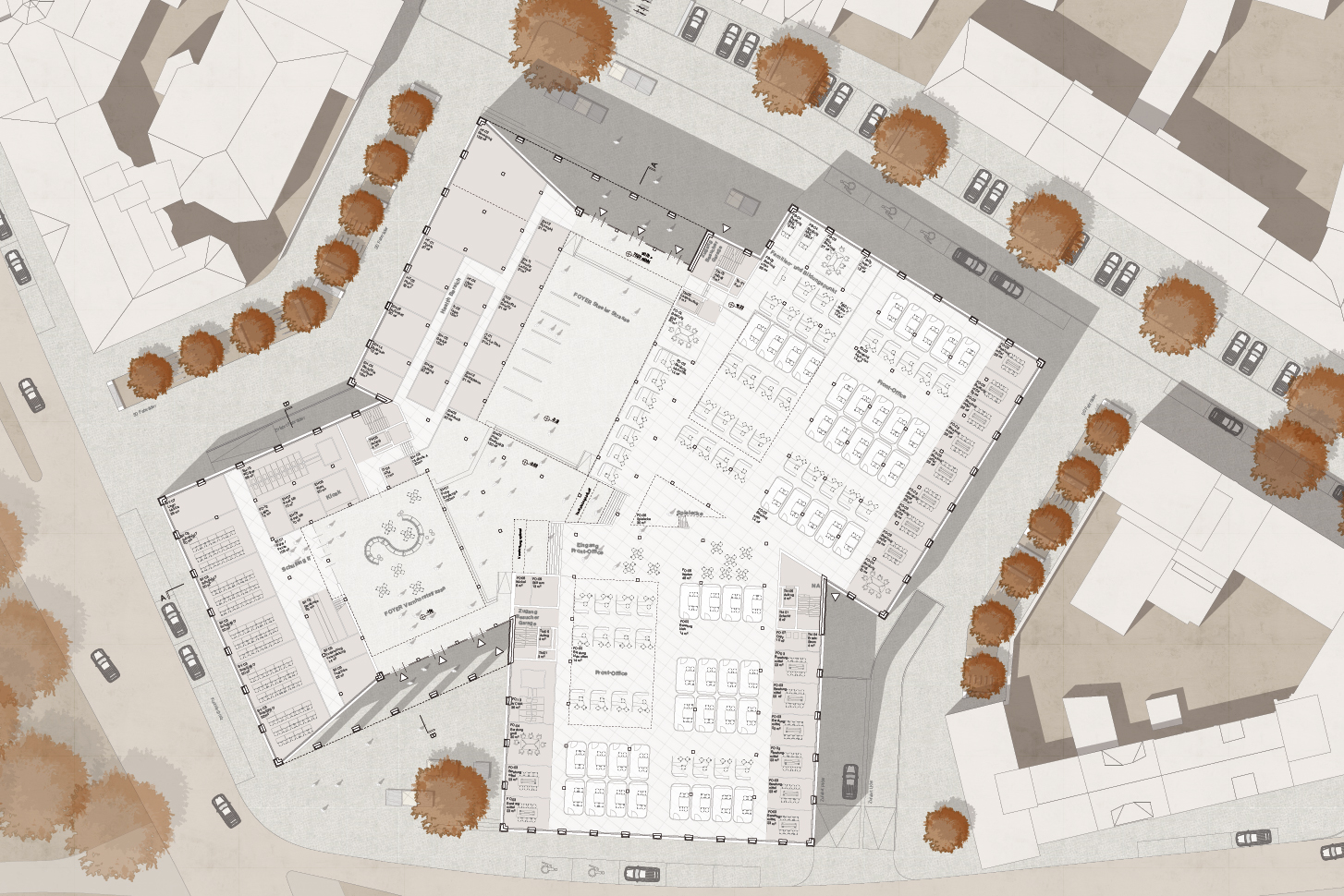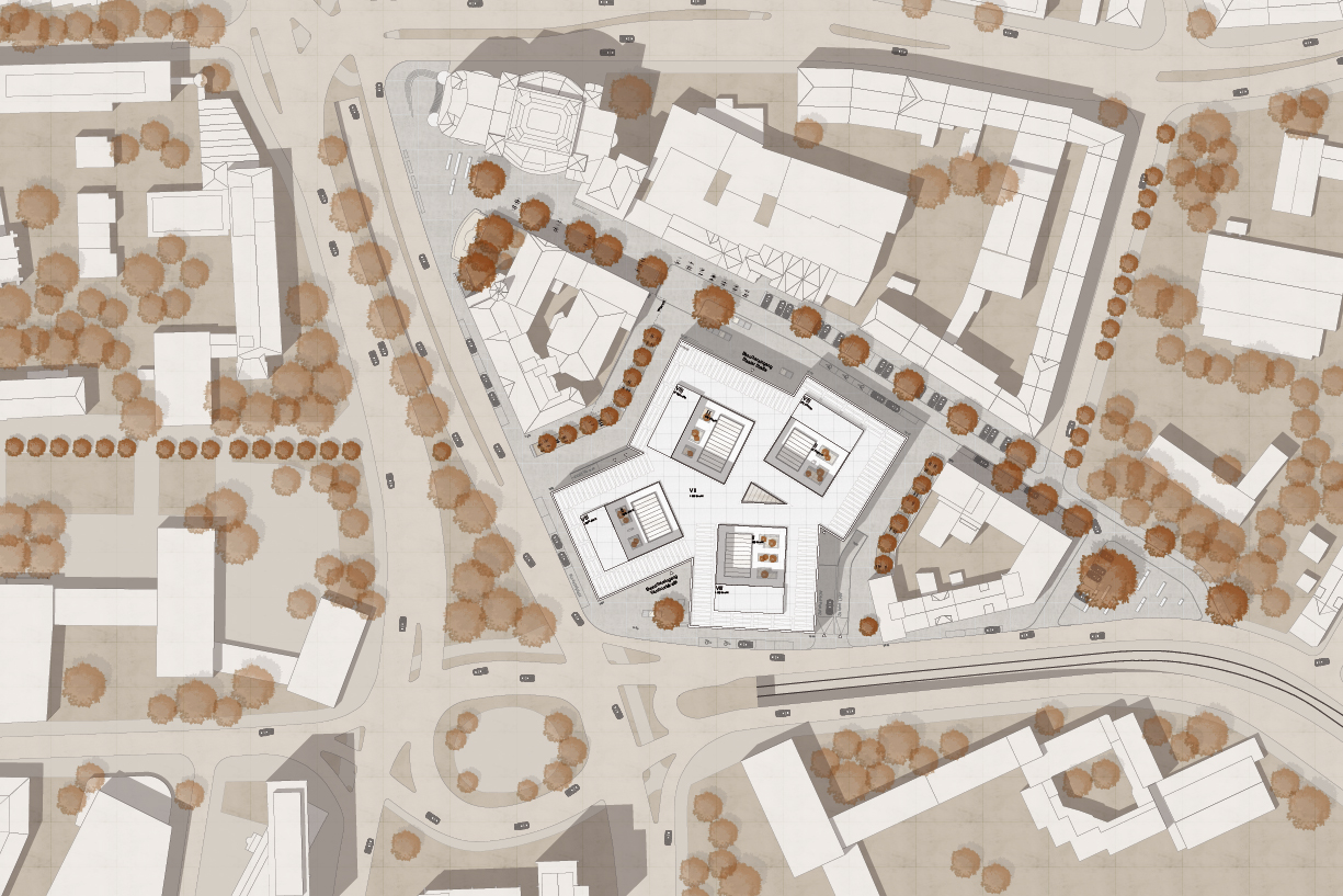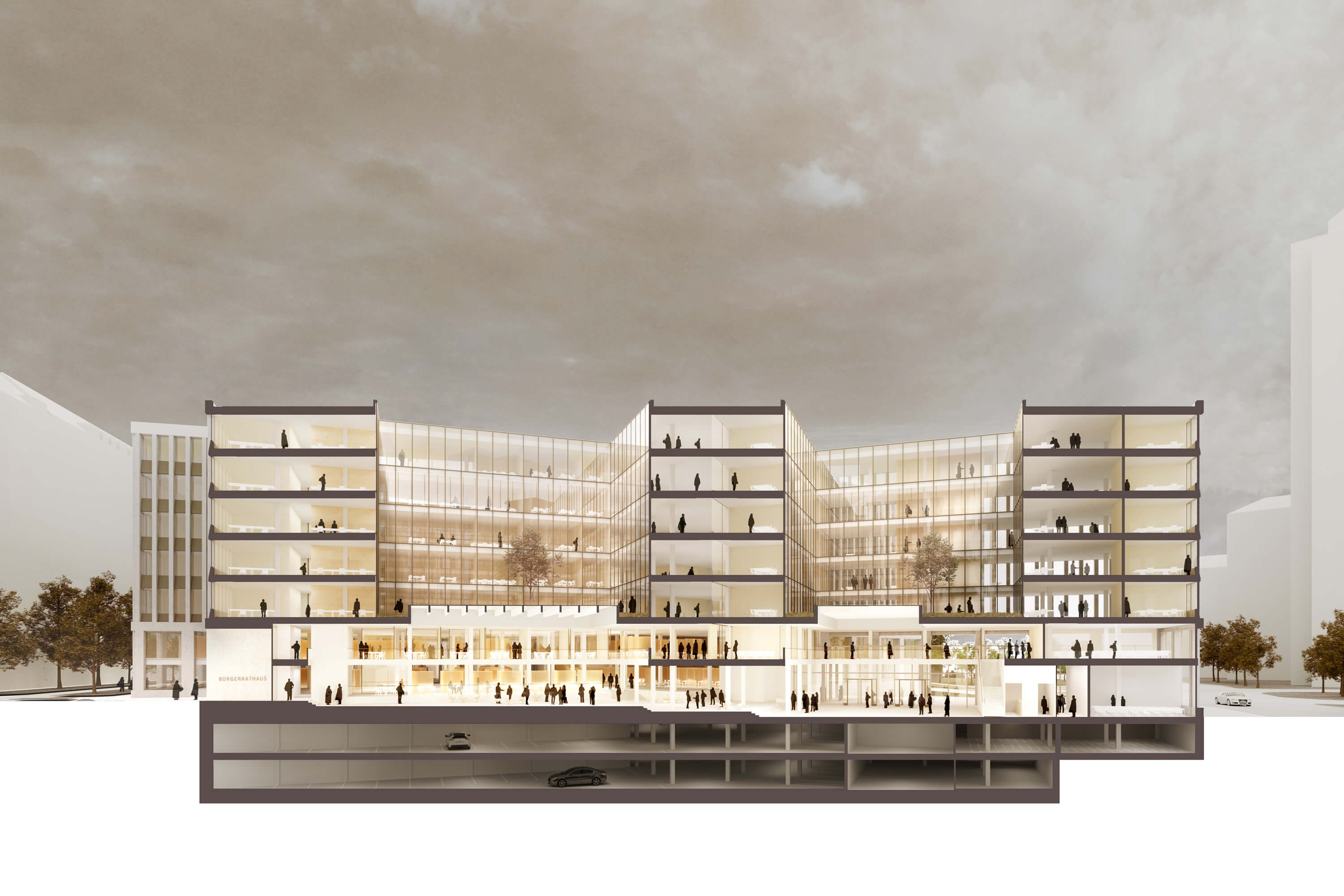 Der Entwurf gliedert sich in vier Einzelbausteine, die sich am Blockrand orientieren und durch ihre Fügung im Blockinnenbereich zu einem spannungsvollen Ganzen komponiert werden. So entsteht ein Haus, das sich einerseits sorgfältig in den Stadtgrundriss einfügt und andererseits der öffentlichen Nutzung gemäß angemessen selbstbewusst freispielt.