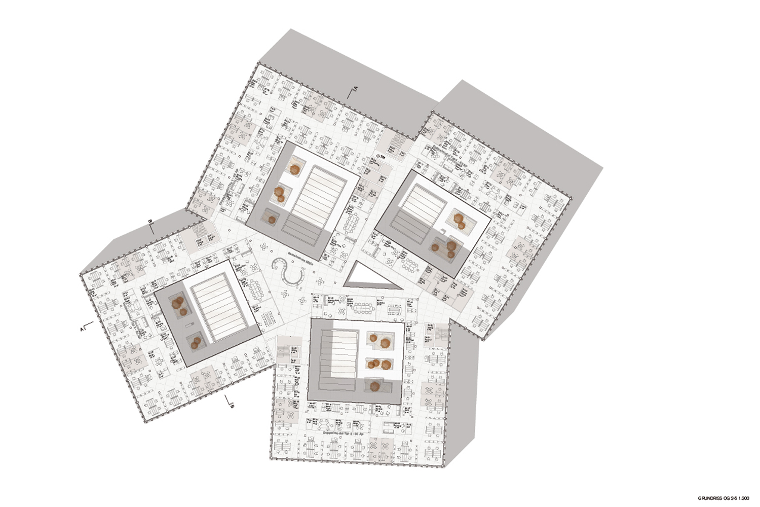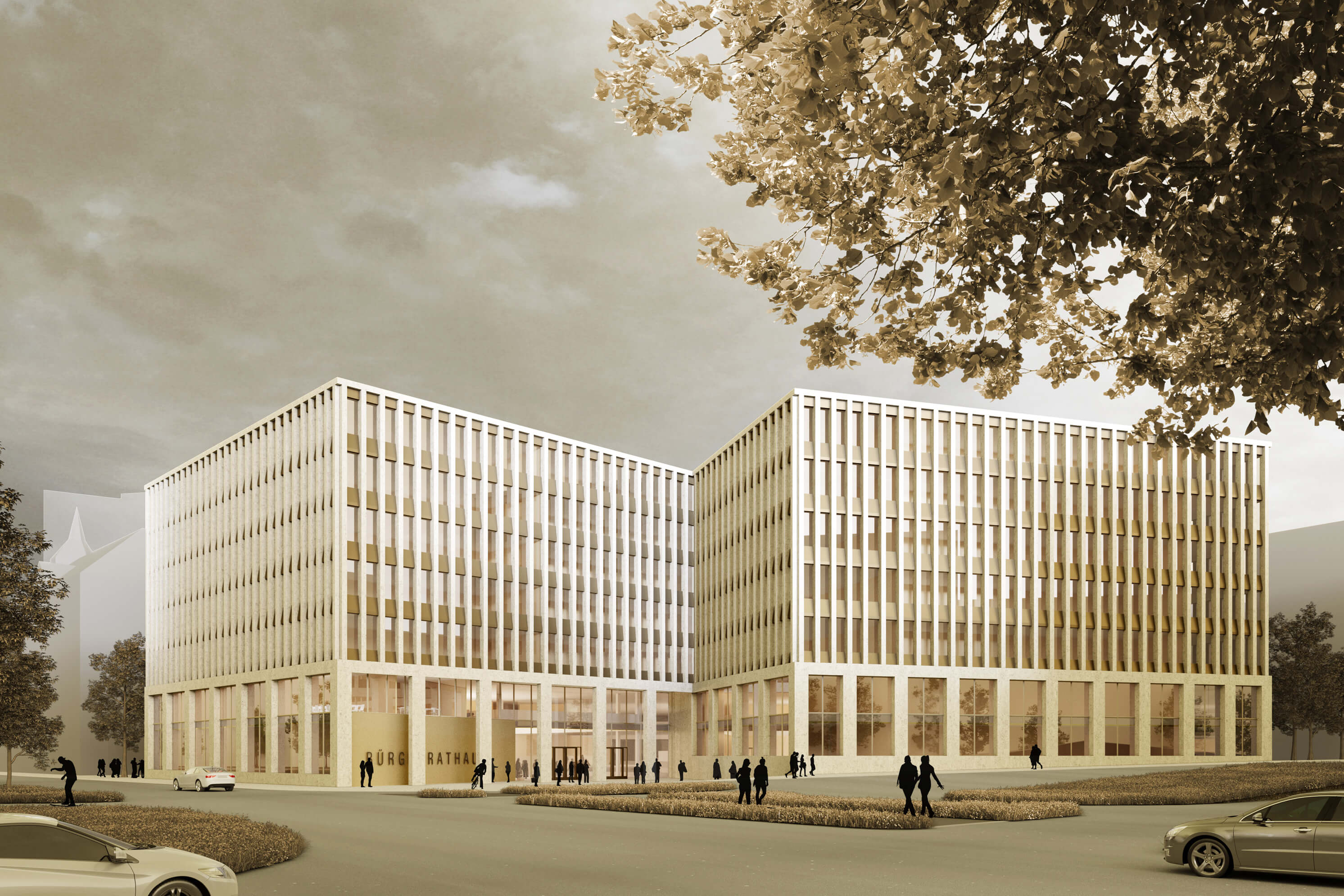 Die Fügung der Einzelbaukörper, die aus dem Grundmodul der 19 Arbeitsgruppen entwickelt sind, eröffnet im Innenraum vielfältige Kommunikationsangebote ebenso wie eine großräumige und doch differenzierte Beratungslandschaft im Erdgeschoss und ersten Obergeschoss. Der offene Raumeindruck unterstreicht räumlich das Bild der transparenten und bürgernahen Verwaltung.
