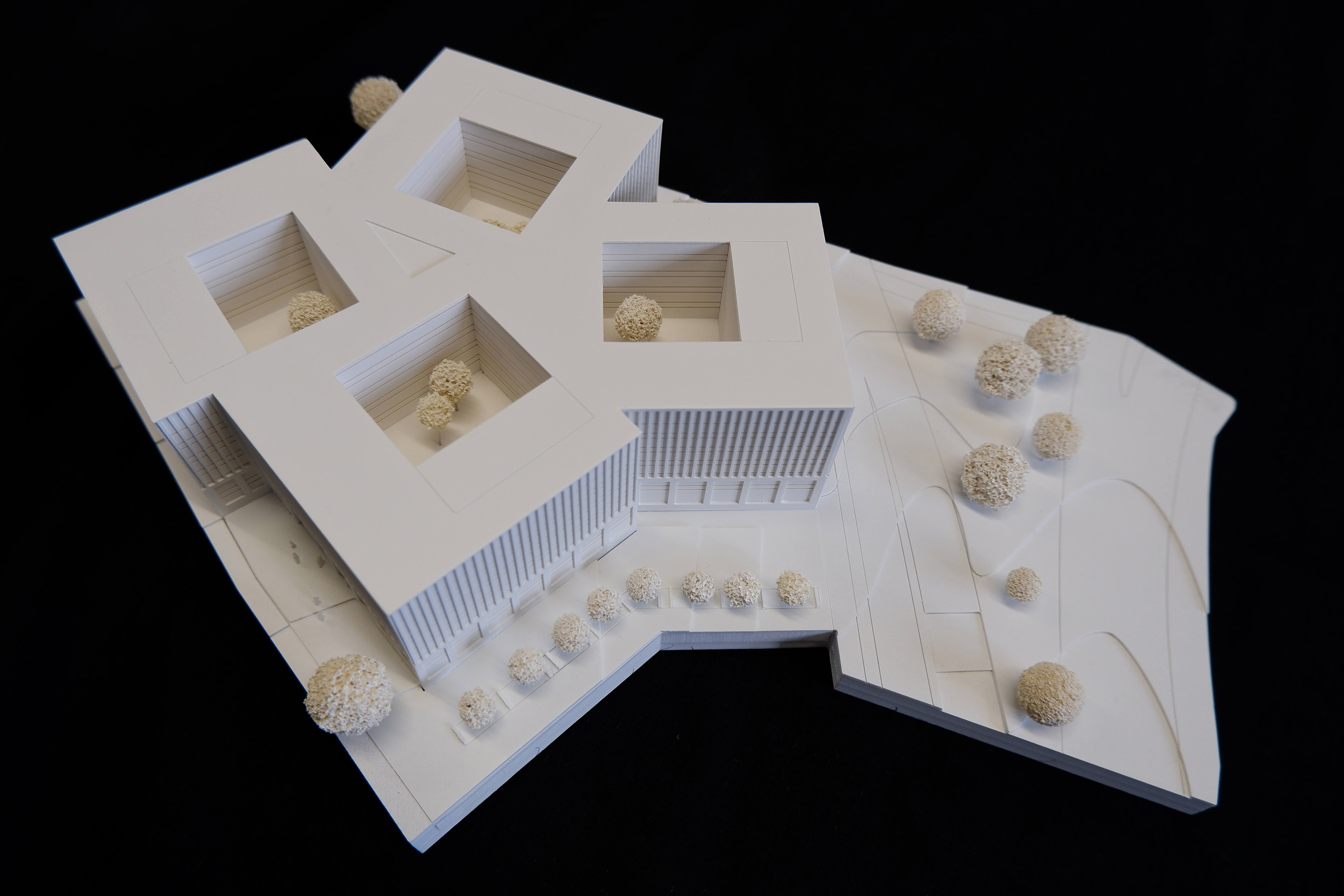 Der Entwurf gliedert sich in vier Einzelbausteine, die sich am Blockrand orientieren und durch ihre Fügung im Blockinnenbereich zu einem spannungsvollen Ganzen komponiert werden. So entsteht ein Haus, das sich einerseits sorgfältig in den Stadtgrundriss einfügt und andererseits der öffentlichen Nutzung gemäß angemessen selbstbewusst freispielt.