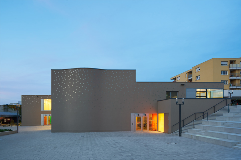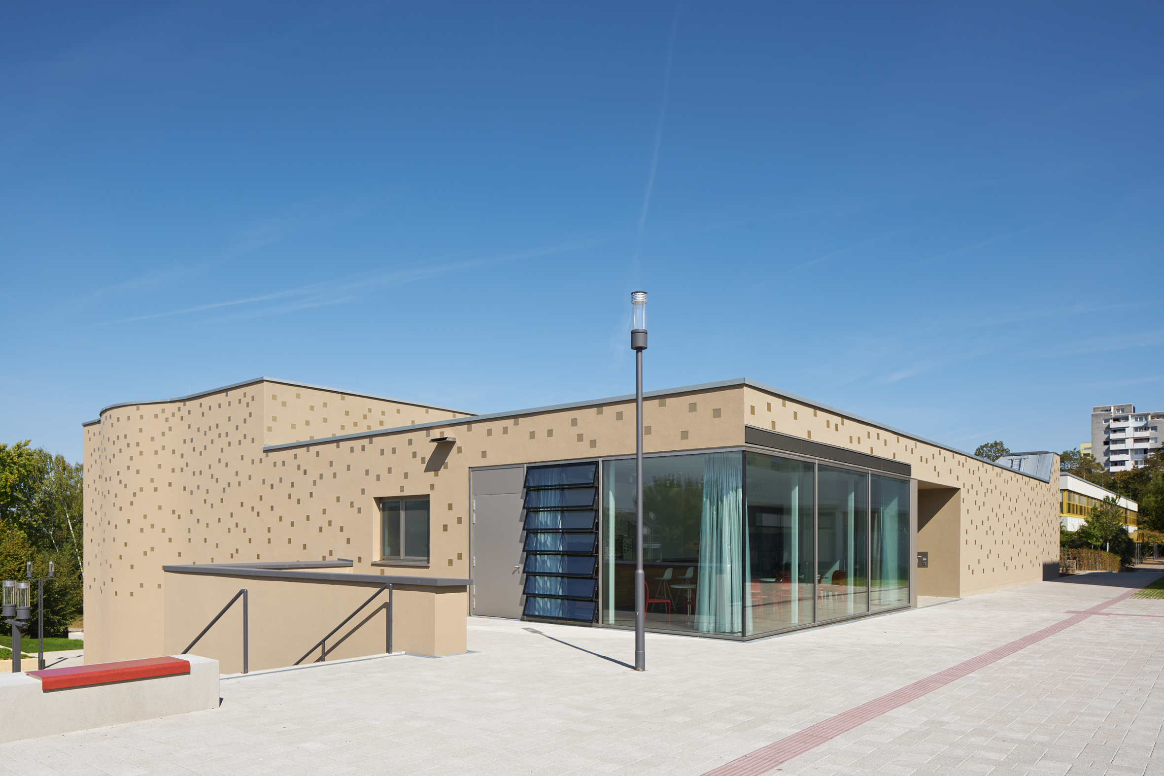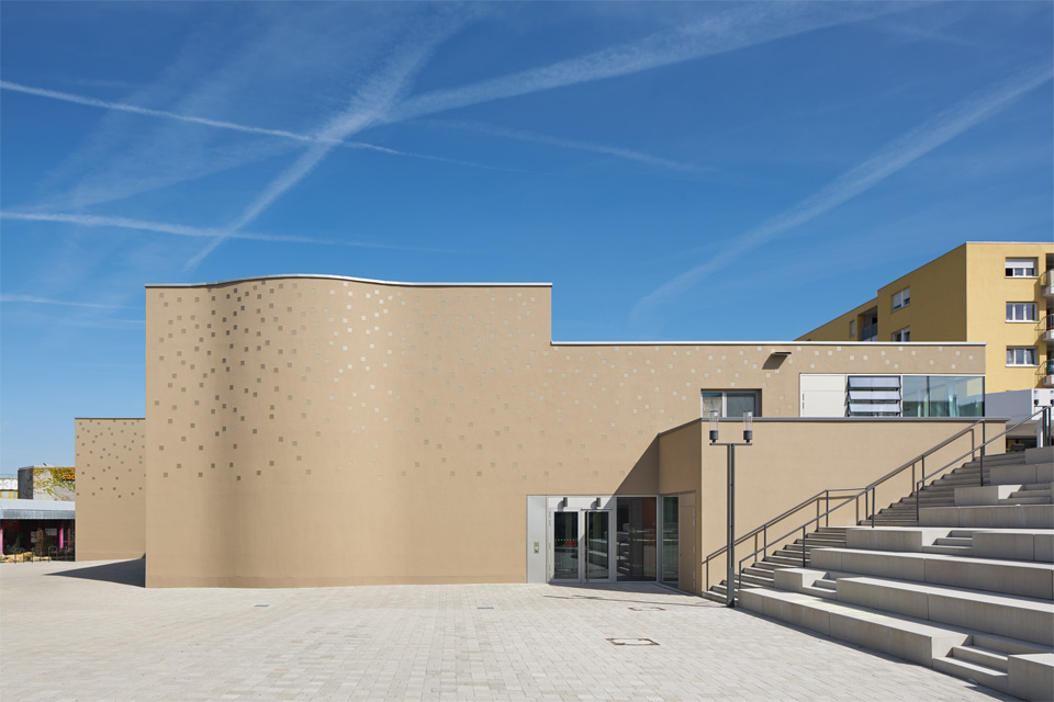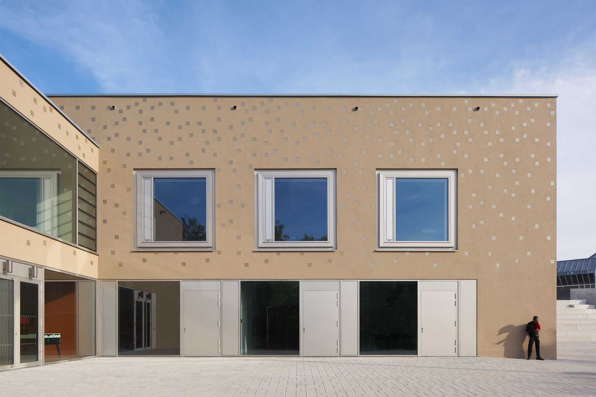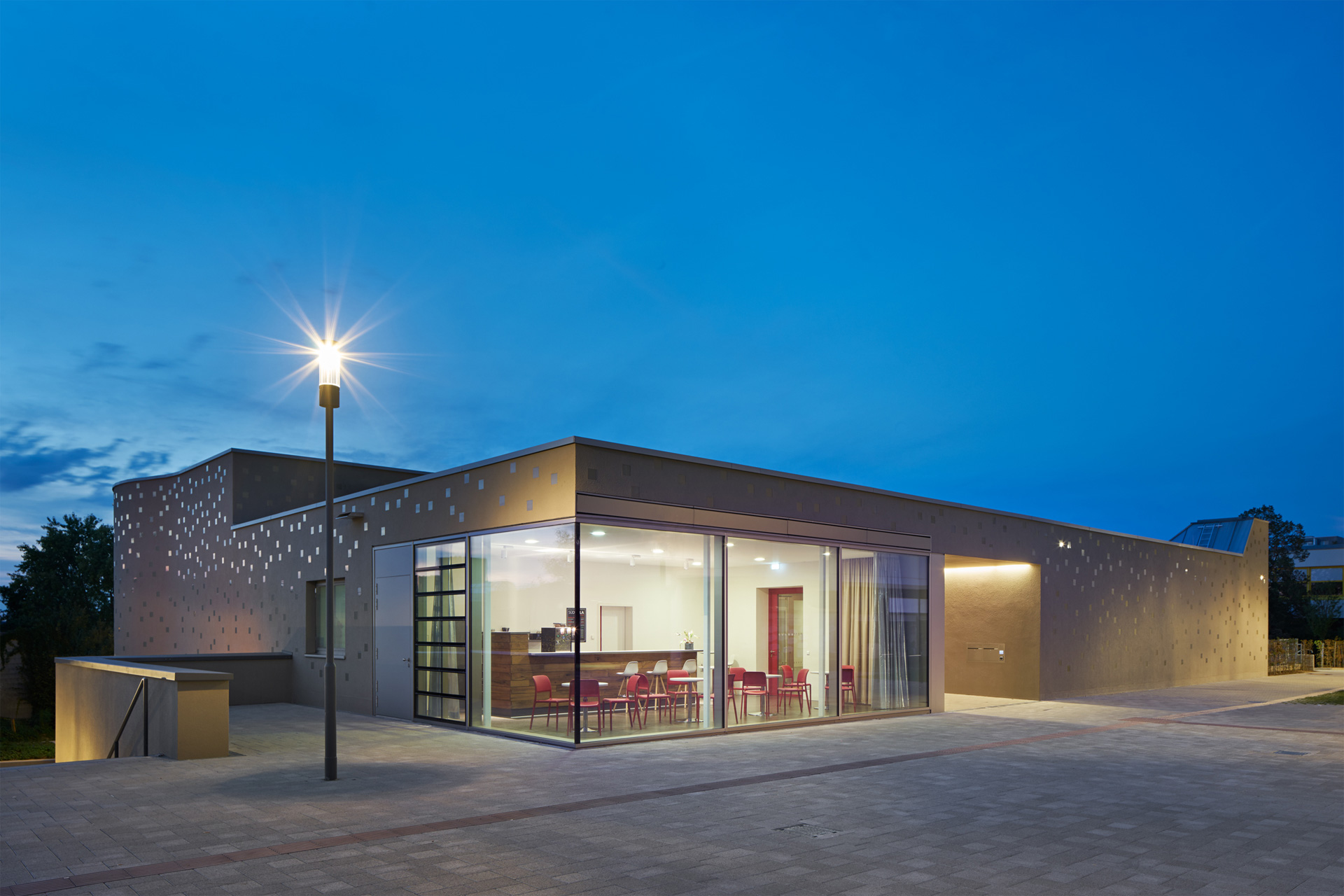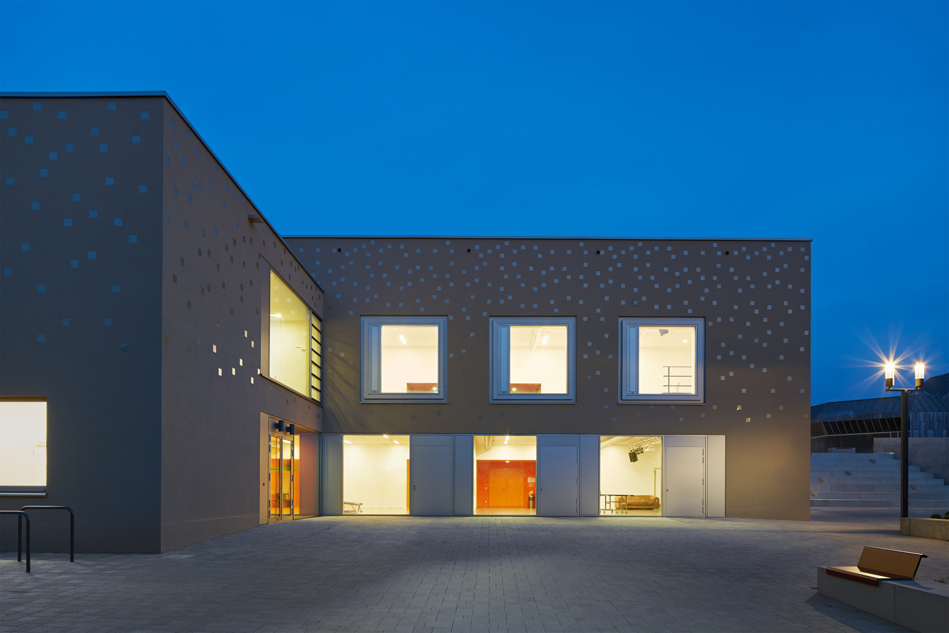 Das bestehende Jugendhaus wurde baulich arrondiert und zum generationsübergreifenden Jugend- und Bürgerhaus erweitert. Eine breite Sitztreppe überbrückt die Topografie und bildet ein kommunikatives Auditorium im Freien. Im Gebäude findet jede Generation ihre eigene Rückzugsnische und doch gibt es auch reichlich Raum für Begegnungen. Die innere Erschließung ist so konzipiert, dass die einzelnen Bereiche über Foyers, Treppen und Lufträume miteinander verknüpft sind und dennoch stets die Möglichkeit einer räumlichen Abtrennung gegeben ist. Kinder und Jugendliche belegen die untere Etage des Hauses, während die Erwachsenen ihren Bürgersaal und das Bistro auf der oberen Ebene finden. In den Fassadenputz wurden flächenbündig quadratische Glasfliesen eingearbeitet, deren Rückseite braunmetallic bedruckt ist. Die glitzernden Fliesen kontrastieren mit der Mattigkeit des Putzes und reflektieren die Umgebung in gepixelter Form. Gleichzeitig wird dem Jugend- und Bürgerhaus so mit einfachen Mitteln eine angemessen hochwertige Erscheinung verliehen.