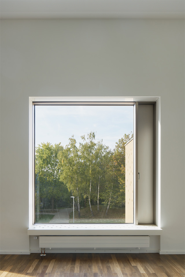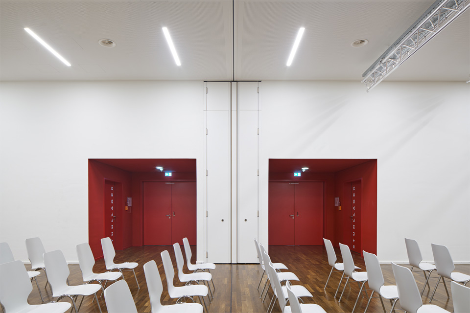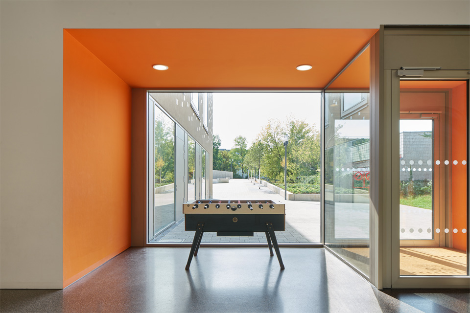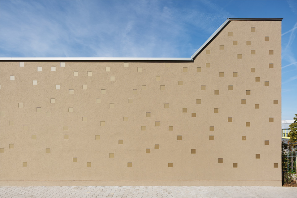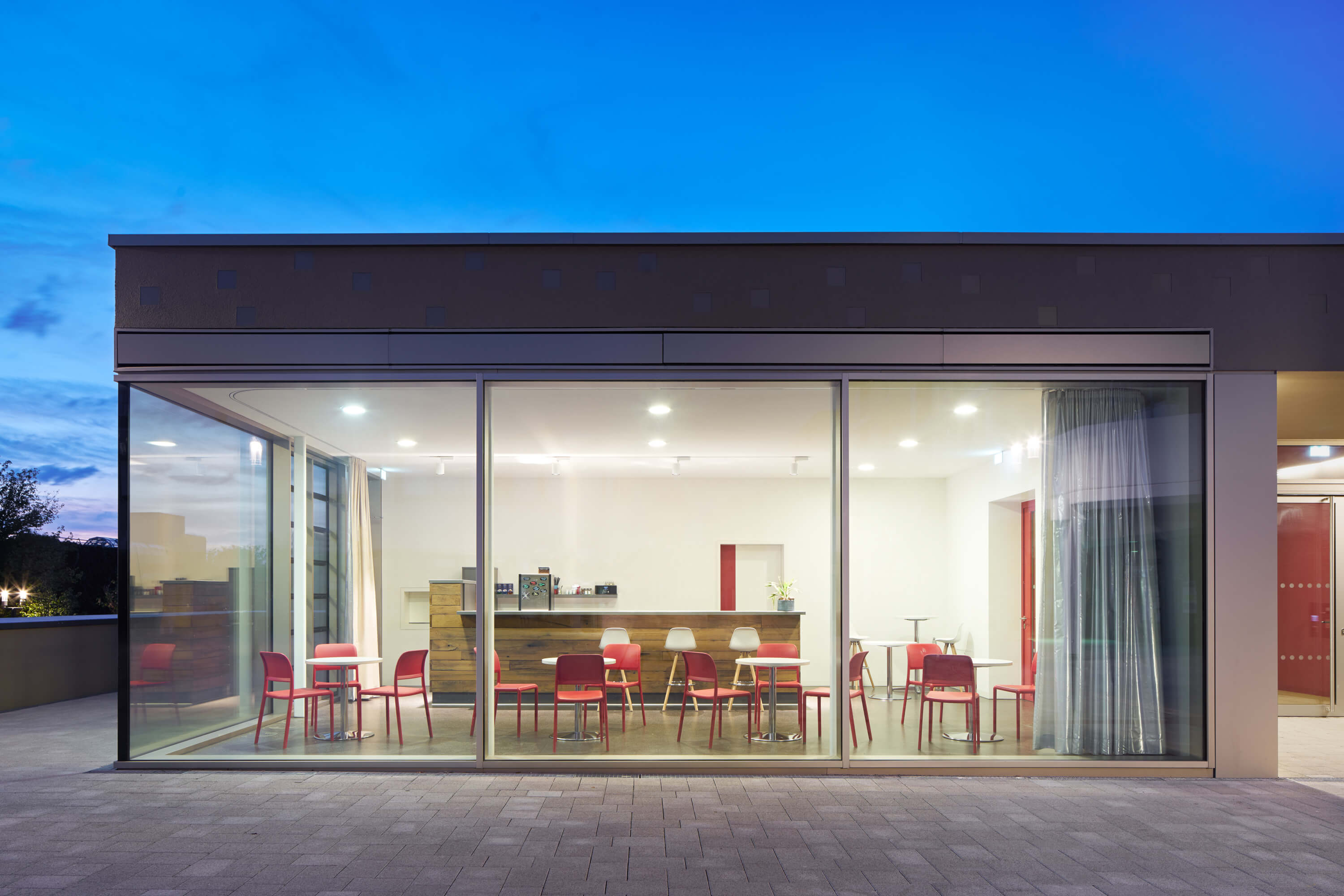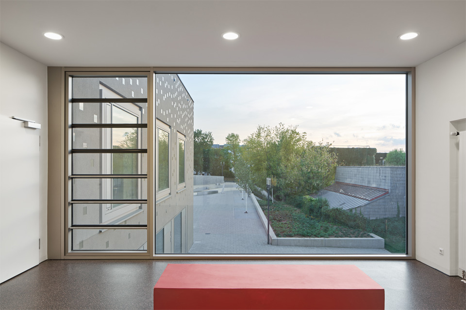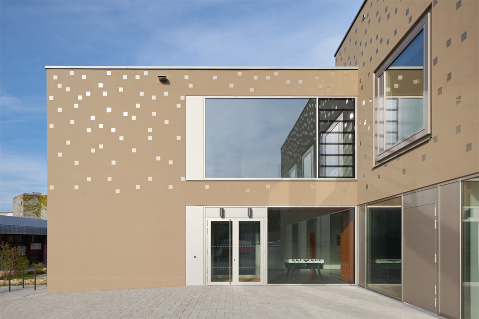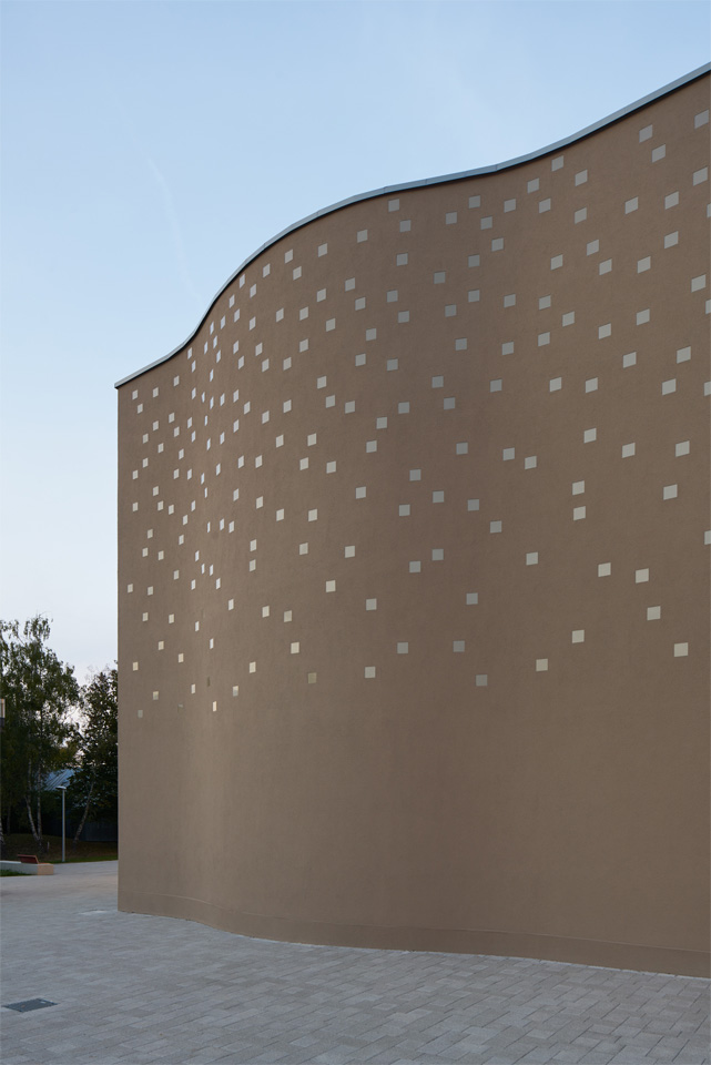 Das bestehende Jugendhaus wurde baulich arrondiert und zum generationsübergreifenden Jugend- und Bürgerhaus erweitert. Eine breite Sitztreppe überbrückt die Topografie und bildet ein kommunikatives Auditorium im Freien. Im Gebäude findet jede Generation ihre eigene Rückzugsnische und doch gibt es auch reichlich Raum für Begegnungen. Die innere Erschließung ist so konzipiert, dass die einzelnen Bereiche über Foyers, Treppen und Lufträume miteinander verknüpft sind und dennoch stets die Möglichkeit einer räumlichen Abtrennung gegeben ist. Kinder und Jugendliche belegen die untere Etage des Hauses, während die Erwachsenen ihren Bürgersaal und das Bistro auf der oberen Ebene finden. In den Fassadenputz wurden flächenbündig quadratische Glasfliesen eingearbeitet, deren Rückseite braunmetallic bedruckt ist. Die glitzernden Fliesen kontrastieren mit der Mattigkeit des Putzes und reflektieren die Umgebung in gepixelter Form. Gleichzeitig wird dem Jugend- und Bürgerhaus so mit einfachen Mitteln eine angemessen hochwertige Erscheinung verliehen.