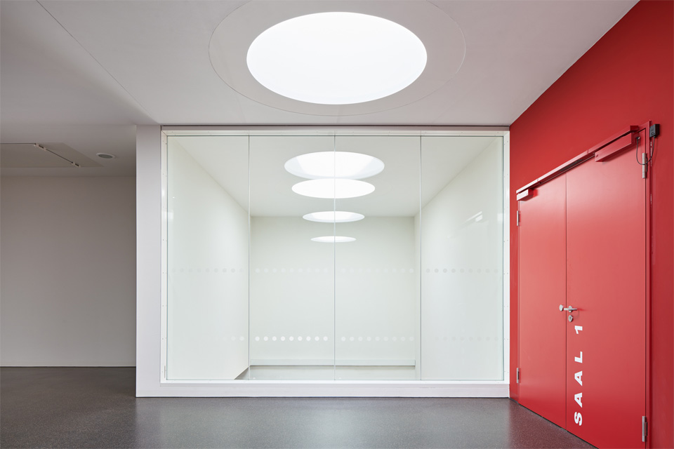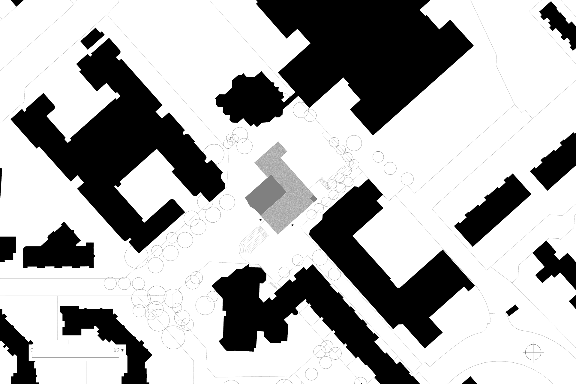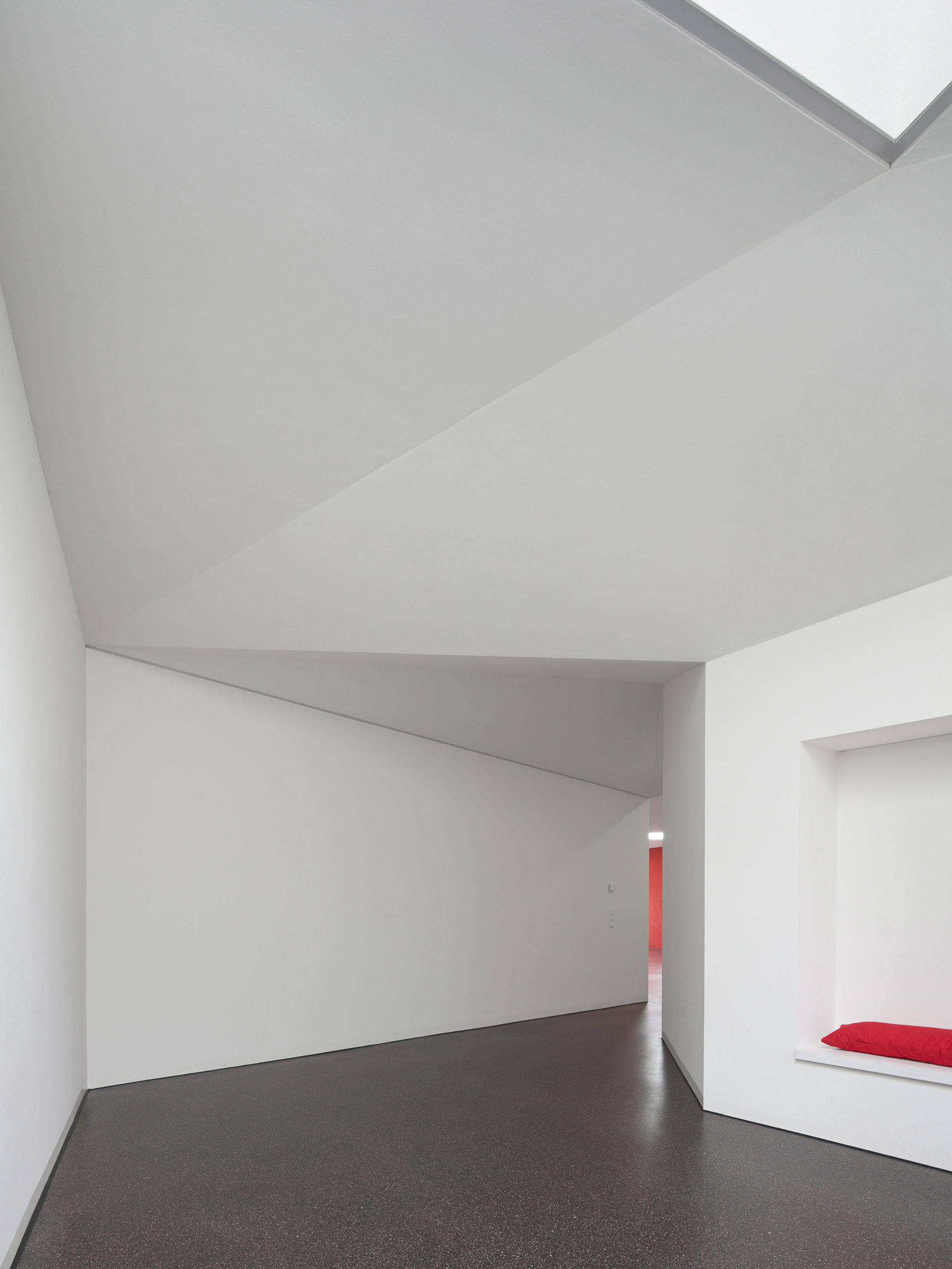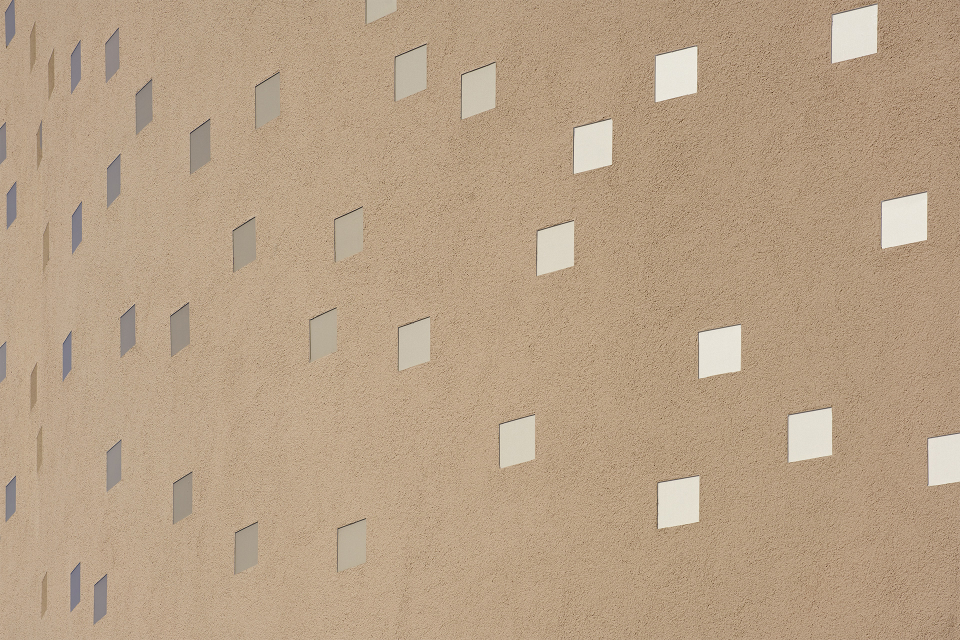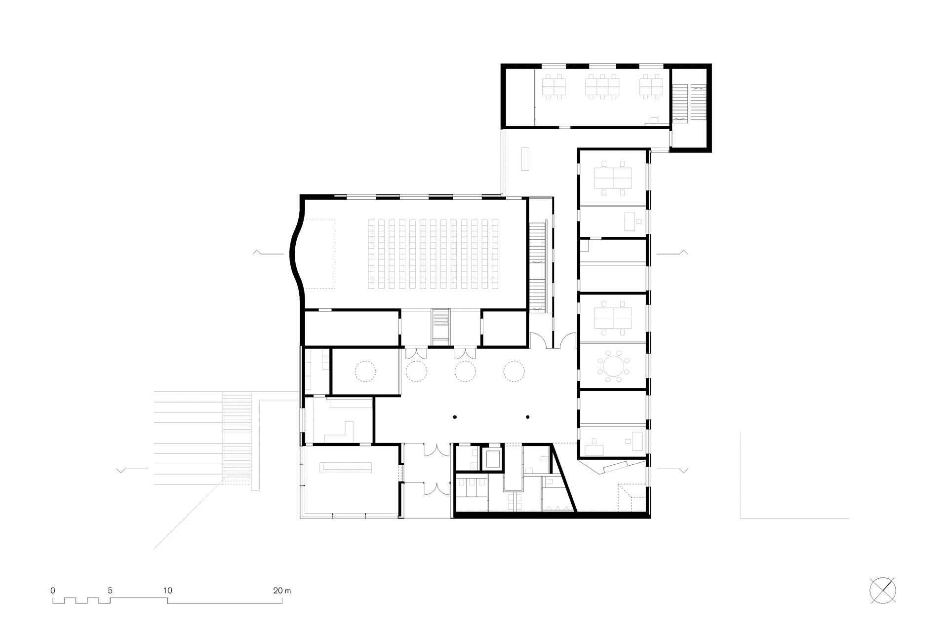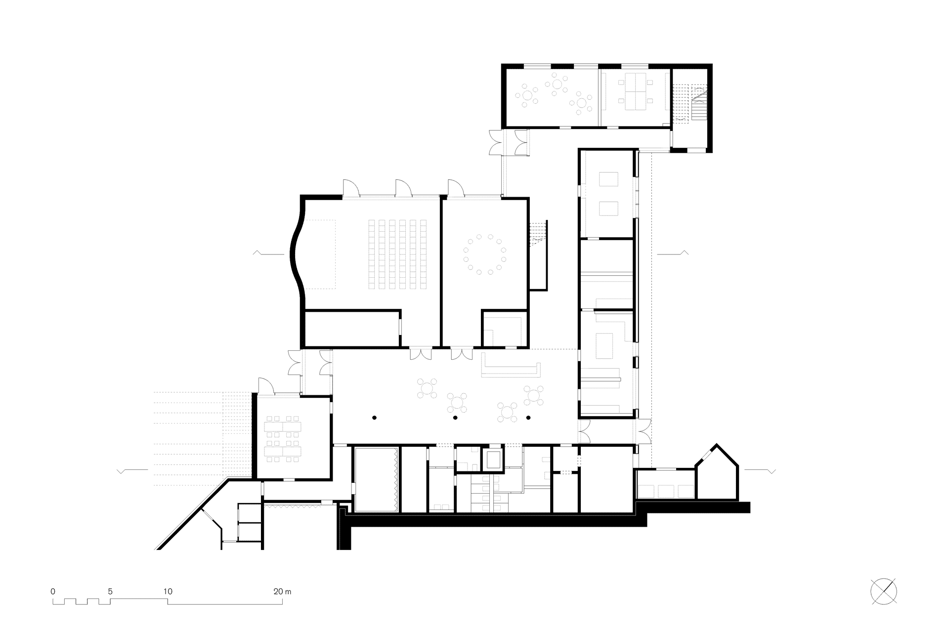 Das bestehende Jugendhaus wurde baulich arrondiert und zum generationsübergreifenden Jugend- und Bürgerhaus erweitert. Eine breite Sitztreppe überbrückt die Topografie und bildet ein kommunikatives Auditorium im Freien. Im Gebäude findet jede Generation ihre eigene Rückzugsnische und doch gibt es auch reichlich Raum für Begegnungen. Die innere Erschließung ist so konzipiert, dass die einzelnen Bereiche über Foyers, Treppen und Lufträume miteinander verknüpft sind und dennoch stets die Möglichkeit einer räumlichen Abtrennung gegeben ist. Kinder und Jugendliche belegen die untere Etage des Hauses, während die Erwachsenen ihren Bürgersaal und das Bistro auf der oberen Ebene finden. In den Fassadenputz wurden flächenbündig quadratische Glasfliesen eingearbeitet, deren Rückseite braunmetallic bedruckt ist. Die glitzernden Fliesen kontrastieren mit der Mattigkeit des Putzes und reflektieren die Umgebung in gepixelter Form. Gleichzeitig wird dem Jugend- und Bürgerhaus so mit einfachen Mitteln eine angemessen hochwertige Erscheinung verliehen.
