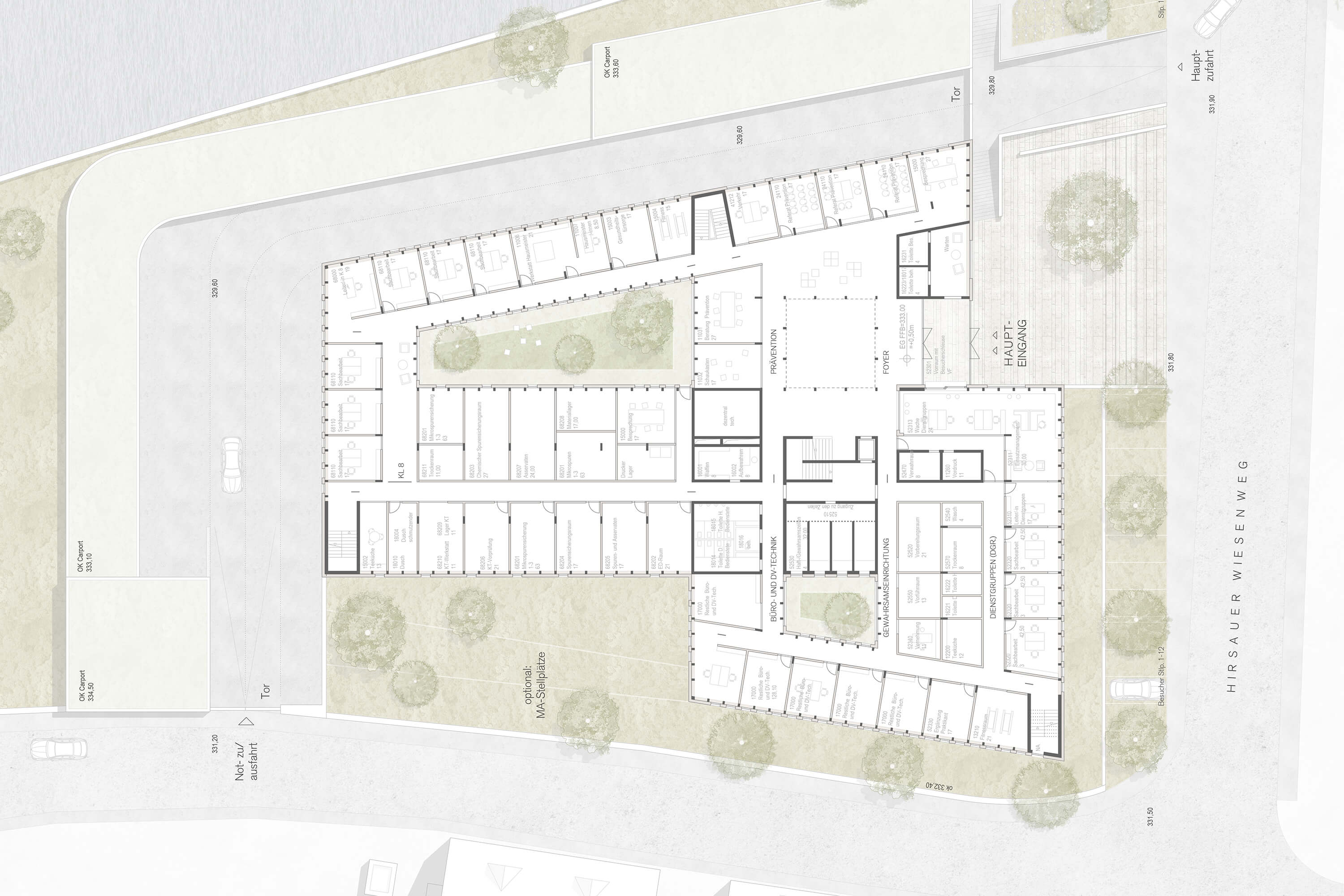 Der Neubau am Hirsauer Wiesenweg vermag durch seine exponierte Lage die nördliche Stadteinfahrt Calws maßgeblich aufzuwerten. Über die Nagold hinweg ist das markante Gebäude von der Bischofstraße aus nicht zu übersehen, durch die Sannwaldbrücke ist es zudem auf kurzem Wege erschlossen. Das Polizeigebäude gliedert sich in drei Flügel mit differenzierter Geschosszahl und erzeugt so eine dem Ort und der Funktion angemessene Maßstäblichkeit. Der viergeschossige Kopfbau markiert die platzartige Zugangssituation auf der Südseite der Parzelle. Der Vorplatz wird auf seiner Westseite von einem zweigeschossigen Bauteil flankiert, das auf die kleinteiligere Nachbarbebauung am Hirsauer Wiesenweg antwortet. Nach Norden hin begleitet ein dreigeschossiger Flügel den Lauf der Nagold, der einen Innenhof umschließt. Die äußere Geometrie des Baukörpers orientiert sich an den bestehenden Straßen und dem Flusslauf der Nagold, so dass der Neubau sehr selbstverständlich mit seinem Bauplatz verwächst. Nach Norden und Osten hin wird das Haus von einem eingeschossigen Baukörper umfasst, das die Stellplätze der Dienstfahrzeuge aufnimmt und gleichzeitig Teil der Einfriedung des Polizeihofes ist. Mit der Materialität der dunklen Holzschindeln, polygonal verlegt, wird ein Bezug zu örtlichen Traditionen und bewährter Handwerklichkeit aufgebaut. Im Zusammenwirken mit der Reihung der weiß lackierten Fenster entsteht ein Bild, das Vertrautheit ausstrahlt.