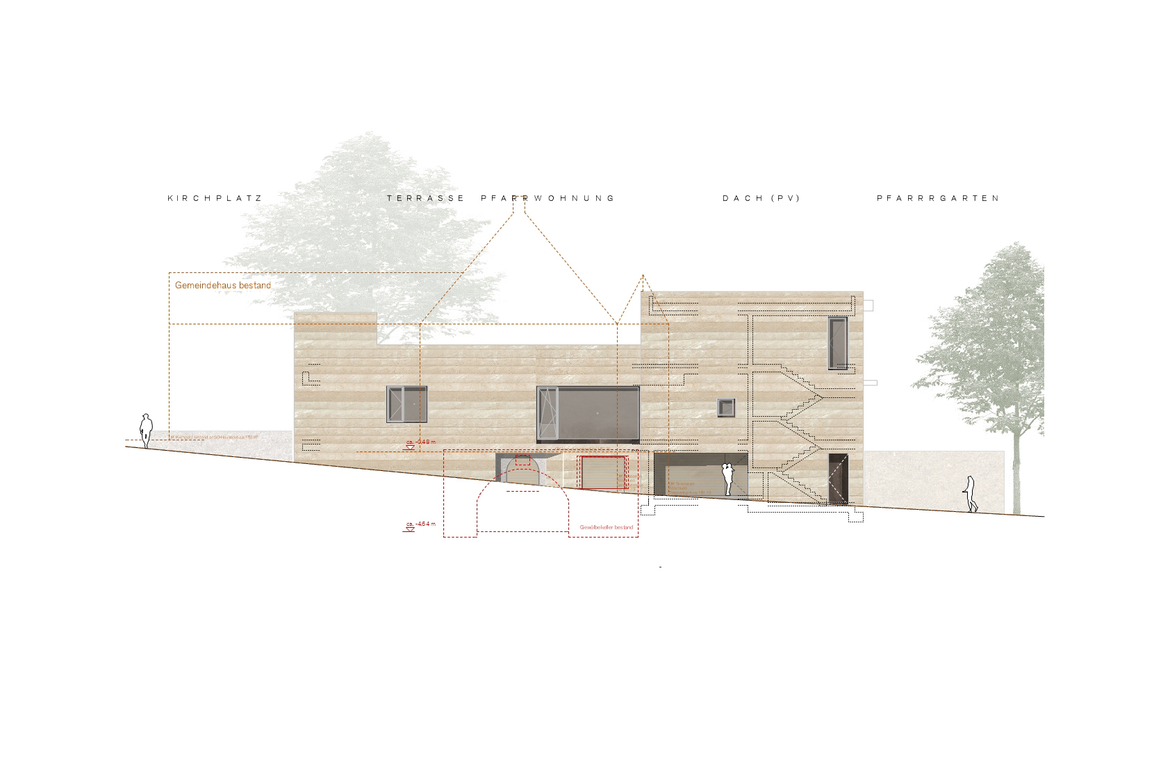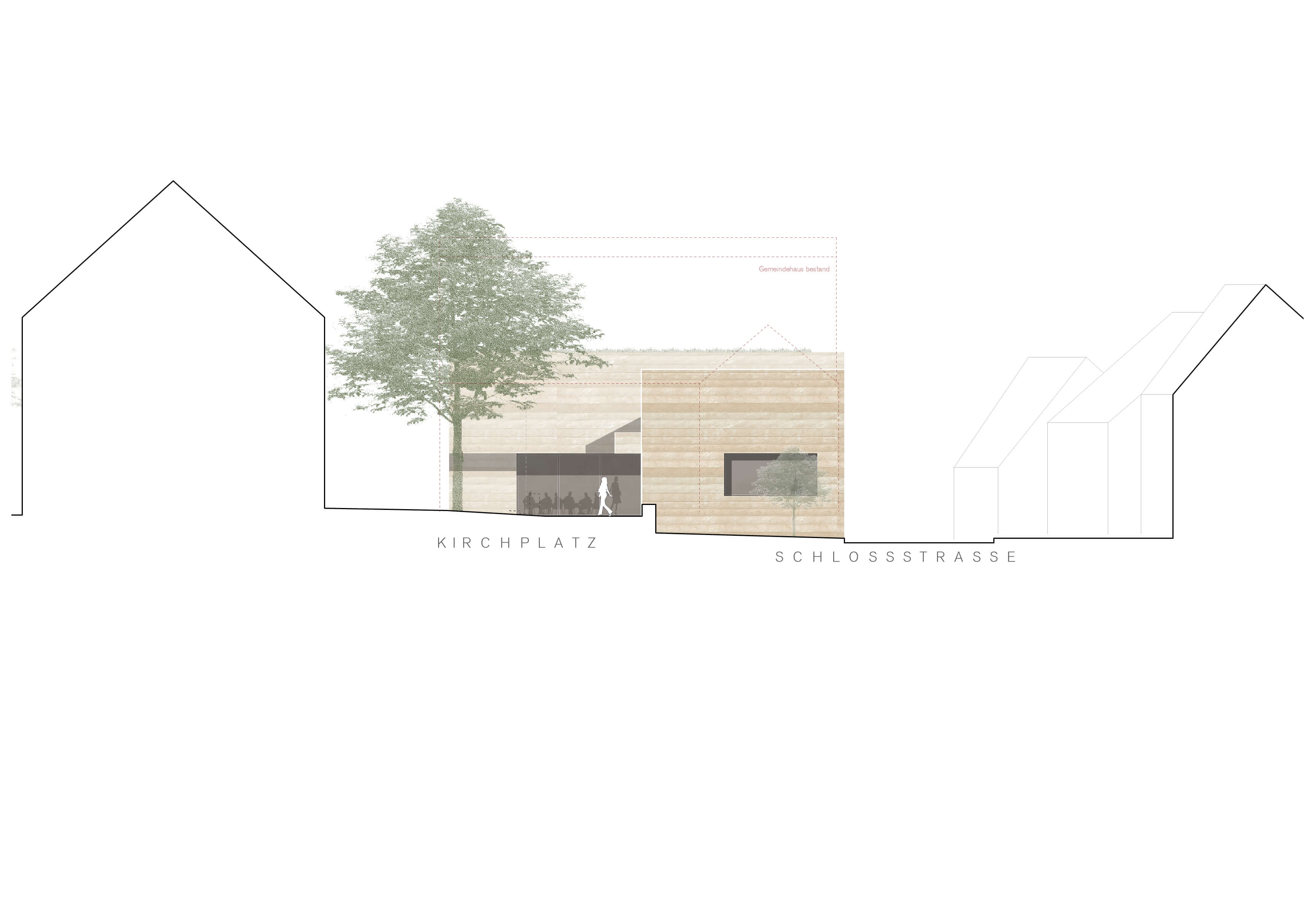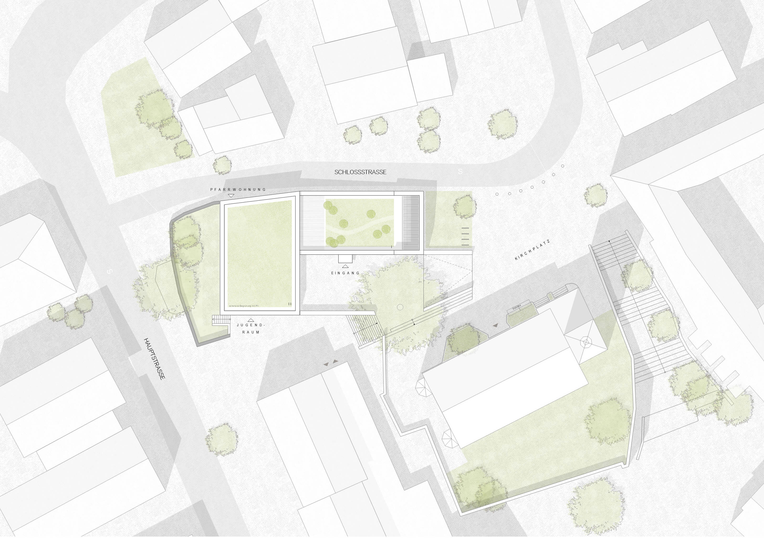 Der Neubau wird als winkelförmiger Baukörper der Sebastianskirche zur Seite gestellt und umschließt gemeinsam mit ihr den verkehrsfreien Kirchplatz. Das Haus besteht aus einem zweigeschossigen Kopfbau an der Hauptstraße und einem eingeschossigen Flügel entlang der Schlossstraße. Der Kopfbau erhält eine Unterkellerung, die durch die Topographie bedingt teilweise ebenerdig zugänglich ist. Er nutzt als Baufeld den derzeitigen Pfarrgarten an der vielbefahrenen Hauptstraße und dient dadurch als Lärmpuffer für den künftig deutlich vergrößerten Kirchplatz. Der prächtige Bestandsbaum soll als prägender Platzbaum erhalten werden.