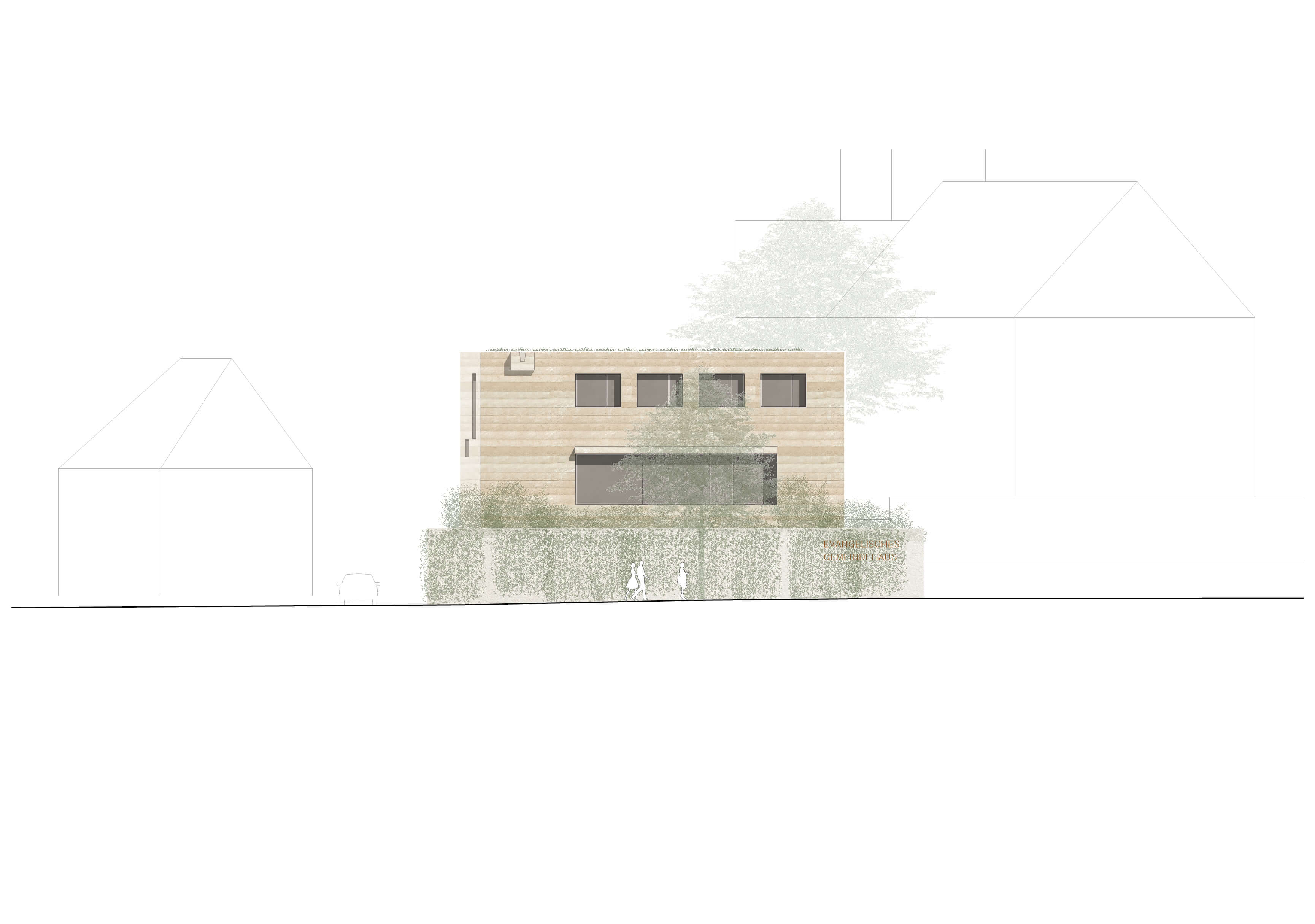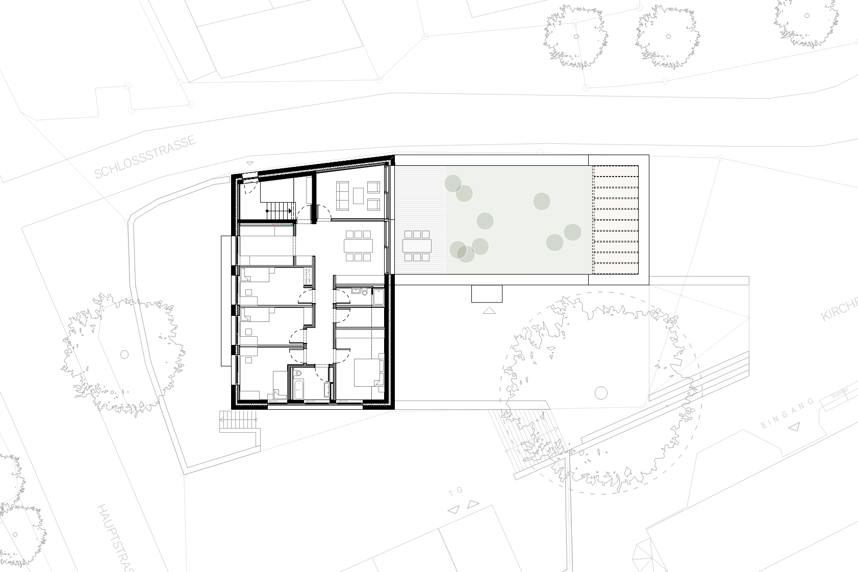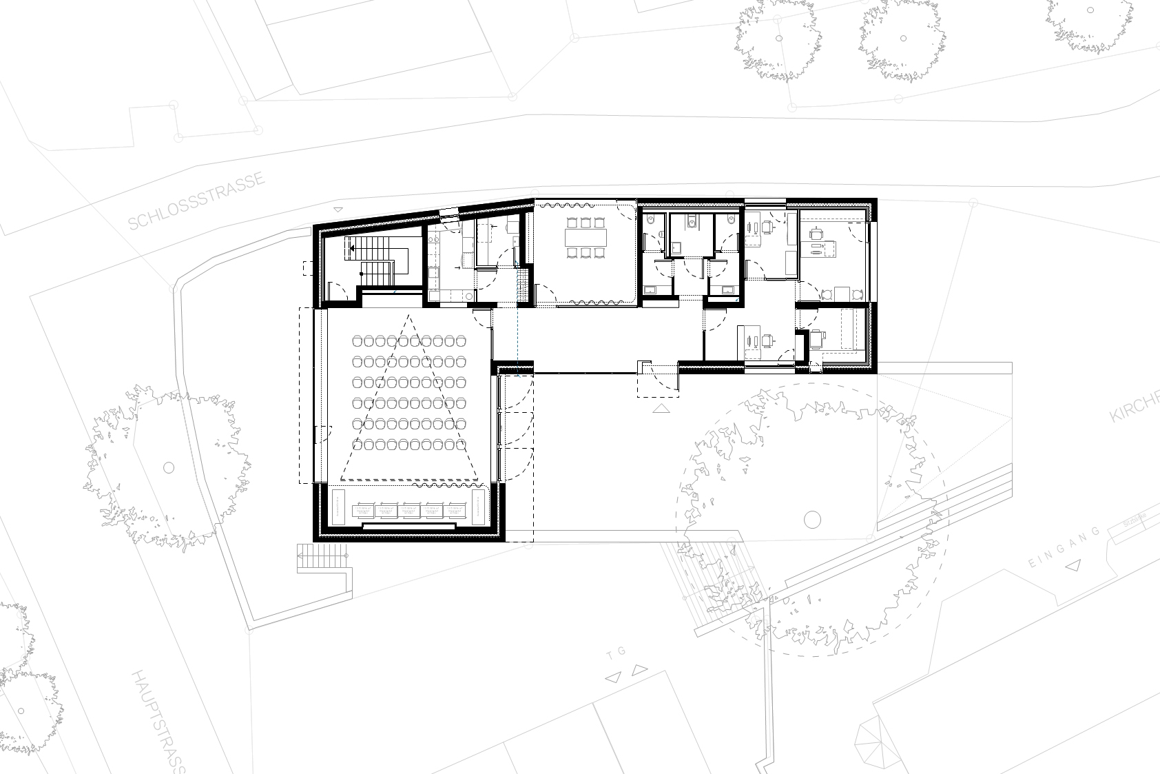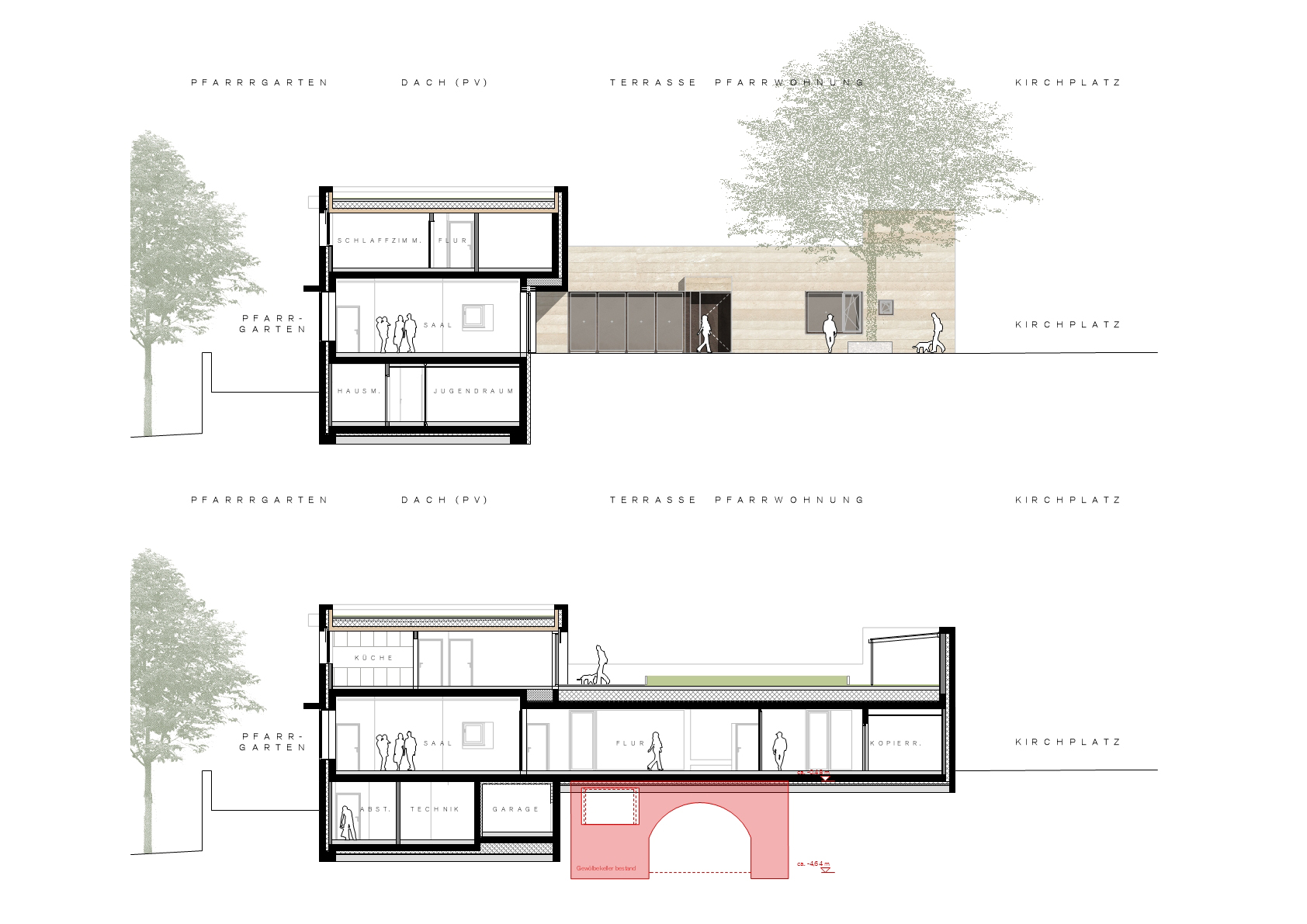 Der Neubau wird als winkelförmiger Baukörper der Sebastianskirche zur Seite gestellt und umschließt gemeinsam mit ihr den verkehrsfreien Kirchplatz. Das Haus besteht aus einem zweigeschossigen Kopfbau an der Hauptstraße und einem eingeschossigen Flügel entlang der Schlossstraße. Der Kopfbau erhält eine Unterkellerung, die durch die Topographie bedingt teilweise ebenerdig zugänglich ist. Er nutzt als Baufeld den derzeitigen Pfarrgarten an der vielbefahrenen Hauptstraße und dient dadurch als Lärmpuffer für den künftig deutlich vergrößerten Kirchplatz. Der prächtige Bestandsbaum soll als prägender Platzbaum erhalten werden.
