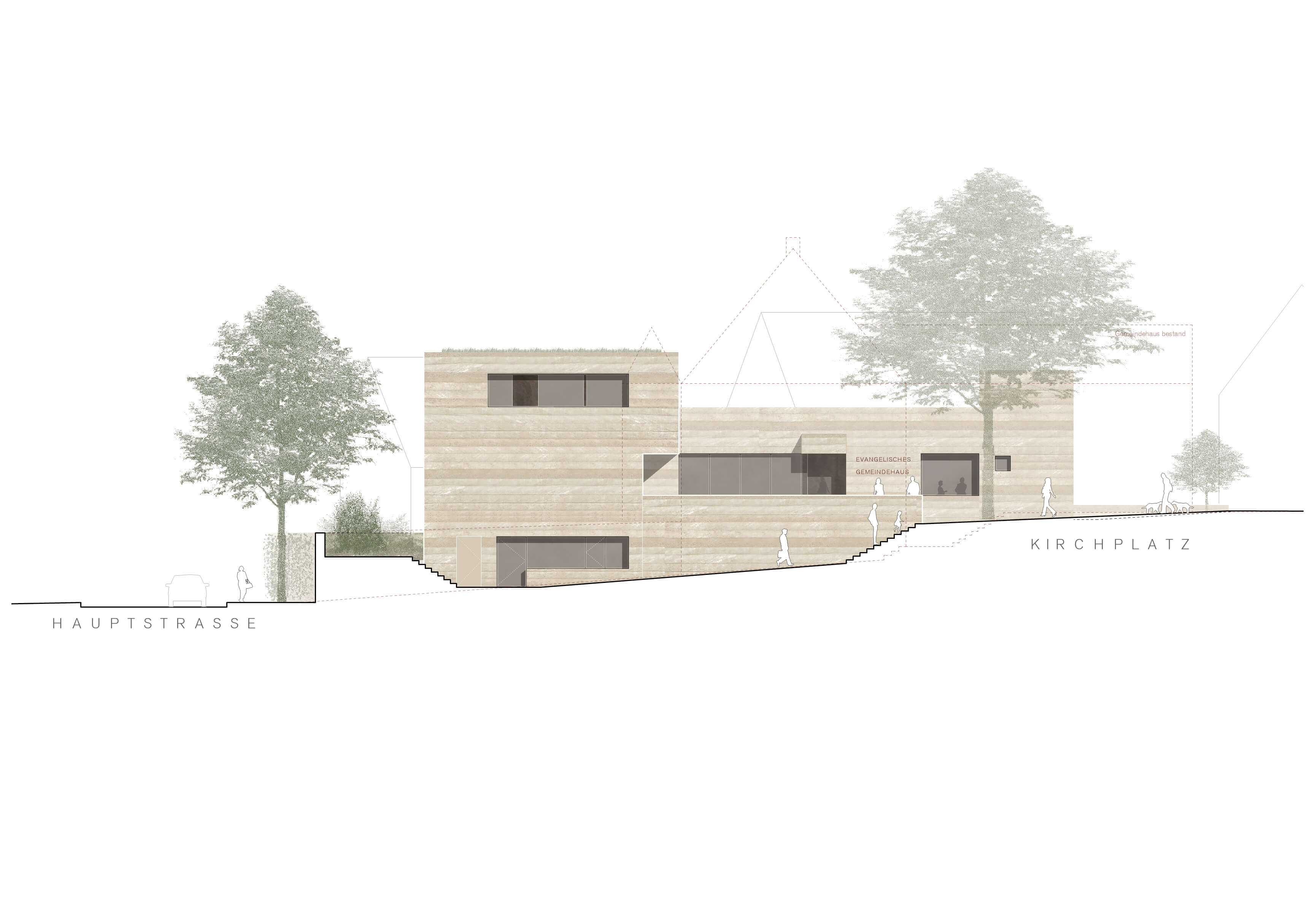 Der Neubau wird als winkelförmiger Baukörper der Sebastianskirche zur Seite gestellt und umschließt gemeinsam mit ihr den verkehrsfreien Kirchplatz. Das Haus besteht aus einem zweigeschossigen Kopfbau an der Hauptstraße und einem eingeschossigen Flügel entlang der Schlossstraße. Der Kopfbau erhält eine Unterkellerung, die durch die Topographie bedingt teilweise ebenerdig zugänglich ist. Er nutzt als Baufeld den derzeitigen Pfarrgarten an der vielbefahrenen Hauptstraße und dient dadurch als Lärmpuffer für den künftig deutlich vergrößerten Kirchplatz. Der prächtige Bestandsbaum soll als prägender Platzbaum erhalten werden.