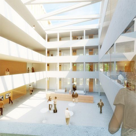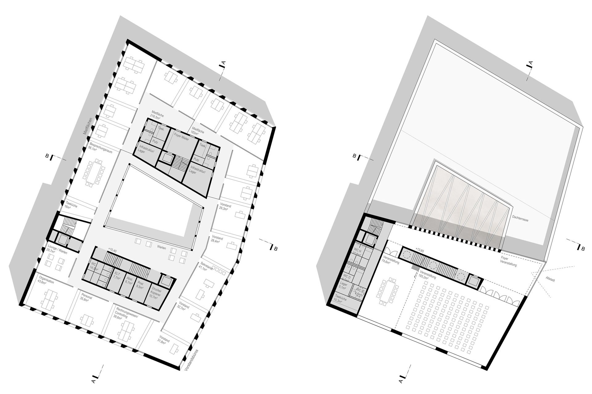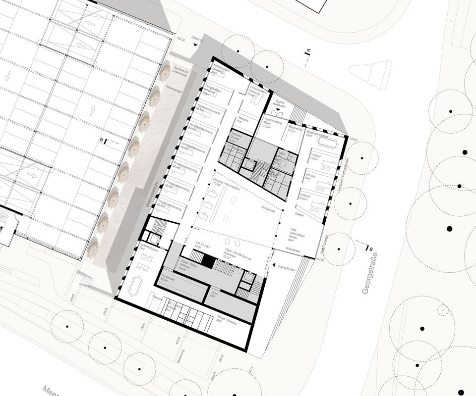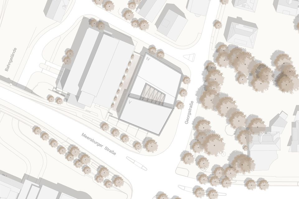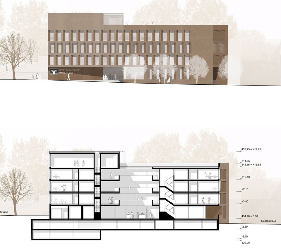 Der Neubau der Raiffeisenbank schließt die Lücke am südwestlichen Zugang zur Innenstadt Ravensburgs. Das Haus nimmt die städtebaulichen Fluchten auf und wird als skulpturaler Solitär entwickelt. Zwei erdgeschossige Einschnitte ins Volumen markieren die wettergeschützten Eingänge zum Gebäude. Der Zugang erfolgt im Kreuzungsbereich und formuliert die Adresse der Bank. Der viergeschossige Baukörper erhält an der Kreuzung ein fünftes Geschoss als städtebaulichen Akzent. Der hier verortete Veranstaltungsbereich profitiert von einer Dachterrasse mit Blick über die turmbestandene Altstadt. Der Neubau der Raiffeisenbank entwickelt sich um das zenital belichtete Atrium der Kundenhalle. Der Neubau wird als monolithischer Kunststein in einem warmen Braunton mit gestockter Oberfläche vorgesehen. Fensterlaibungen und Einschnitte werden poliert und erhalten so einen repräsentativen Charakter, während das Gebäudeganze mineralisch und matt erscheint.