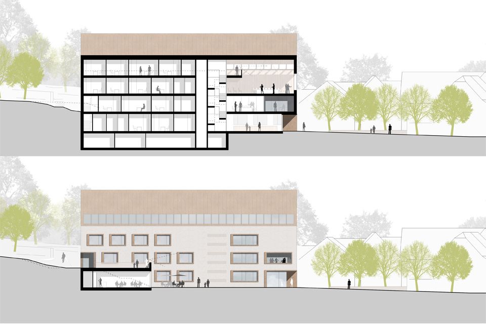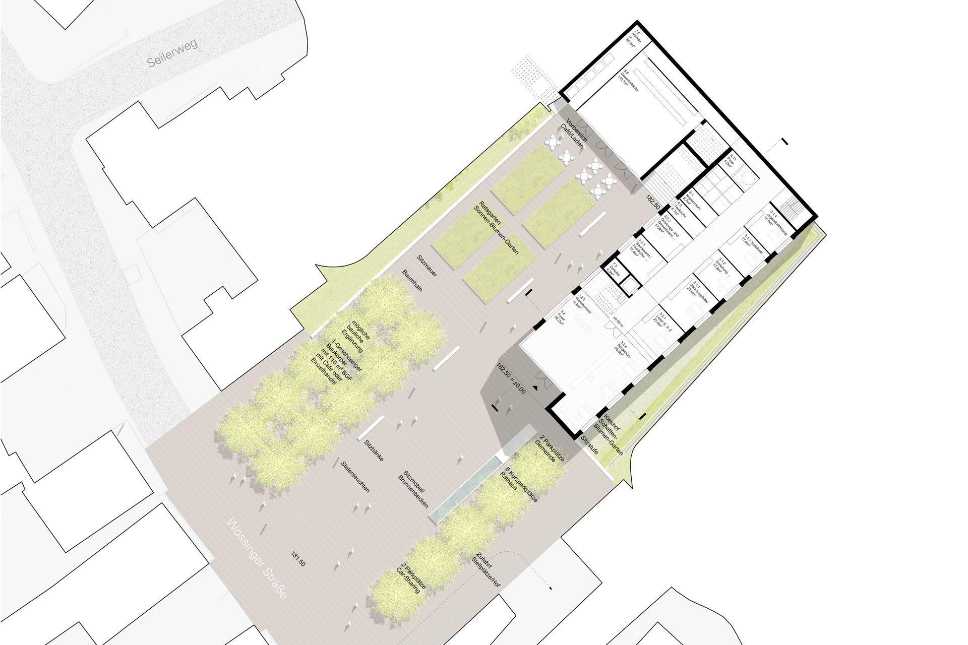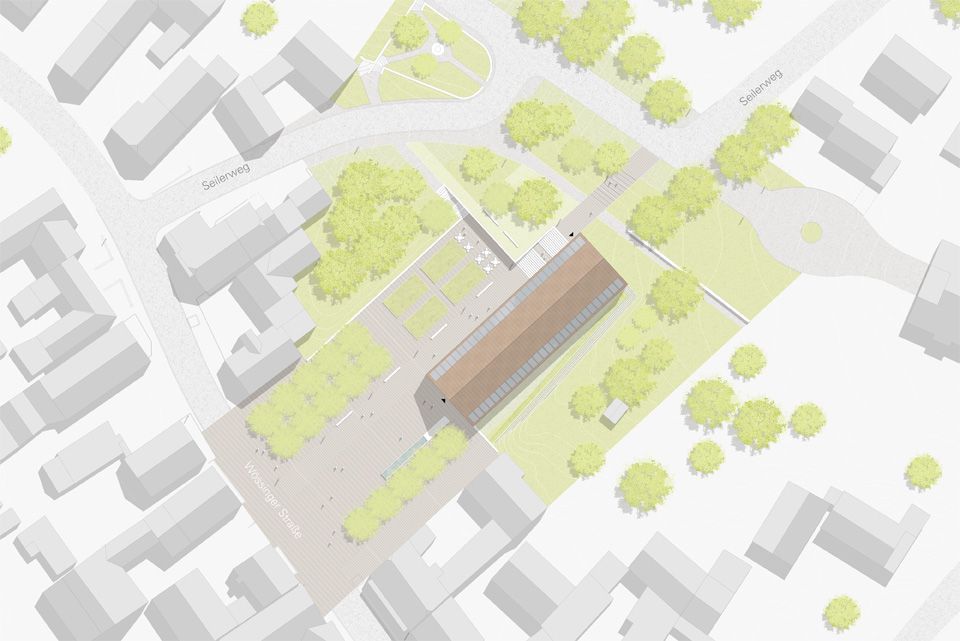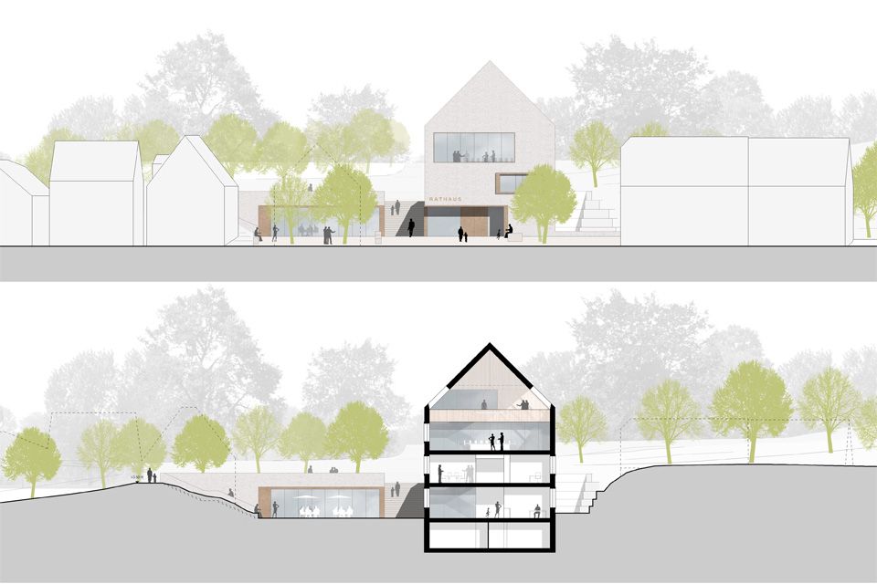 Der Rathausneubau wird als schlanker, giebelständiger Baukörper im Nordosteck des Grundstücks verortet. Durch seine langgestreckte Form ist er in der Lage, die Tiefe des Grundstücks zu bespielen. Zur Wössinger Straße hin setzt der markante Giebel einen baulichen Akzent und ist so im Stadtraum eindeutig als Rathaus zu erkennen. Der vorgelagerte Platz schafft ein angemessen repräsentatives Vorfeld für die kommunale Verwaltung. Durch sein Satteldach integriert sich der Neubau wie selbstverständlich in die kleinmaßstäbliche Bebauungsstruktur der Gemeinde und ist dennoch klar als zeitgenössisches Stück Architektur zu erkennen. In den mit einem hellen Kratzputz versehenen Baukörper sind serielle Fenster eingeschnitten, die jeweils von einem kräftigen Rahmen gefasst werden. Der Ratssaal unter dem Dach erhält ein großzügiges Panoramafenster mit Blick über die Gemeinde, dem Trauzimmer wird ein Hochzeitsbalkon mit Blick zur Kirche zugeordnet.