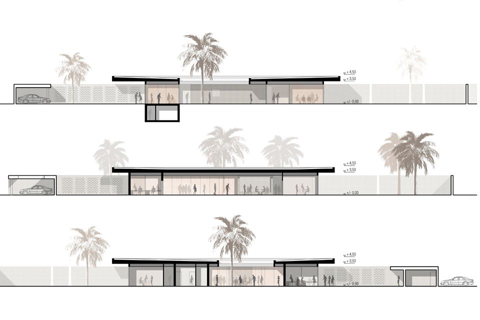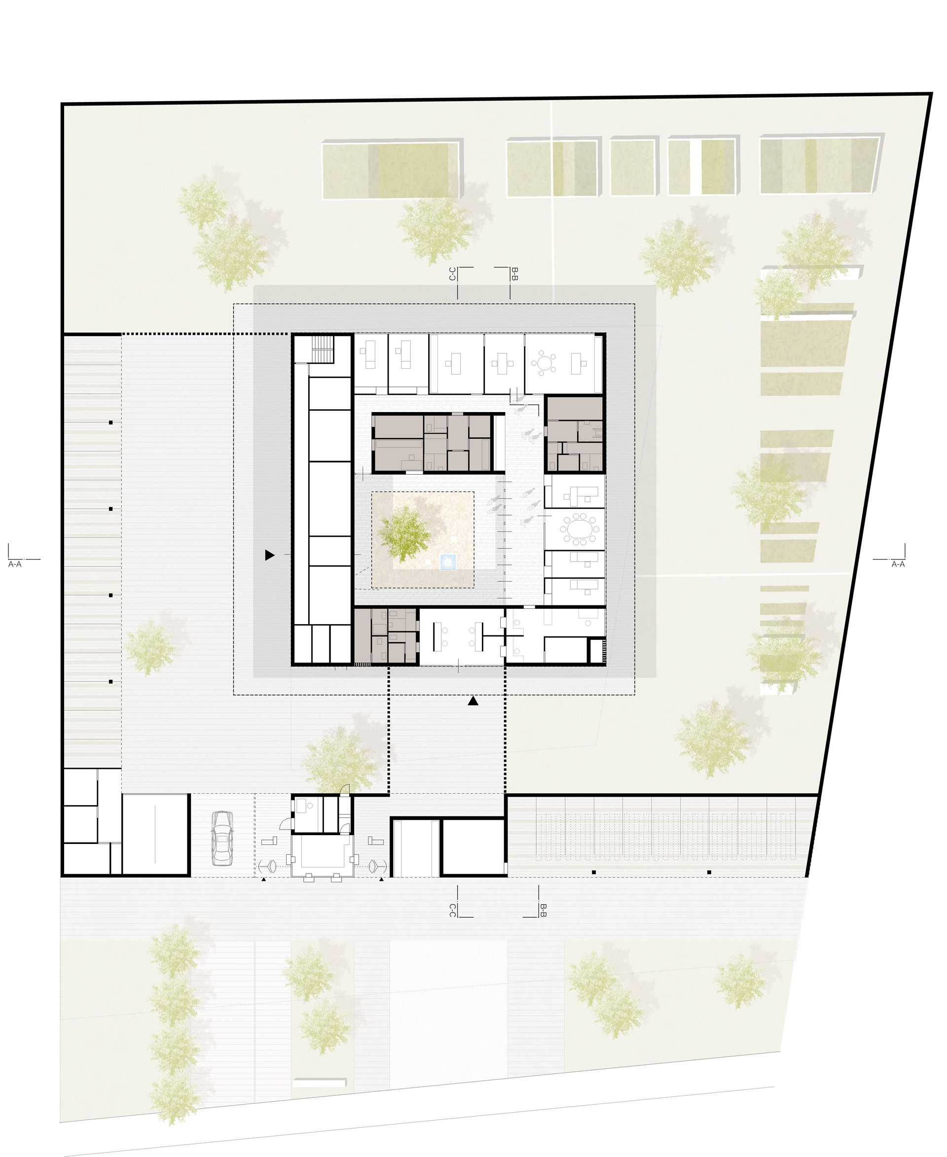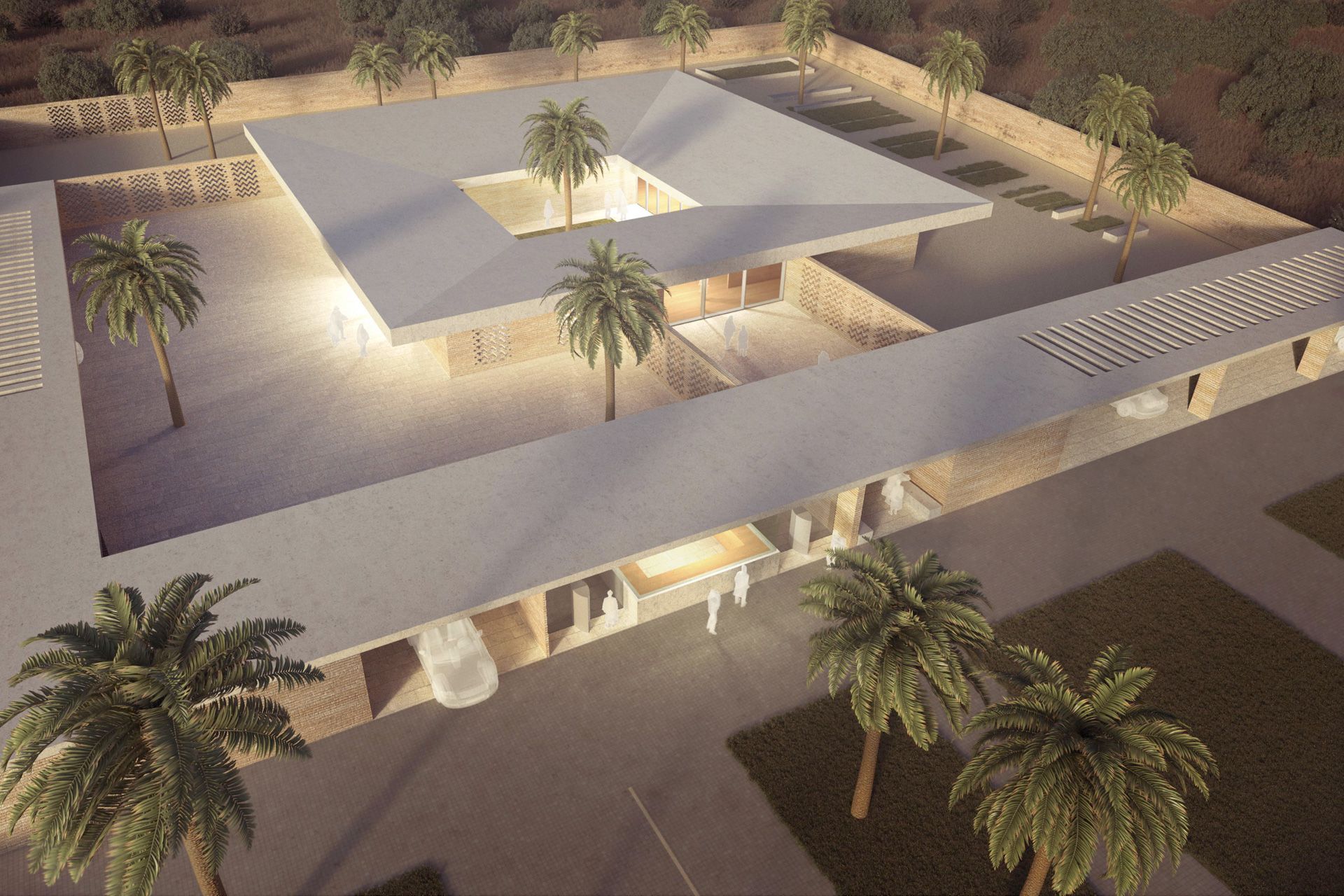 Die gemauerte Einfriedung der Kanzlei wird als raumhaltige Schicht interpretiert, in die die Schleuse, Nebenräume, ein beschatteter Wartebereich für die Visastelle und Stellplätze eingearbeitet sind. Das Kanzleigebäude zeigt sich als eingeschossiger Pavillon mit Innenhof und markant auskragendem Vordach. Sein Grundriss wird durch einige Kuben gegliedert, welche die Nebenfunktionen aufnehmen. Zwischen diesen Kuben ergeben sich fließende Raumübergänge, die die repräsentativen Funktionen beherbergen. Nach dem Passieren der Schleuse durchquert der Besucher den geschützten Innenhof, bevor er ins Foyer der Kanzlei gelangt. Der reizvolle Innenhof wird zum typologischen Herzen des Hauses. Das weit auskragende Vordach wird als brettergeschalte Betonkonstruktion ausgeführt, die auf den massiv aufgemauerten Kuben aus sonnengetrockneten Lehmziegeln aufliegt. In ausgewählten Bereichen wird dieses Mauerwerk als Filterschicht mit einzelnen Fehlziegeln erstellt.