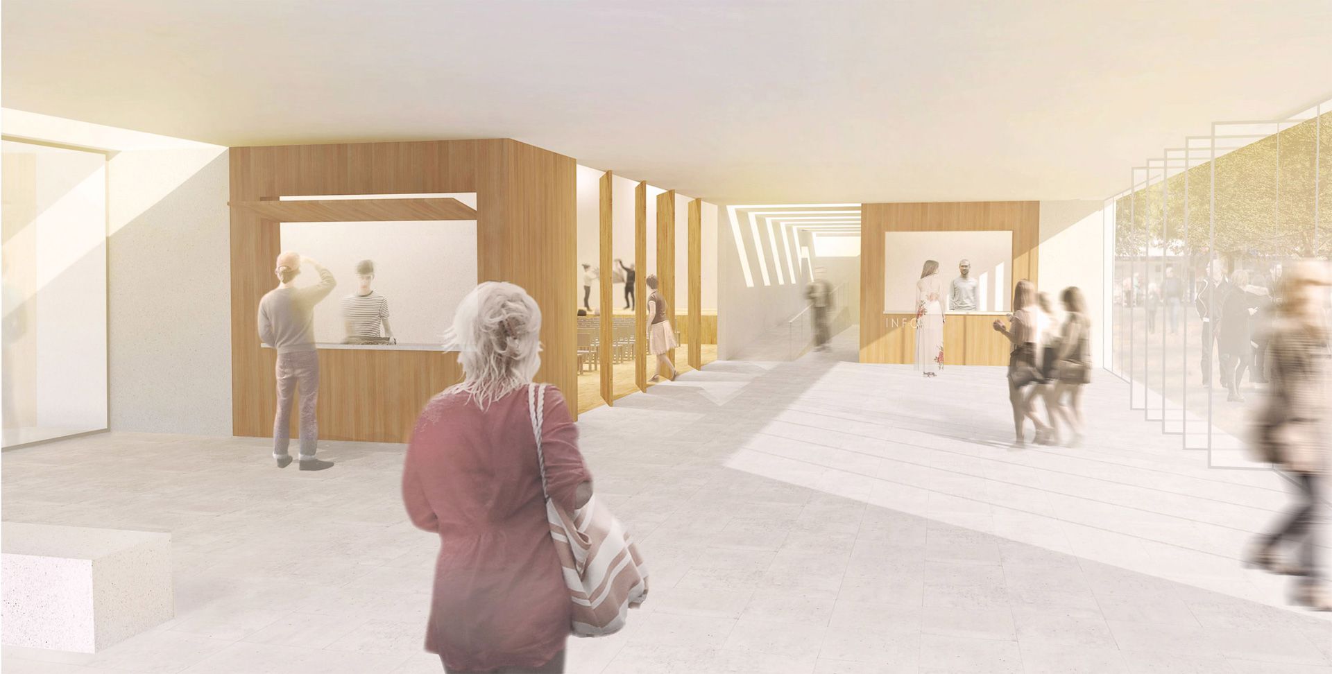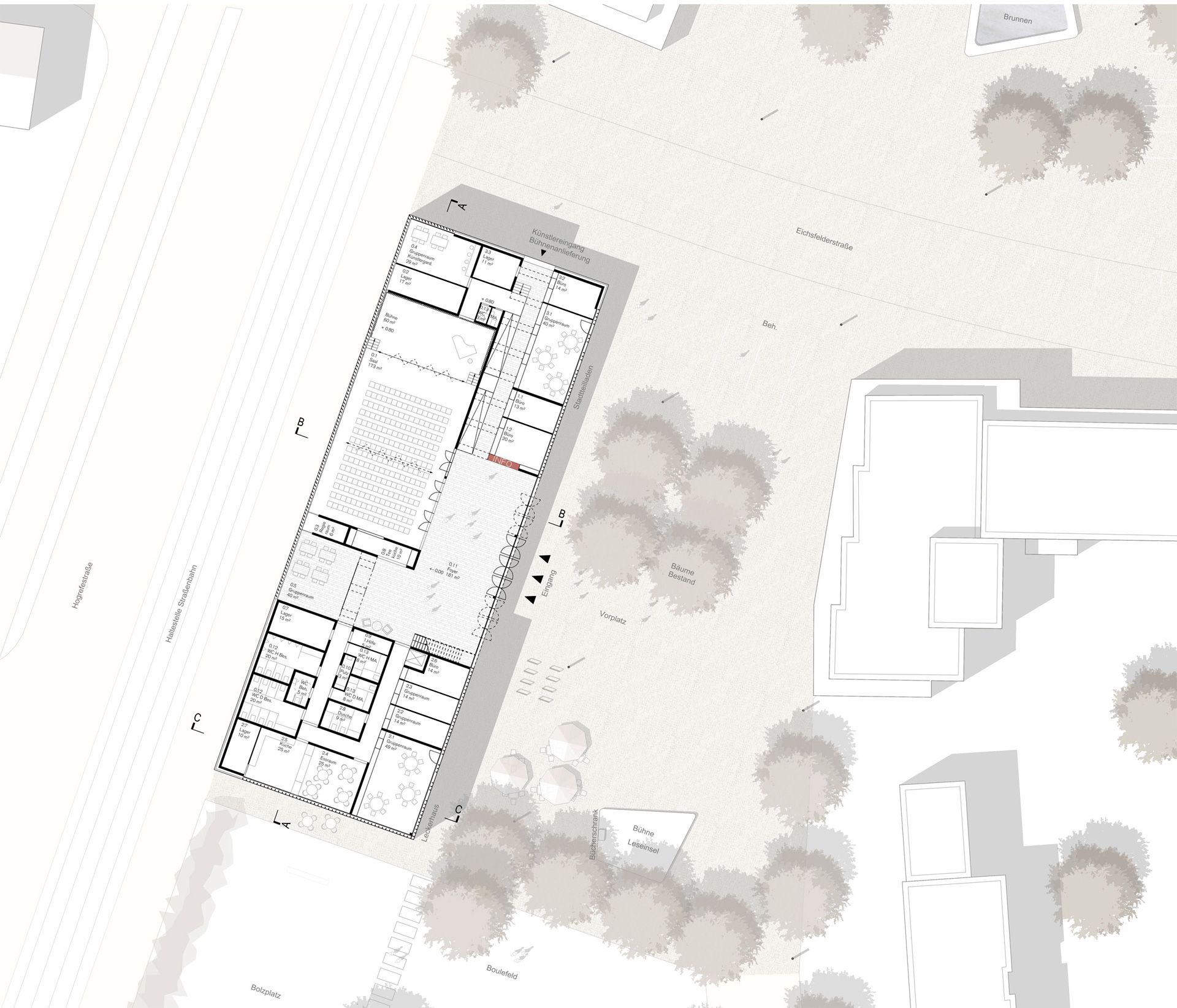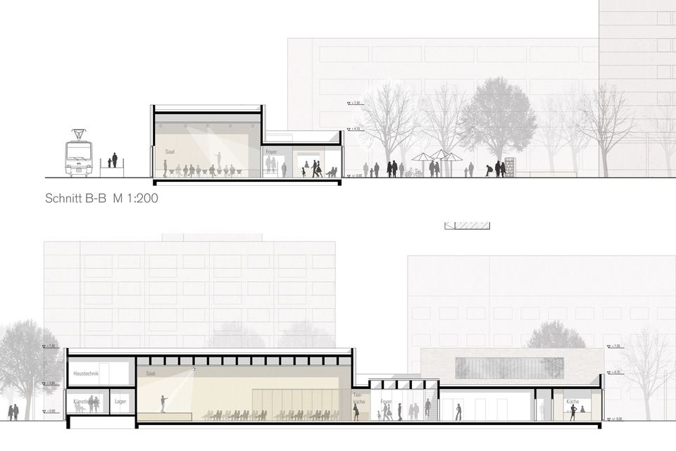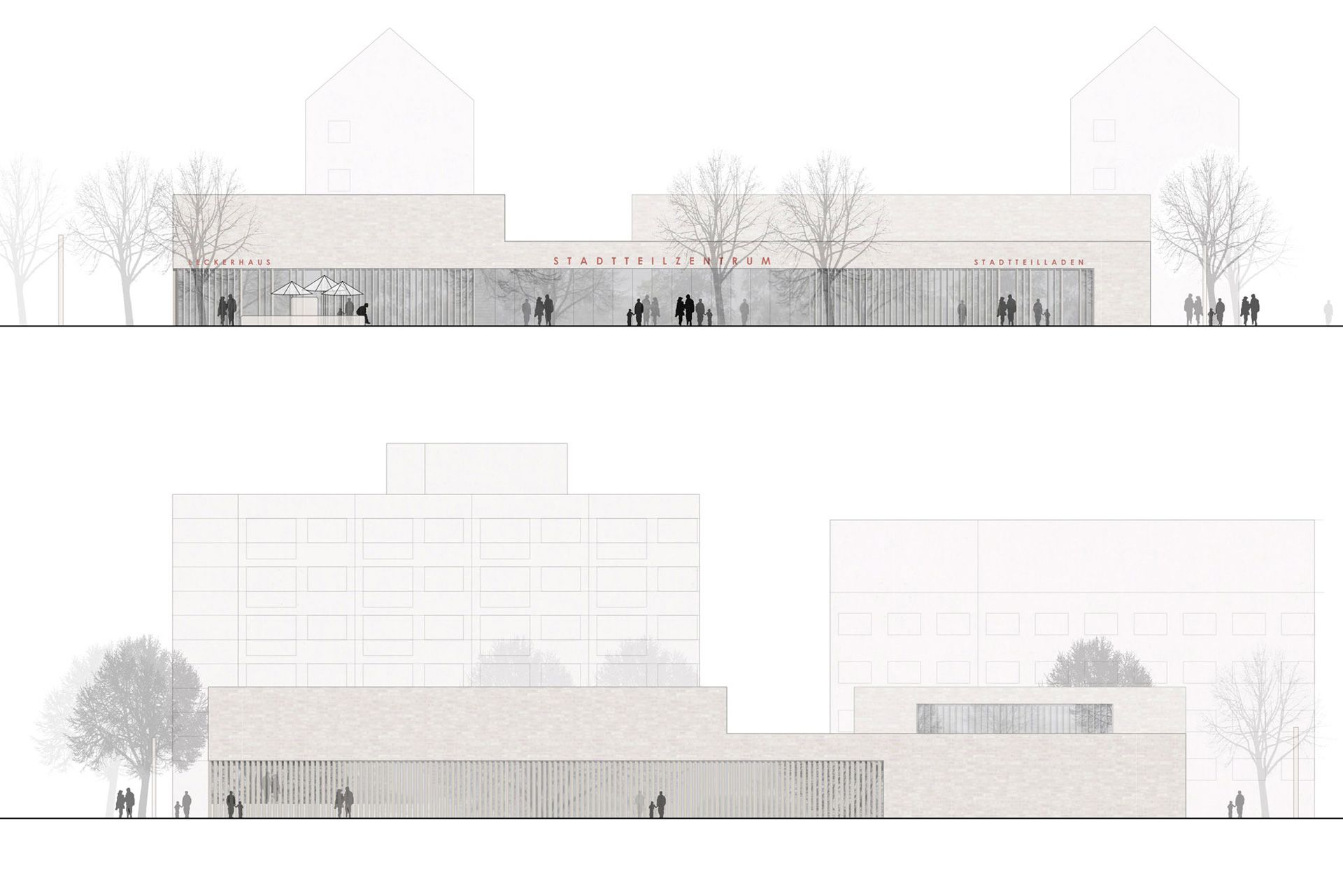 Der langgestreckte Baukörper des Stadtteilzentrums wird entlang der Hogrefestraße angeordnet. So gelingt es einerseits den Straßenraum zu fassen und andererseits, einen großzügigen geschützten Platz auf der Ostseite des Hauses zu formulieren. Aus dem eingeschossigen Baukörpersockel erheben sich über die Diagonale versetzt angeordnet zwei doppelgeschossige Volumen, die die Gebäudeecken akzentuieren. Der große Saal besetzt den Kreuzungsbereich und formuliert mit dem gegenüber angeordneten Gebäude eine Torsituation zum Stöckener Markt, während die Verwaltung an der Südostecke des Hauses das südliche Ende des neu geschaffenen Platzes markiert. Sämtliche Funktionen sind so im Haus verortet, dass sie mit dem umgebenden Stadtraum interagieren und somit eine intensive Vernetzung von Haus und Stadtteil ermöglichen. Die horizontale Lineatur der geschlämmten Klinkerfassade unterstreicht die Horizontalität des gesamten Hauses.