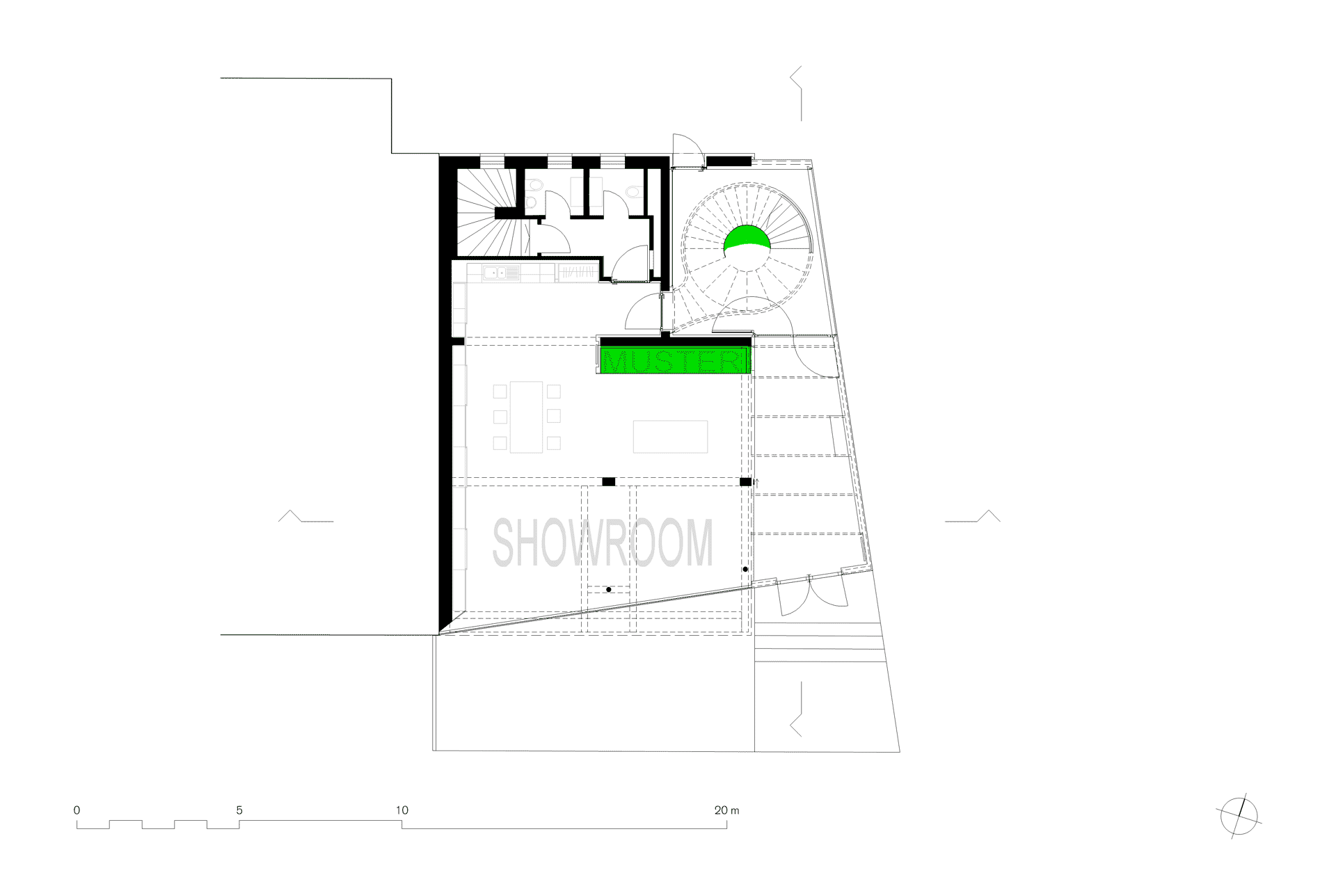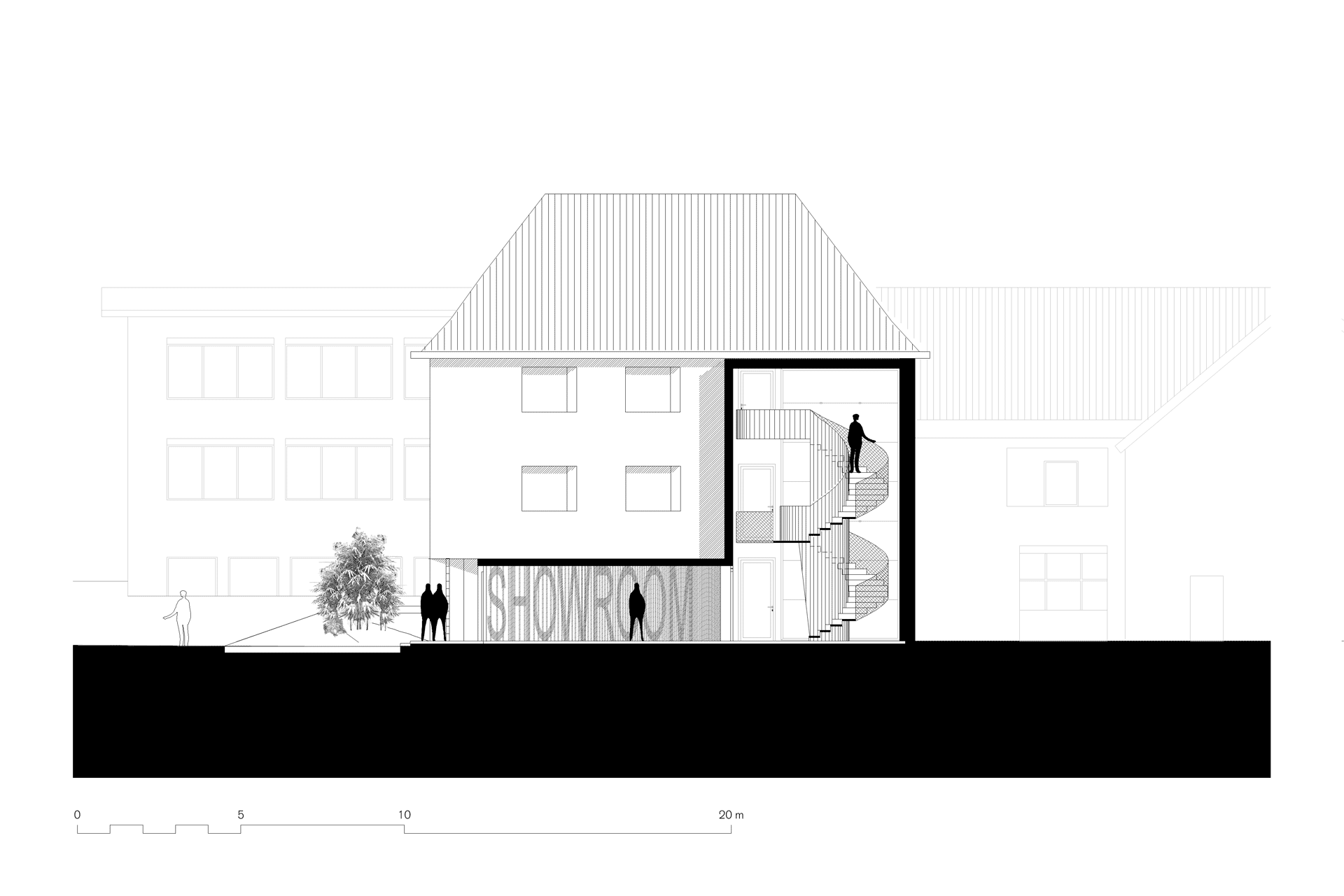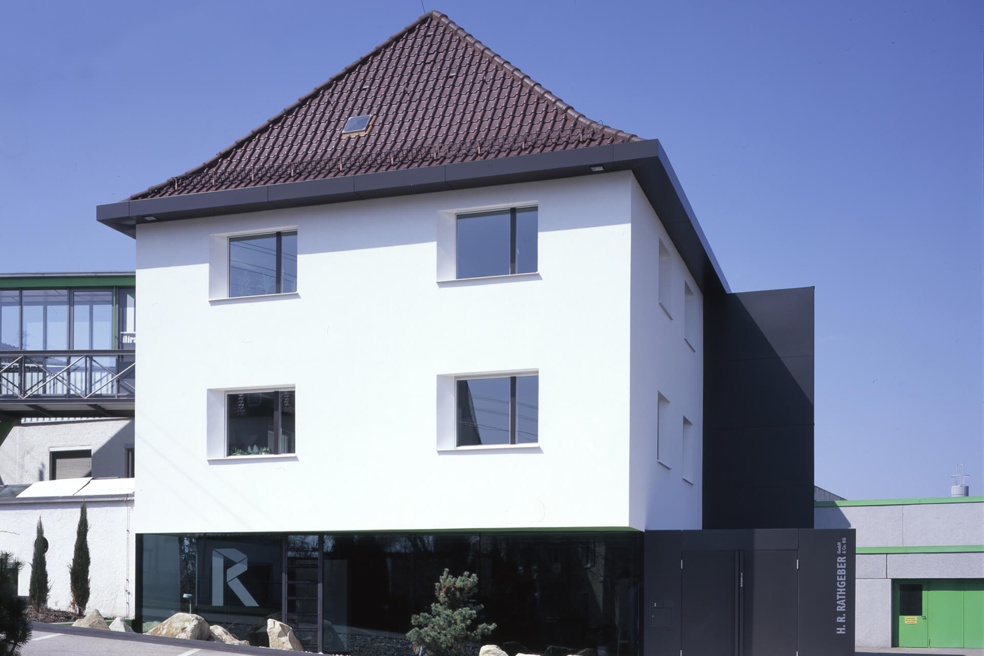 In einem ehemaligen Wohngebäude aus den 1940er Jahren ist die Verwaltung einer mittelständischen Gurtweberei untergebracht. Da das Familienunternehmen Rathgeber in zunehmendem Maße mit internationalen Möbeldesignern zusammenarbeitet, sollten im bislang ungenutzten Erdgeschoss des Gebäudes die Produkte des Unternehmens ausgestellt und Workshops abgehalten werden. Ein prismatisches, scharf geschnittenes Volumen aus Glas und Stahl durchdringt den auf seine Primärform zurückgeführten Altbau. Die kontrastierende Materialität von Alt und Neu schafft ein gestalterisch anregendes Umfeld. Eine repräsentative Wendeltreppe erschließt die Büros in den Obergeschossen.