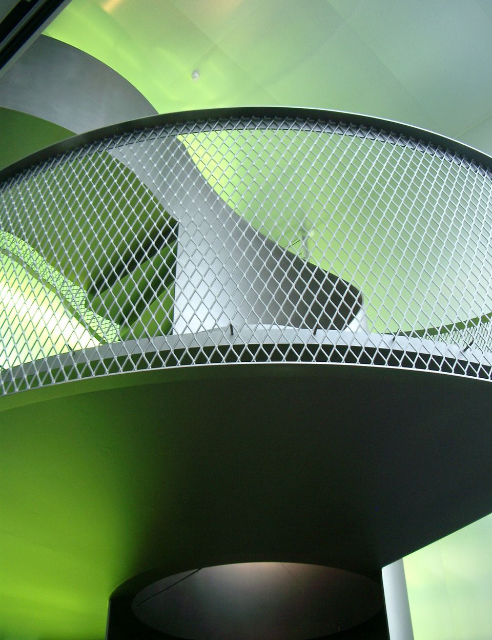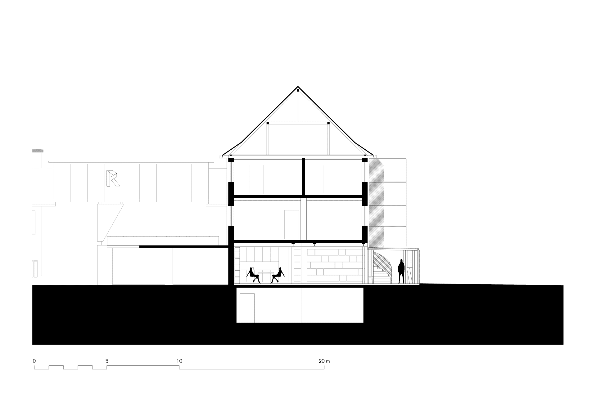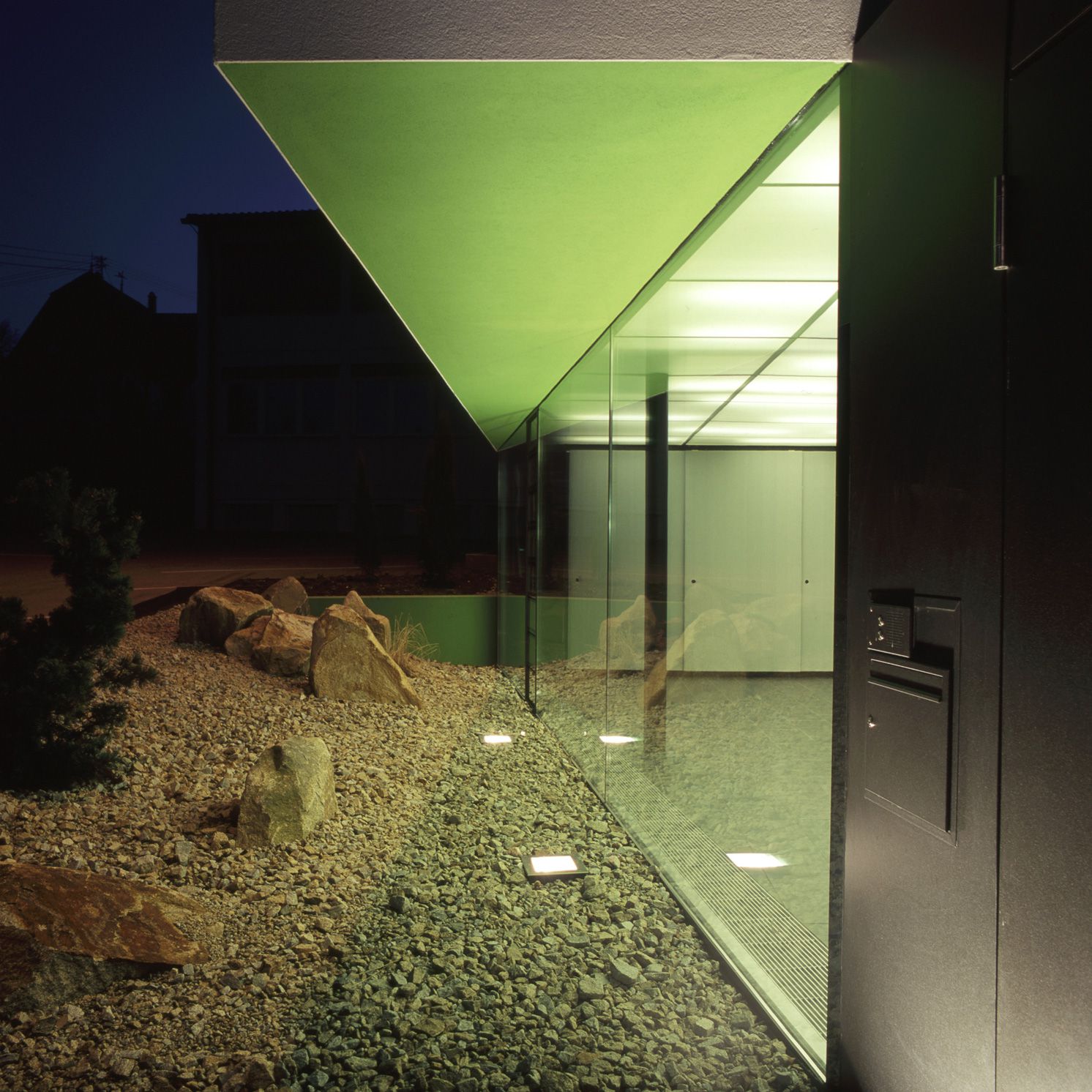 In einem ehemaligen Wohngebäude aus den 1940er Jahren ist die Verwaltung einer mittelständischen Gurtweberei untergebracht. Da das Familienunternehmen Rathgeber in zunehmendem Maße mit internationalen Möbeldesignern zusammenarbeitet, sollten im bislang ungenutzten Erdgeschoss des Gebäudes die Produkte des Unternehmens ausgestellt und Workshops abgehalten werden. Ein prismatisches, scharf geschnittenes Volumen aus Glas und Stahl durchdringt den auf seine Primärform zurückgeführten Altbau. Die kontrastierende Materialität von Alt und Neu schafft ein gestalterisch anregendes Umfeld. Eine repräsentative Wendeltreppe erschließt die Büros in den Obergeschossen.