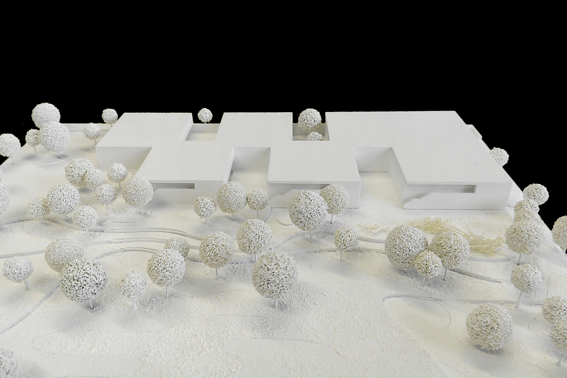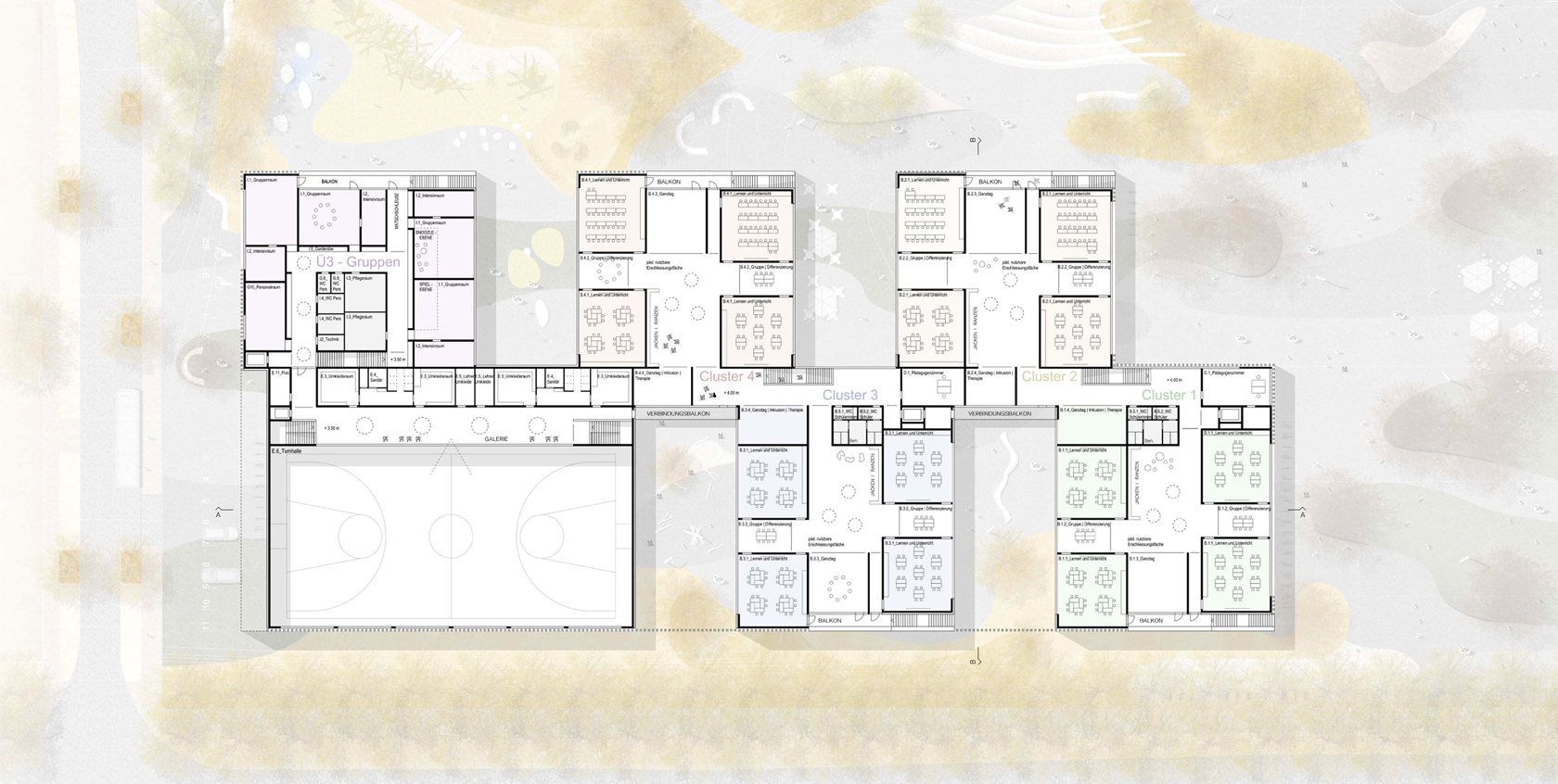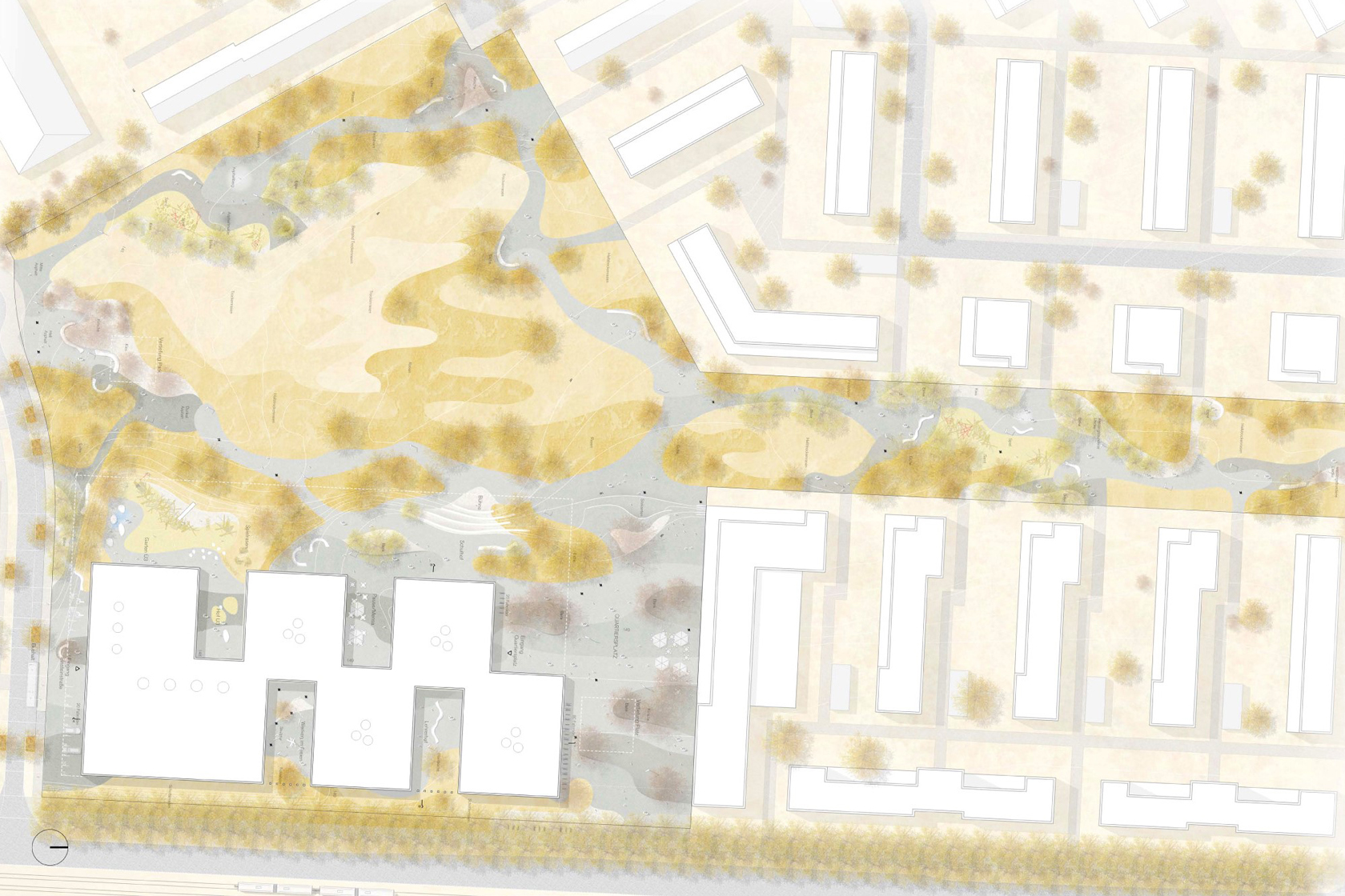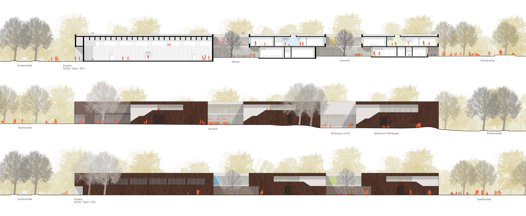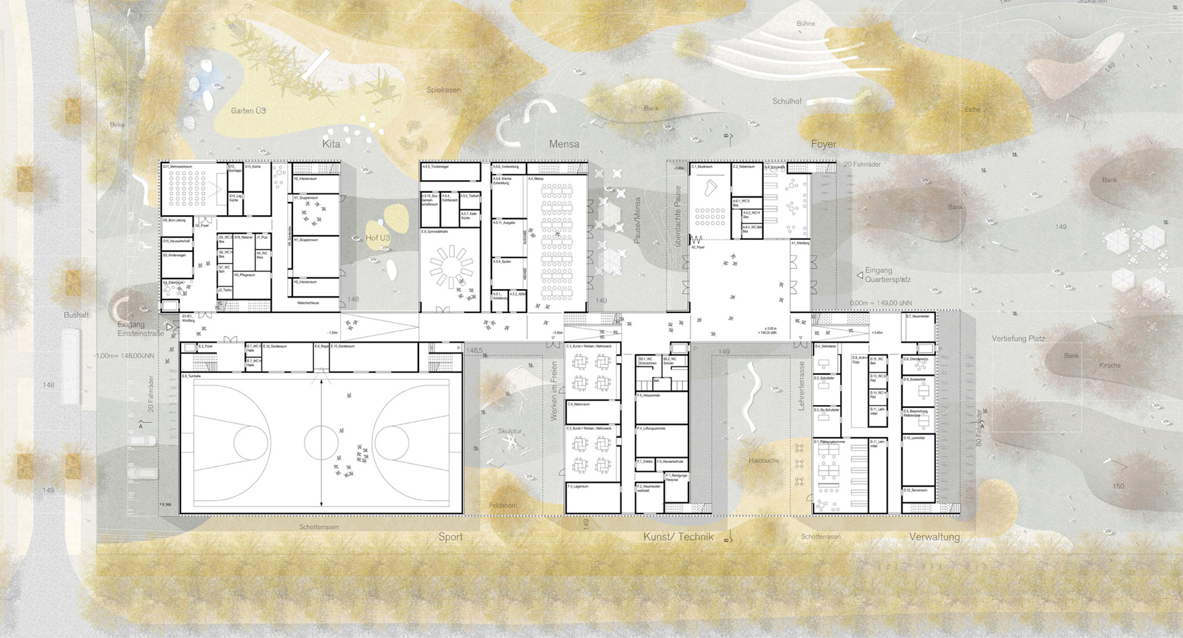 Der Neubau von Schule, Kita und Sporthalle bildet den zentralen identitätsstiftenden Baustein der Quartiersmitte der Lincoln-Siedlung. Um die städtebauliche Situation zu stärken, besetzt der zweigeschossige Baukörper nach Norden, Osten und Süden hin die in der Rahmenplanung vorgegebenen Baufluchten. An der Westseite bleibt das Gebäude um einige Meter zurück und verzahnt sich mit dem angrenzenden Quartierspark. Die regelmäßig eingeschnittenen Innenhöfe verleihen dem Haus eine dem Quartier angemessene Massstäblichkeit. Schule, Sporthalle und Kita liegen an einer gemeinsamen internen Schulstraße mit gleichwertigen Zugängen am Quartiersplatz im Norden und an der Zufahrt im Süden. Die Grundschule besetzt den nördlichen Teil der Parzelle, während die Kita an der geschützten Südwestecke angeordnet wird. Die Sporthalle an der Südostecke bildet einen Puffer zur Heidelberger Straße. Die Grundschule ist kindgerecht über lediglich zwei Etagen entwickelt. Im Erdgeschoss befinden sich die übergeordneten Funktionsbereiche Mensa, Bibliothek und Verwaltung, während im Obergeschoss die Jahrgangshäuser verortet sind. Die äußere Fassadenkontur der Schule erhält eine Bekleidung mit vertikalen Keramikelementen, die dem Gebäude eine feine Lineatur verleiht. Im Bereich der eingeschnittenen Höfe ist ein heller Kratzputz vorgesehen.