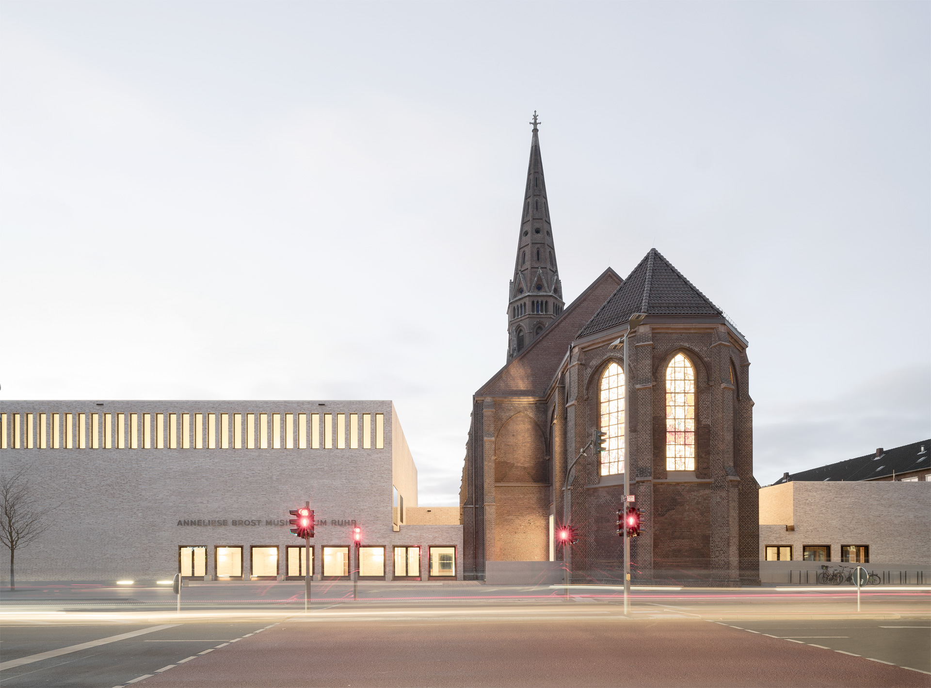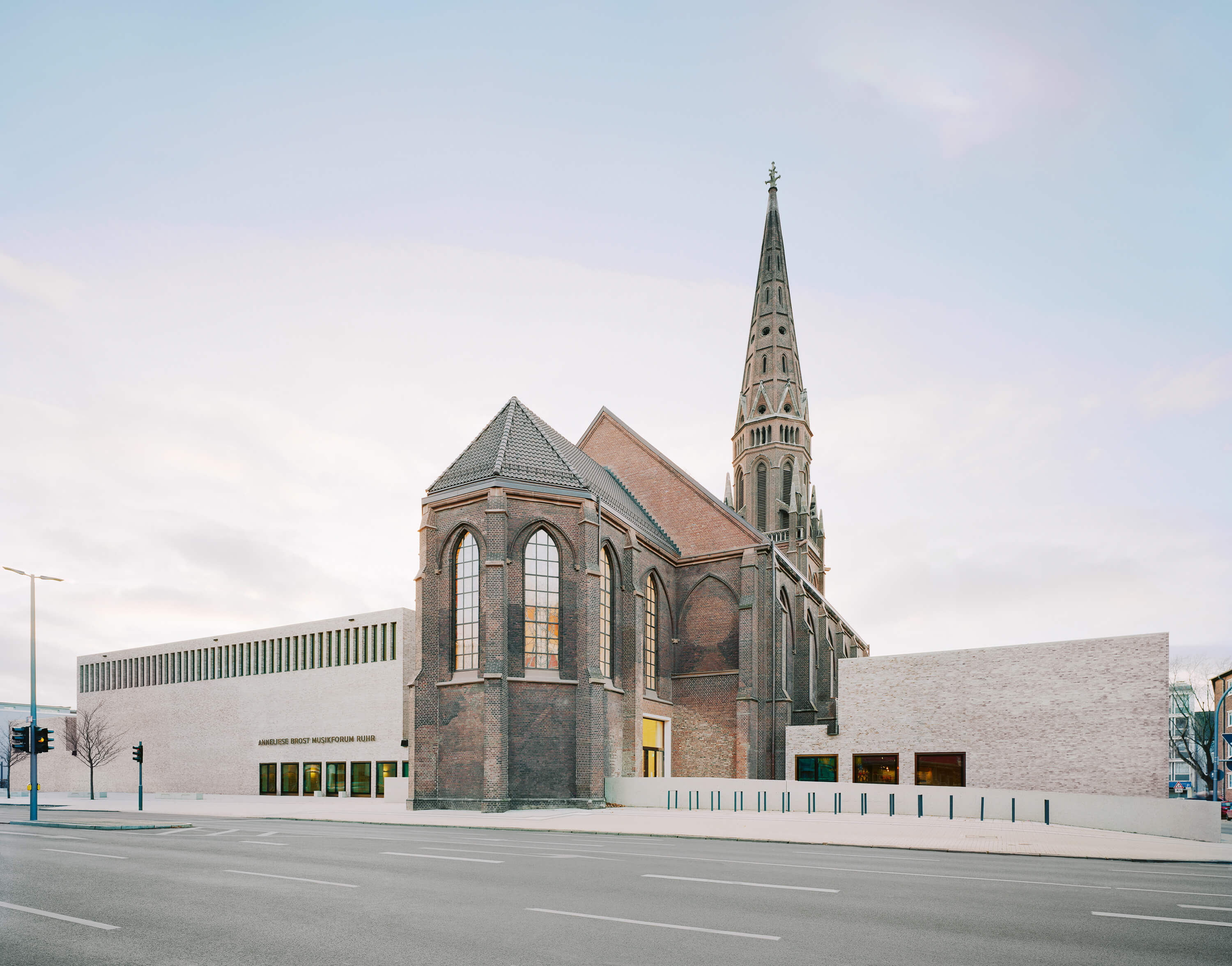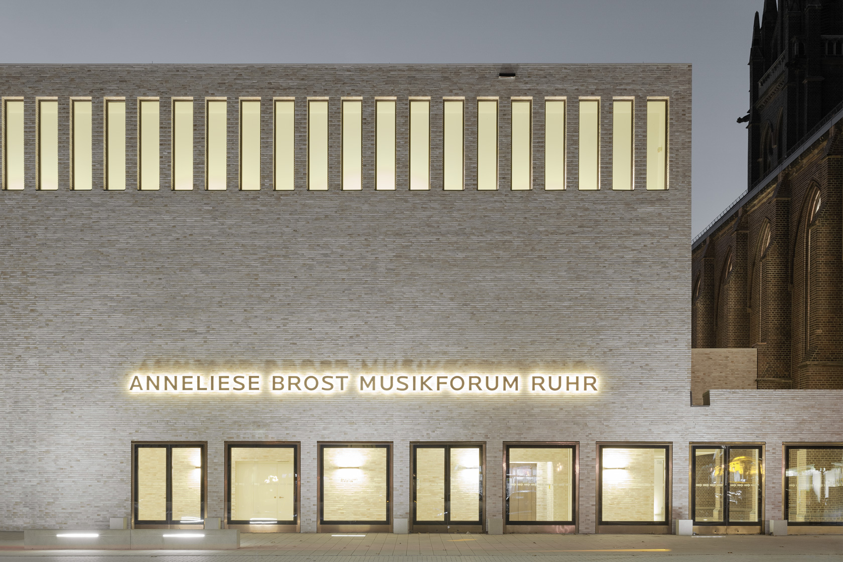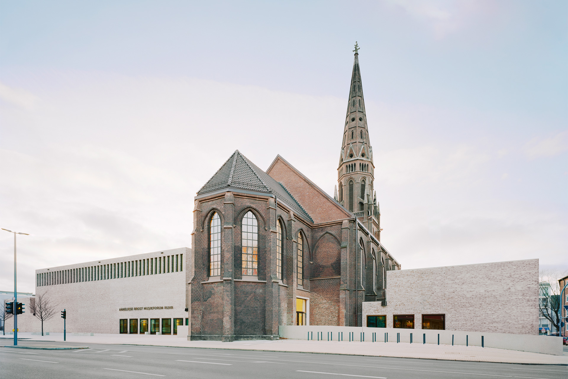 Der Neubau des Musikforums Bochum stellt einen wichtigen öffentlichen Baustein bei der Entwicklung des innerstädtischen Kreativquartiers Viktoriastraße in Bochum dar. Die profanierte, historische Marienkirche ist als zentrales Foyer des Hauses Identität stiftender, städtebaulicher und funktionaler Mittelpunkt des Musikforums. Zu beiden Seiten der Kirche wurden Baukörper angeordnet, die sich unmittelbar an der Länge des Kirchenschiffs orientieren und sich innenräumlich mit diesem verzahnen. Die Höhenentwicklung entlang der Viktoriastraße staffelt sich in Abhängigkeit der innenräumlichen Anforderungen und verleiht dem Gebäude so eine angemessene Maßstäblichkeit im Stadtraum. Auf der Südseite der 1872 errichteten Kirche befindet sich der Konzertsaal der Bochumer Symphoniker mit etwa 1000 Sitzplätzen und hochwertiger akustischer Ausstattung, auf ihrer Nordseite ein flexibel bespielbarer Multifunktionssaal für die Musikschule.