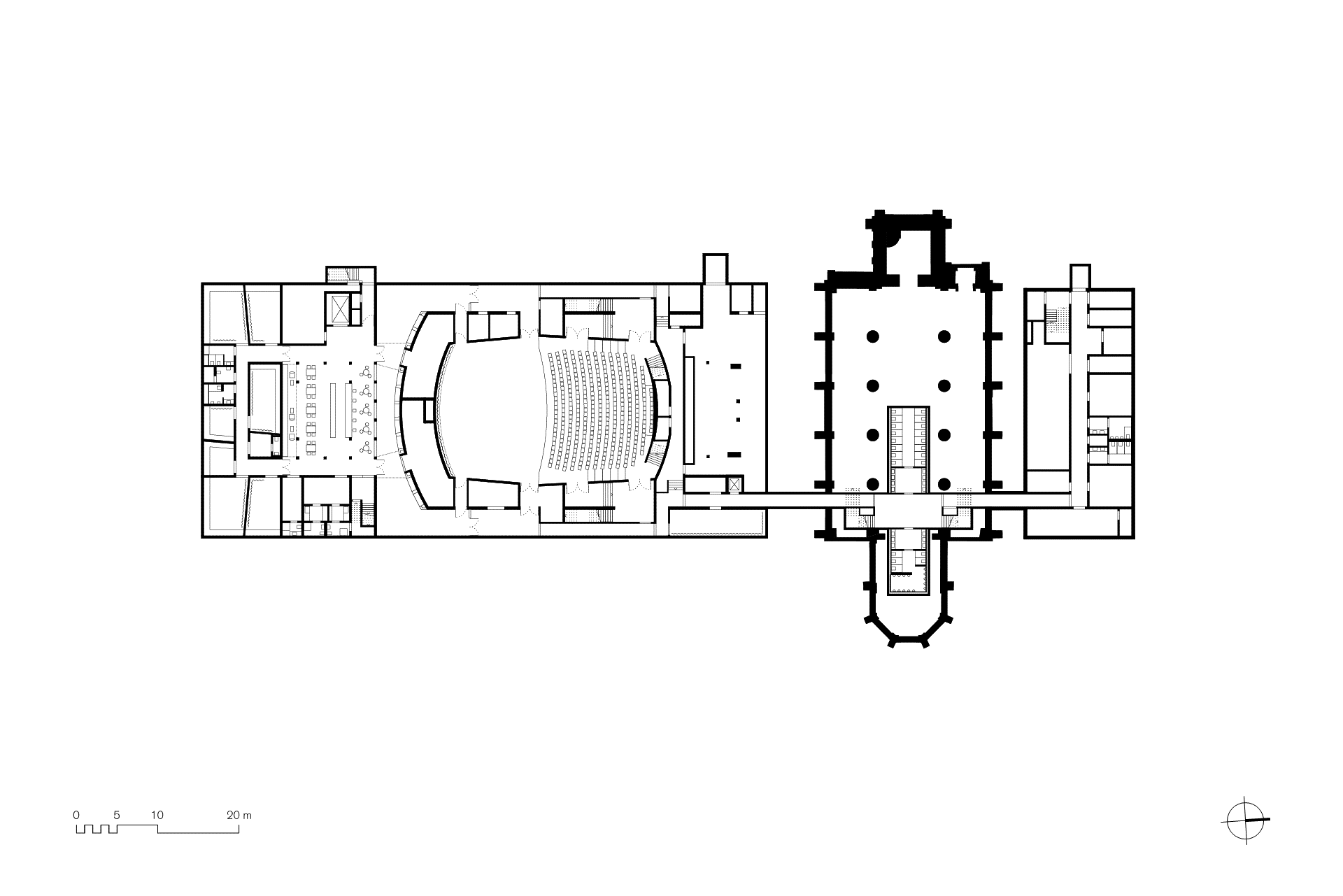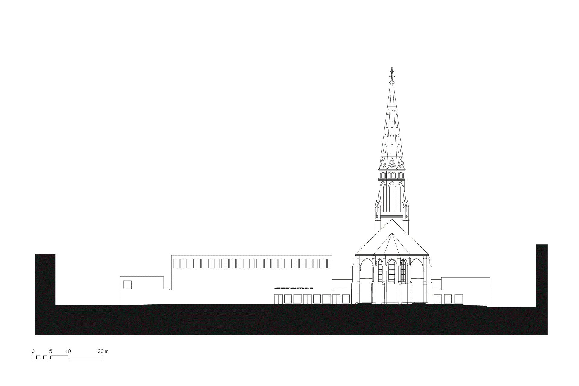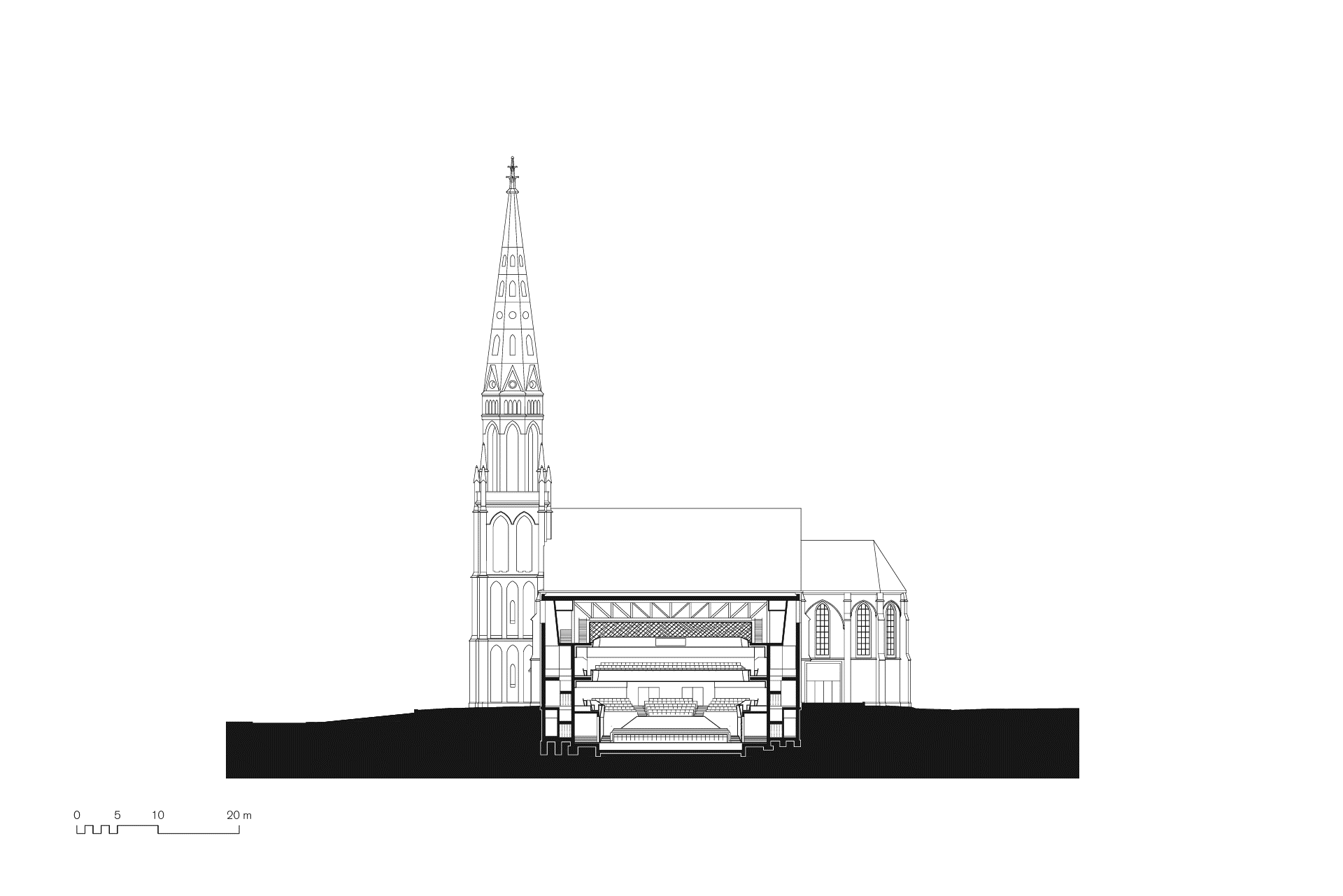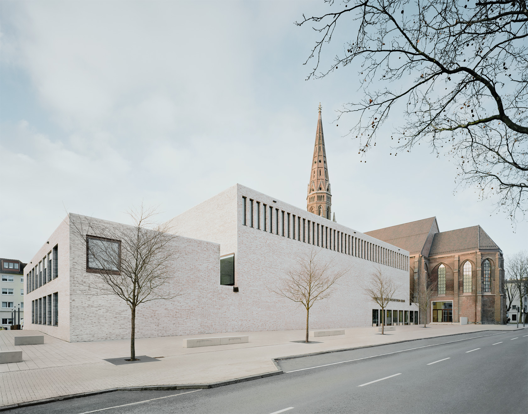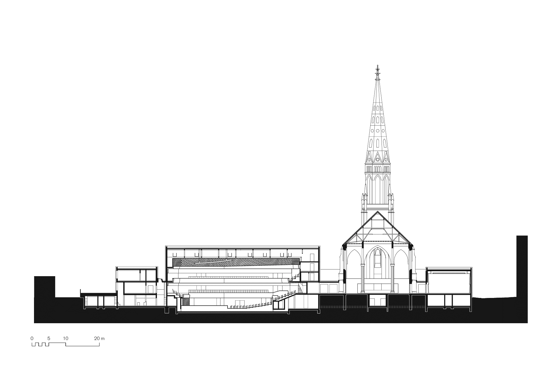 Der Neubau des Musikforums Bochum stellt einen wichtigen öffentlichen Baustein bei der Entwicklung des innerstädtischen Kreativquartiers Viktoriastraße in Bochum dar. Die profanierte, historische Marienkirche ist als zentrales Foyer des Hauses Identität stiftender, städtebaulicher und funktionaler Mittelpunkt des Musikforums. Zu beiden Seiten der Kirche wurden Baukörper angeordnet, die sich unmittelbar an der Länge des Kirchenschiffs orientieren und sich innenräumlich mit diesem verzahnen. Die Höhenentwicklung entlang der Viktoriastraße staffelt sich in Abhängigkeit der innenräumlichen Anforderungen und verleiht dem Gebäude so eine angemessene Maßstäblichkeit im Stadtraum. Auf der Südseite der 1872 errichteten Kirche befindet sich der Konzertsaal der Bochumer Symphoniker mit etwa 1000 Sitzplätzen und hochwertiger akustischer Ausstattung, auf ihrer Nordseite ein flexibel bespielbarer Multifunktionssaal für die Musikschule.