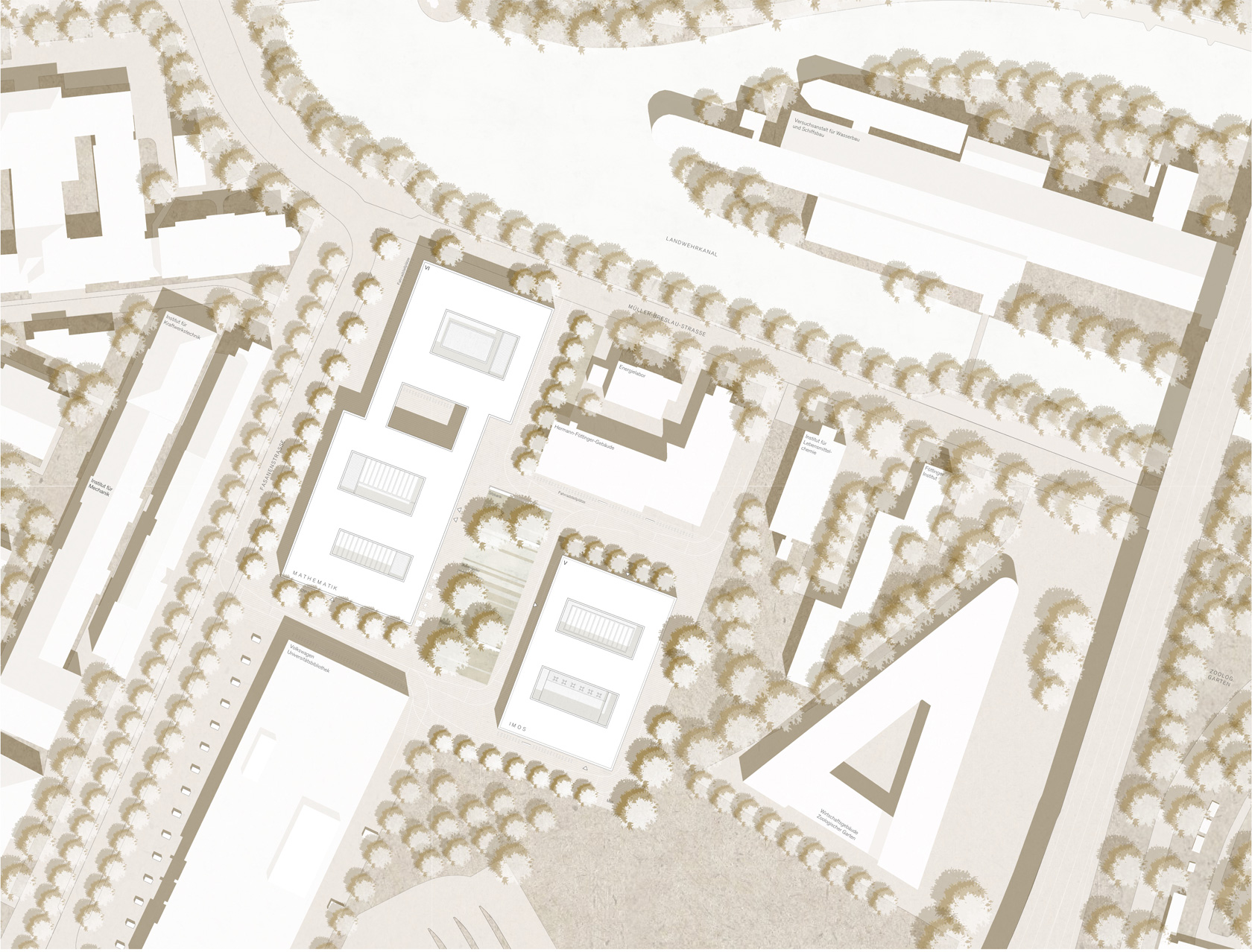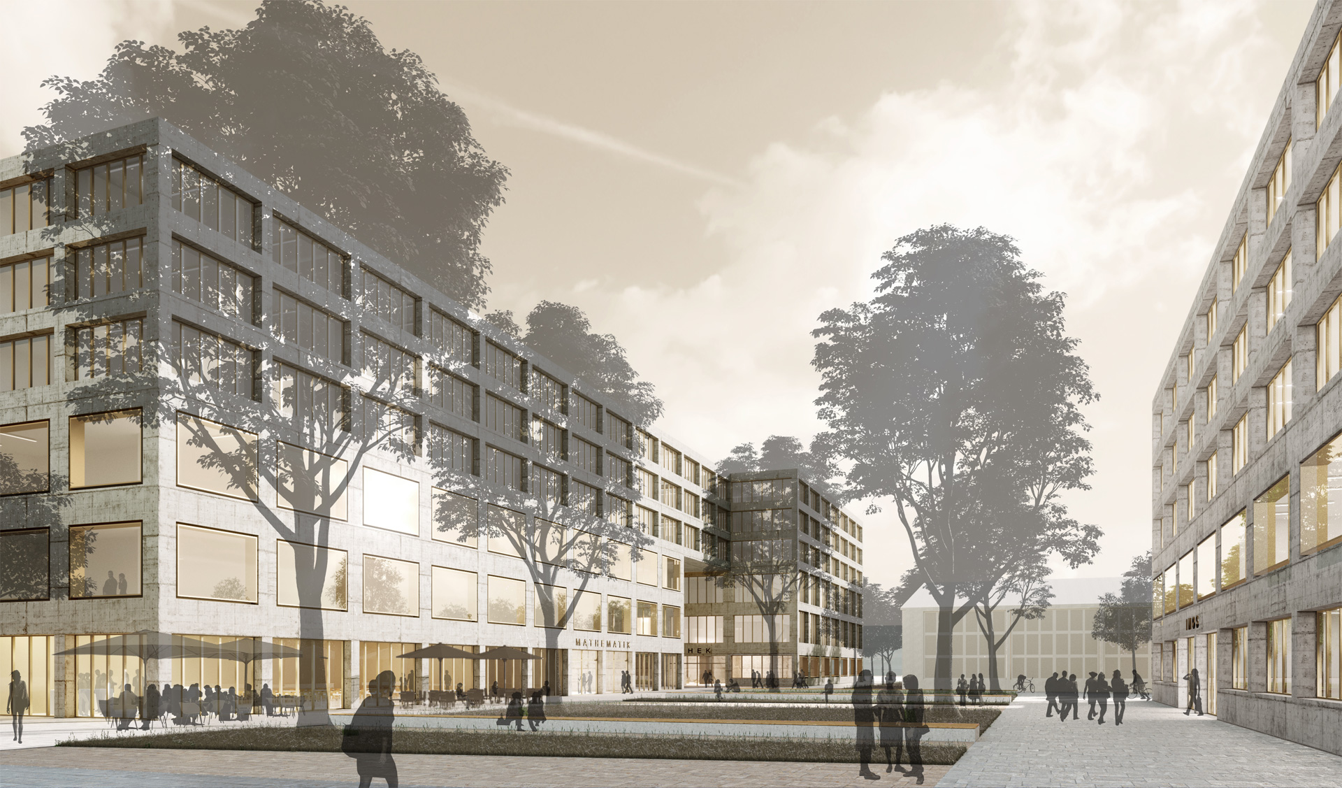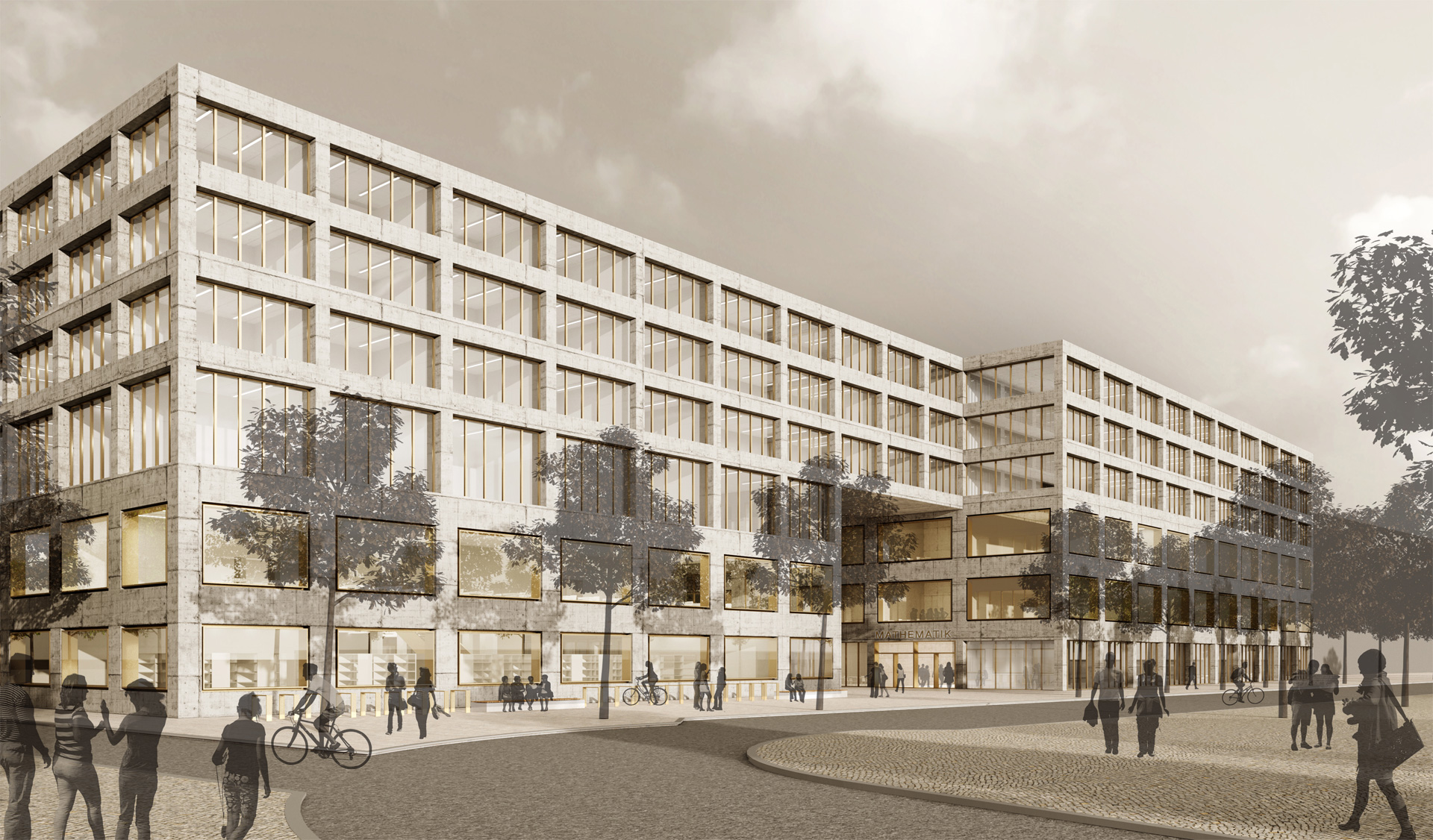 The large building mass of the mathematics building is arranged in such a way that the essential ideas of the master plan based on two buildings on the construction site are retained. The important “passageway from the campus to the city” is structurally defined, the building line on Fasanenstrasse is located at the edge of the street, while the northern building section is set back from the street, thus forming a forecourt as a gesture of invitation. The offset of the building is also retained in the interior of the campus and thus strengthens the formation of a center by enlarging the campus square and clearly defining its boundaries. The IMoS is conceived as a simple cubic structure divided by two inner courtyards, which are oriented towards the campus square. Both buildings develop their design from the same basic attitude in the material style of concrete, warm anodized aluminium and light terrazzo floors. The result is a friendly, rather workshop-like atmosphere made of robust materials that develops an unmistakable character.