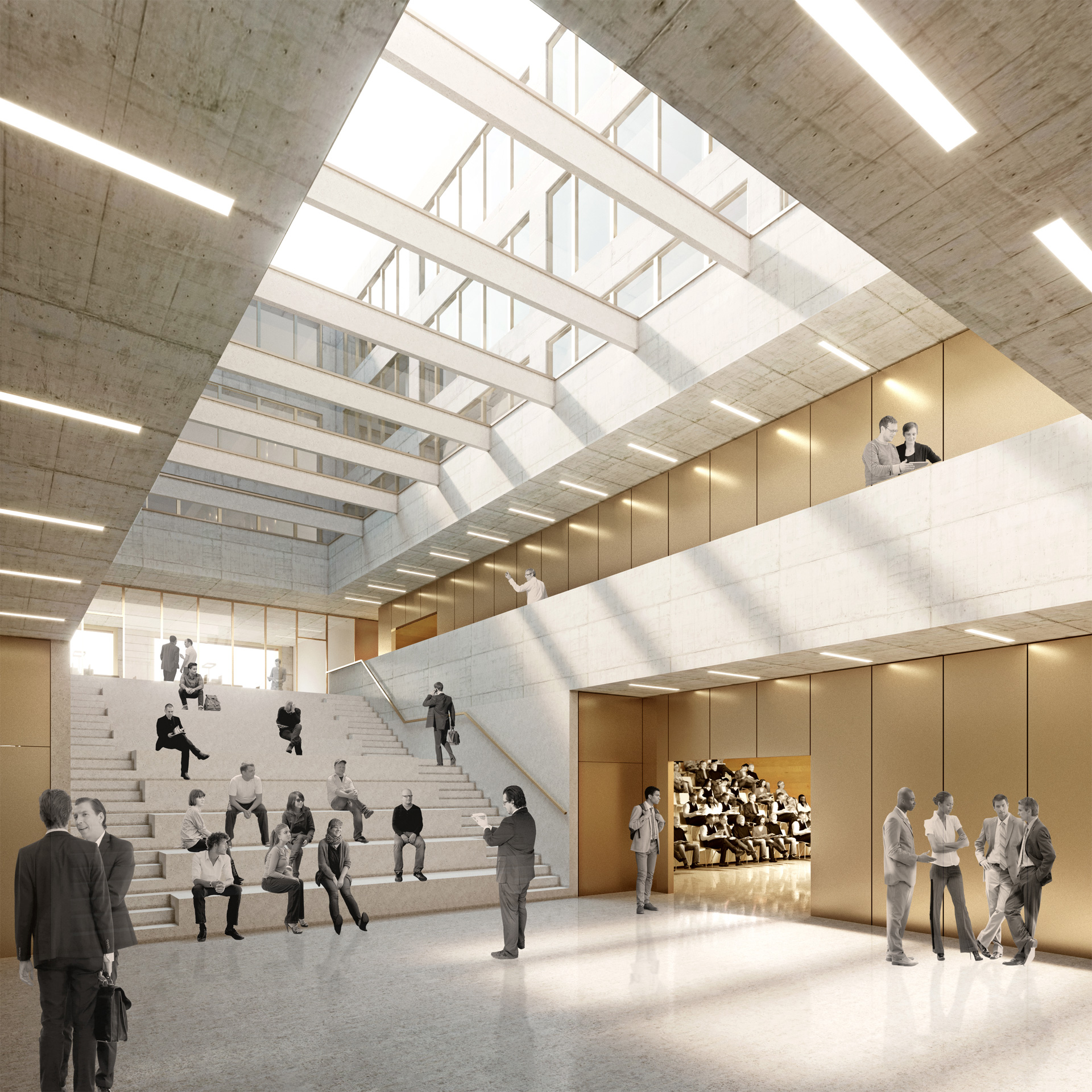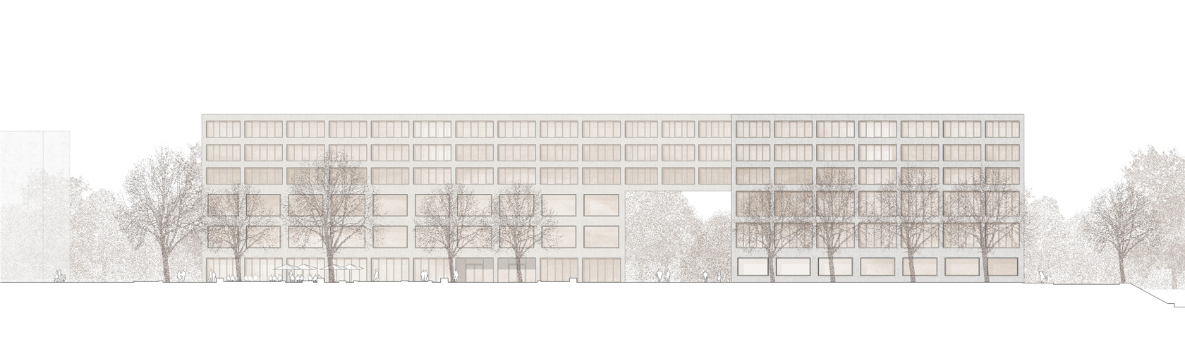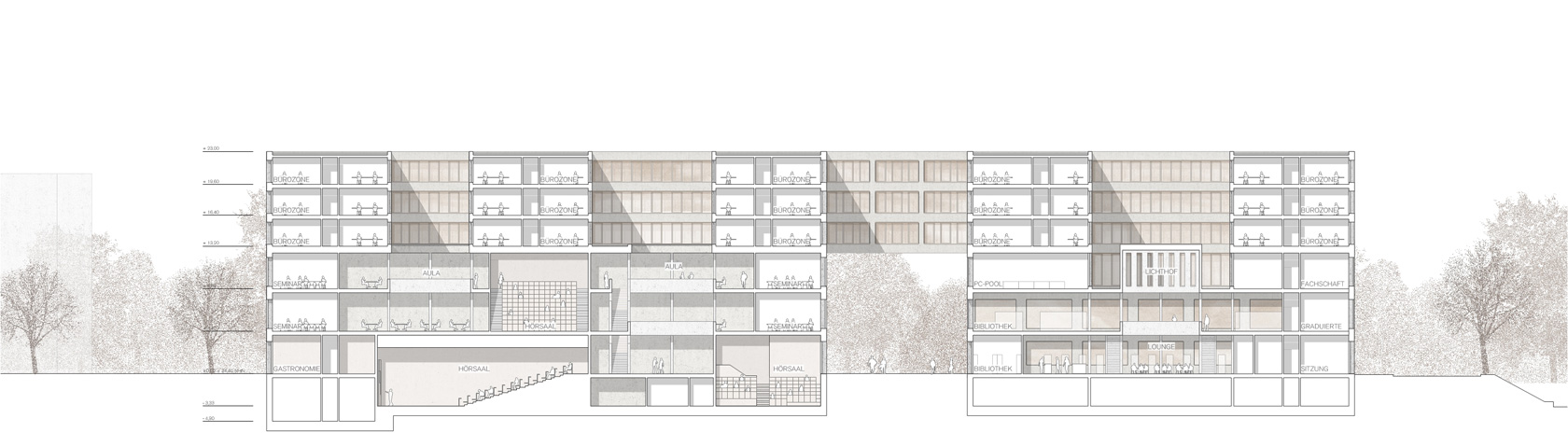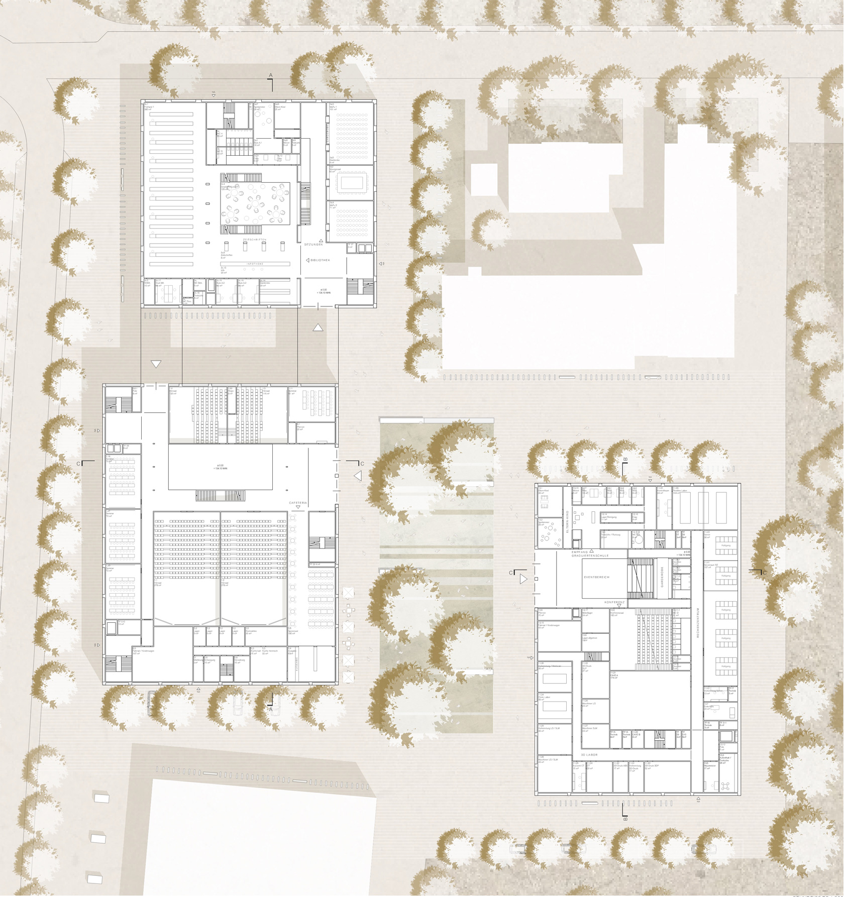 The large building mass of the mathematics building is arranged in such a way that the essential ideas of the master plan based on two buildings on the construction site are retained. The important “passageway from the campus to the city” is structurally defined, the building line on Fasanenstrasse is located at the edge of the street, while the northern building section is set back from the street, thus forming a forecourt as a gesture of invitation. The offset of the building is also retained in the interior of the campus and thus strengthens the formation of a center by enlarging the campus square and clearly defining its boundaries. The IMoS is conceived as a simple cubic structure divided by two inner courtyards, which are oriented towards the campus square. Both buildings develop their design from the same basic attitude in the material style of concrete, warm anodized aluminium and light terrazzo floors. The result is a friendly, rather workshop-like atmosphere made of robust materials that develops an unmistakable character.