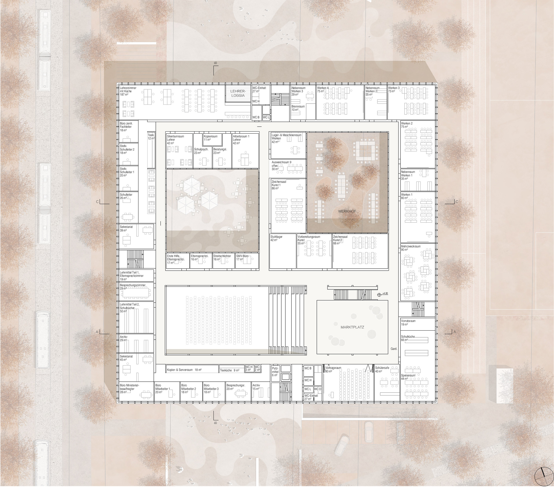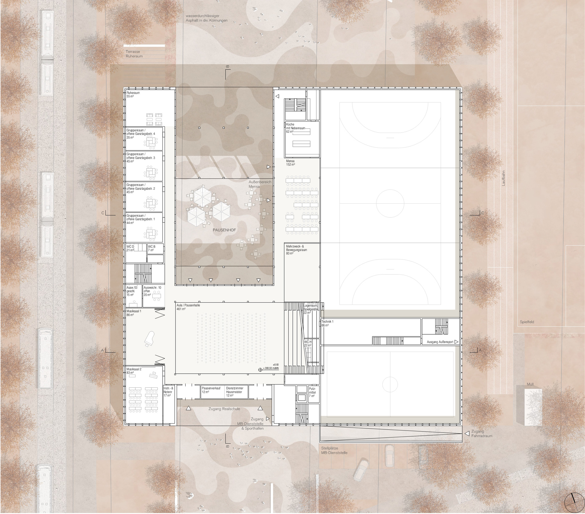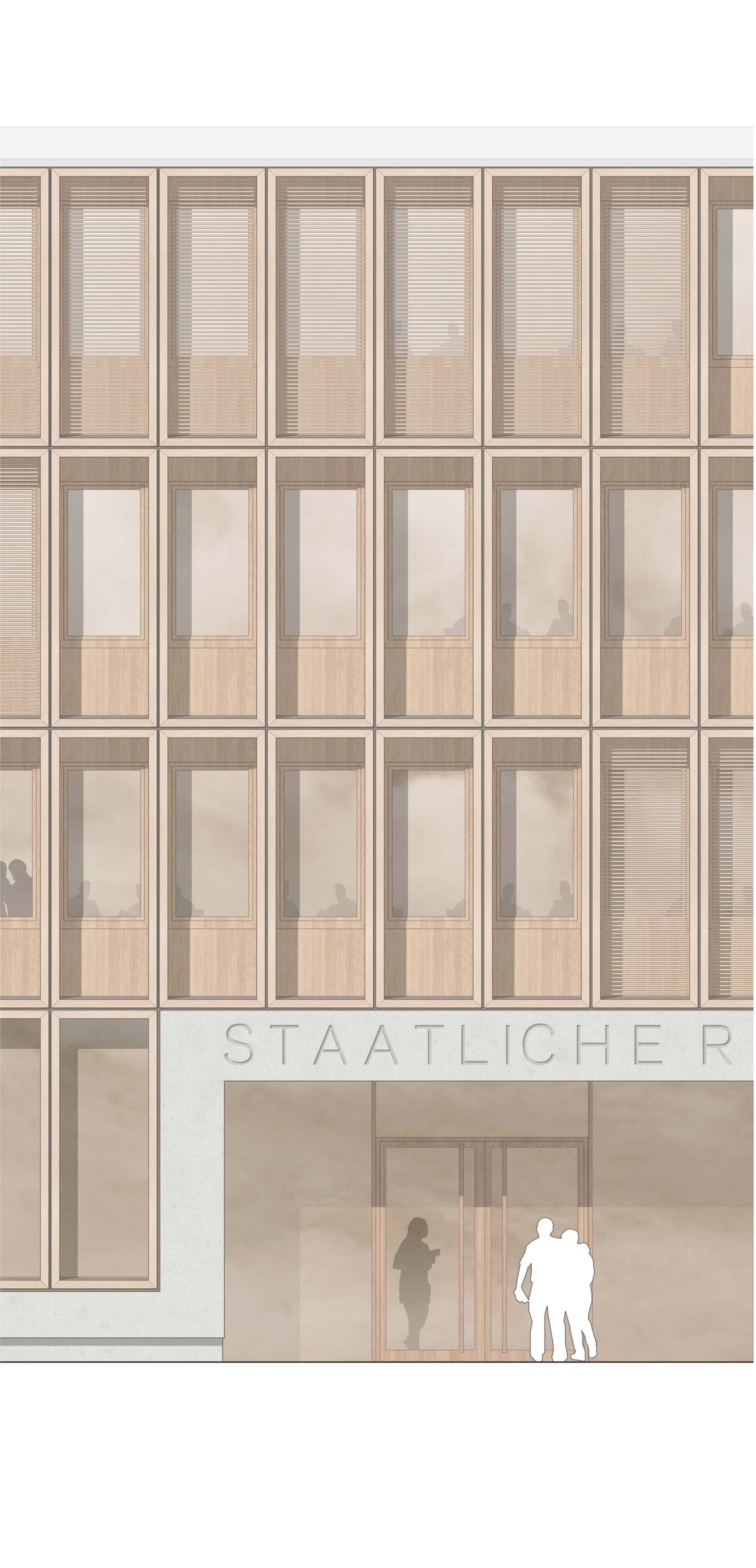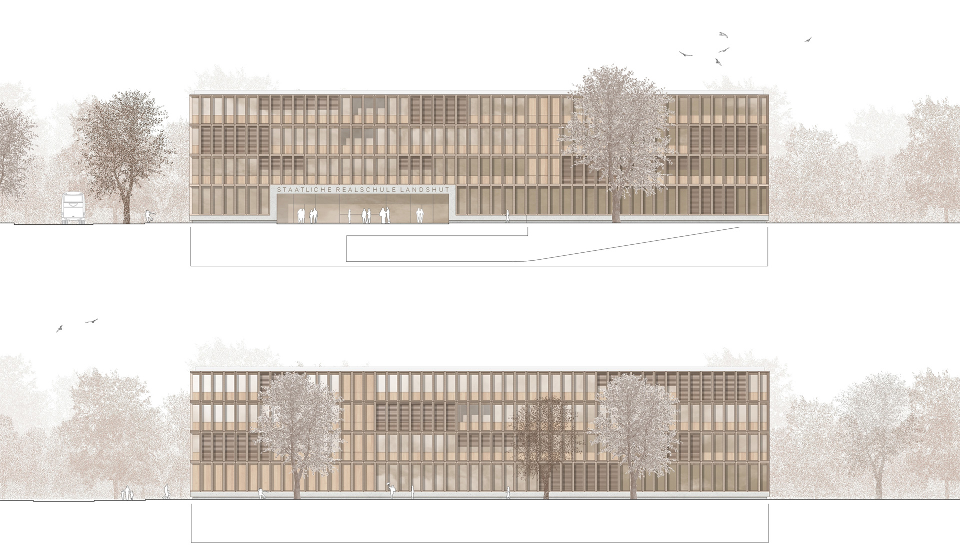The pedagogical concept of the departments creates a "school in motion" between lessons and requires a spatial concept of short distances. This design is based on a square building with a ring-shaped circulation system and an internal crossroads dividing it into four sections, each with its own identity. There are no corridor lanes in this school, only open and spatially interesting paths. In keeping with this approach, the sports hall is fully integrated into the school building. The building is given a differentiated yet rationally producible timber element façade, which gives the building an unmistakable character and incorporates all functional requirements between lighting, ventilation, adjustable sun protection and highly efficient thermal insulation. The element frame with its functional infill is prefabricated in the factory and is simply suspended, adjusted and fixed to the ceiling panels on site. This frame emerges as a sculptural element that structures the building and is joined according to the principles of constructive timber protection. The result is a façade that changes over the years, just like the building itself, but can do so without losing any of its value or design quality. Inside the building, robust but characterful materials predominate: Terrazzo in the assembly hall and circulation routes, waxed wood paneling on the corridor walls and light-colored ceilings.