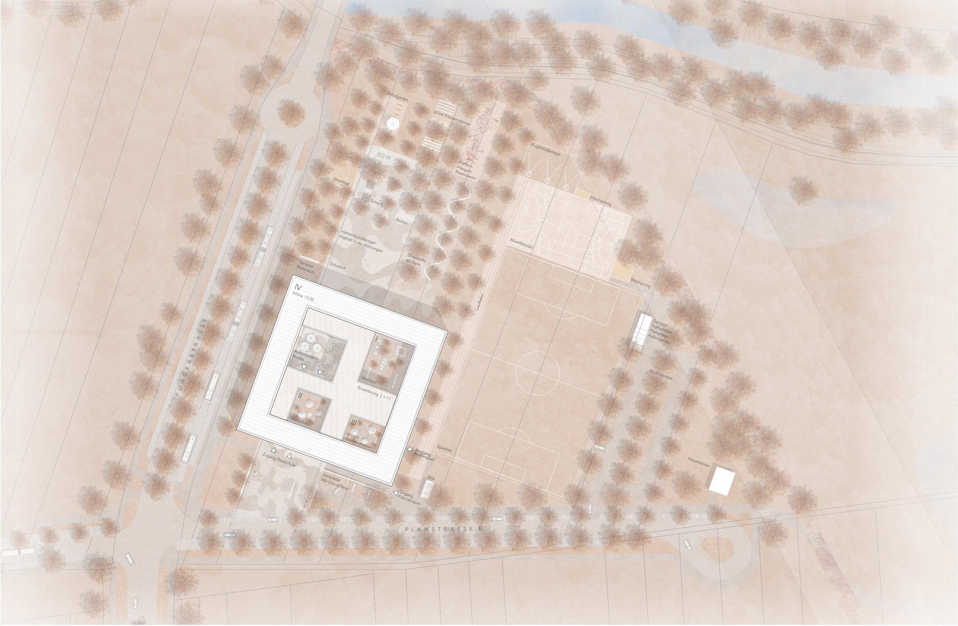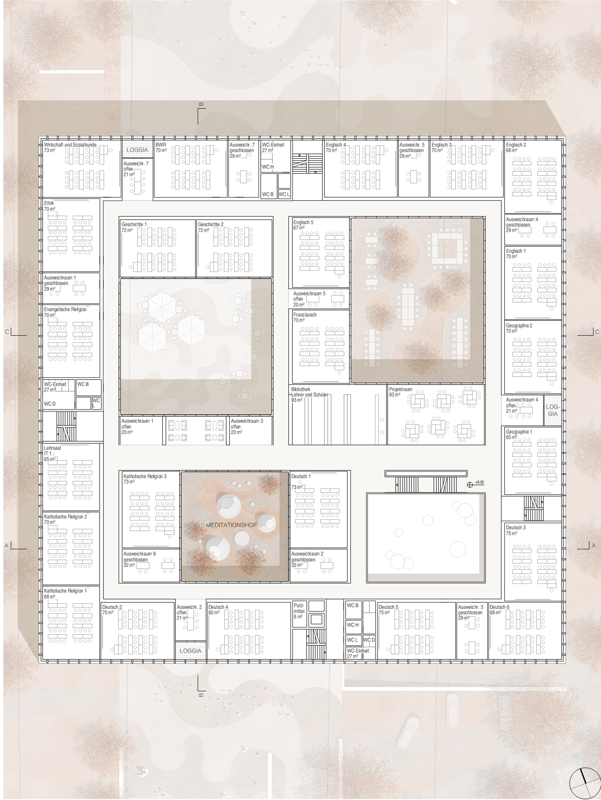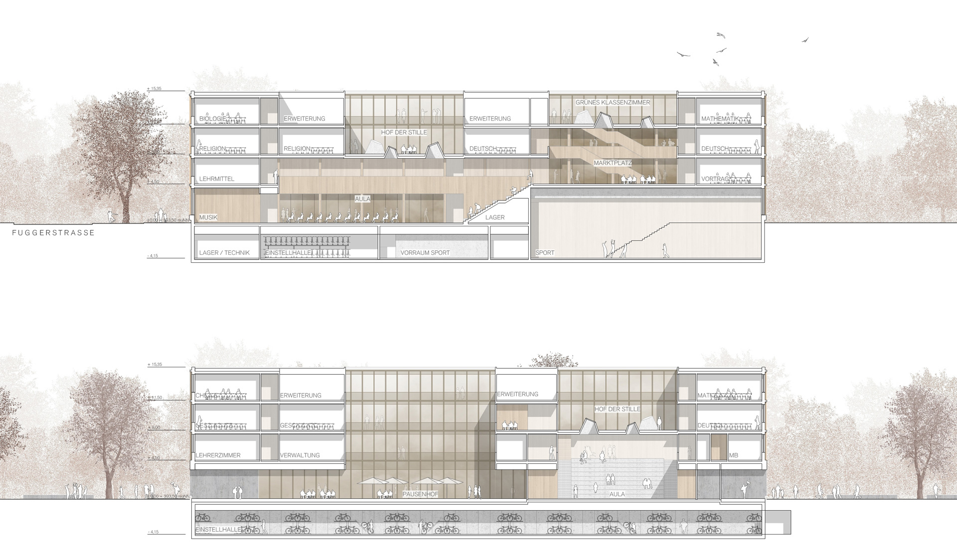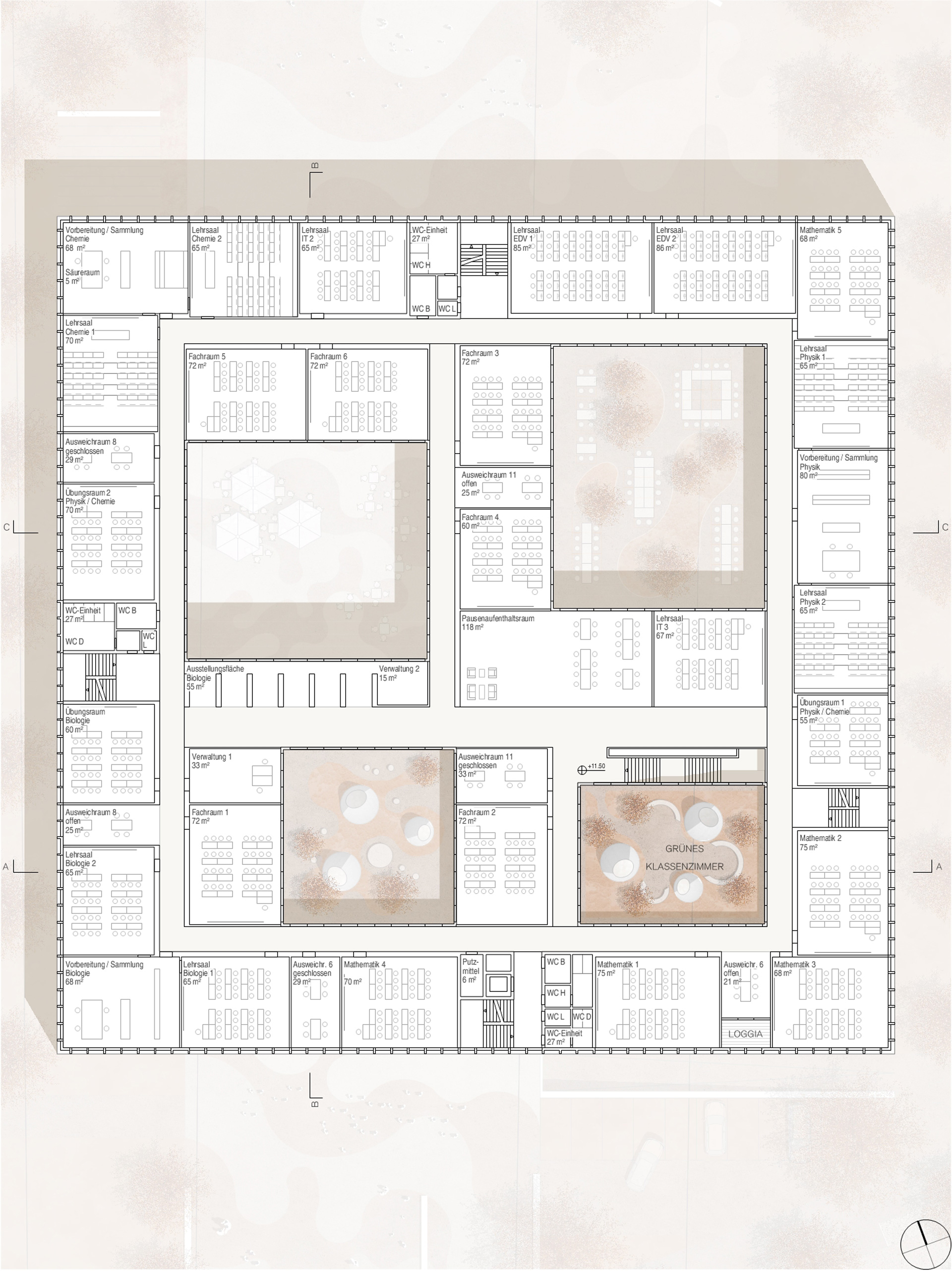The pedagogical concept of the departments creates a "school in motion" between lessons and requires a spatial concept of short distances. This design is based on a square building with a ring-shaped circulation system and an internal crossroads dividing it into four sections, each with its own identity. There are no corridor lanes in this school, only open and spatially interesting paths. In keeping with this approach, the sports hall is fully integrated into the school building. The building is given a differentiated yet rationally producible timber element façade, which gives the building an unmistakable character and incorporates all functional requirements between lighting, ventilation, adjustable sun protection and highly efficient thermal insulation. The element frame with its functional infill is prefabricated in the factory and is simply suspended, adjusted and fixed to the ceiling panels on site. This frame emerges as a sculptural element that structures the building and is joined according to the principles of constructive timber protection. The result is a façade that changes over the years, just like the building itself, but can do so without losing any of its value or design quality. Inside the building, robust but characterful materials predominate: Terrazzo in the assembly hall and circulation routes, waxed wood paneling on the corridor walls and light-colored ceilings.