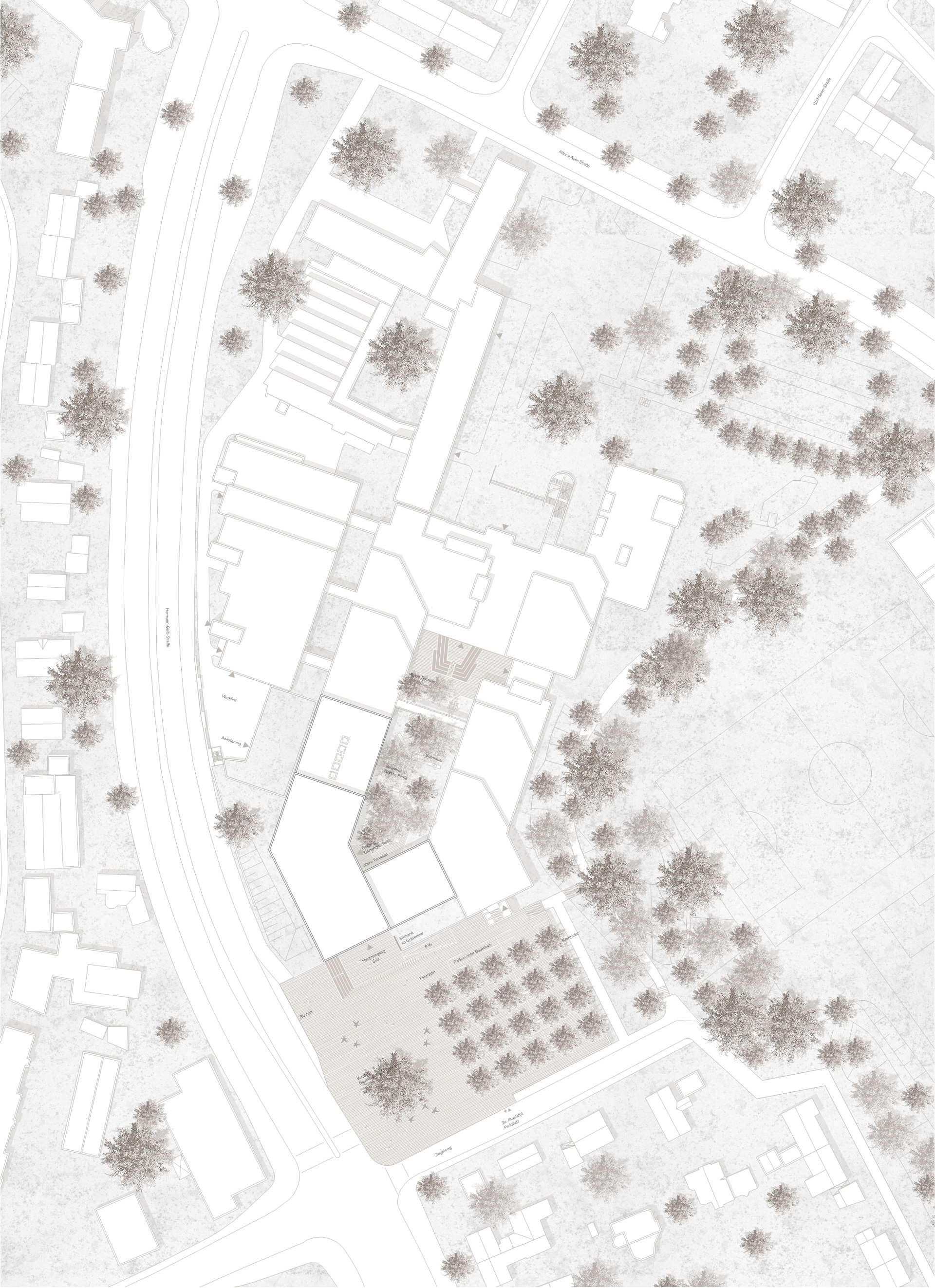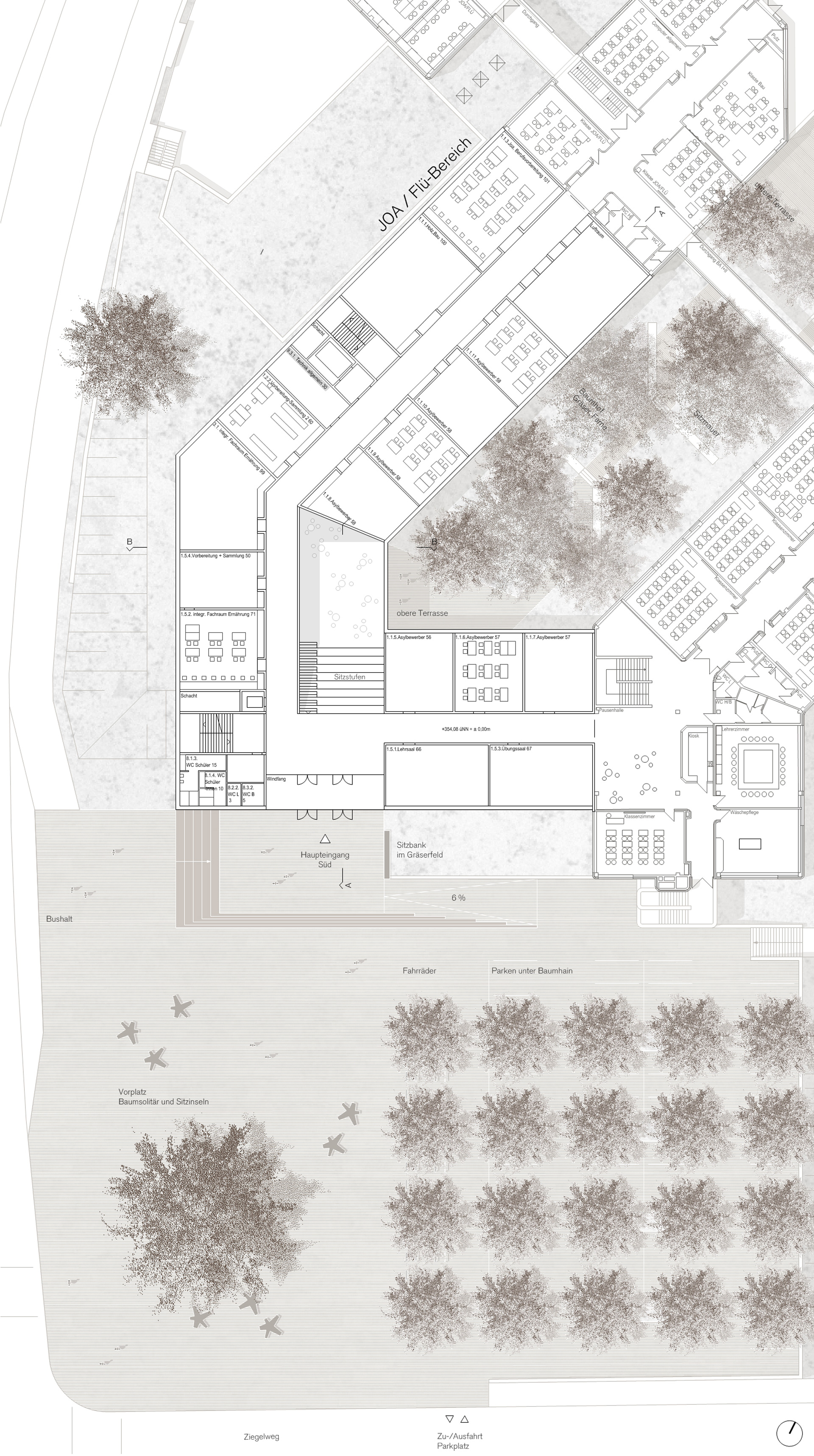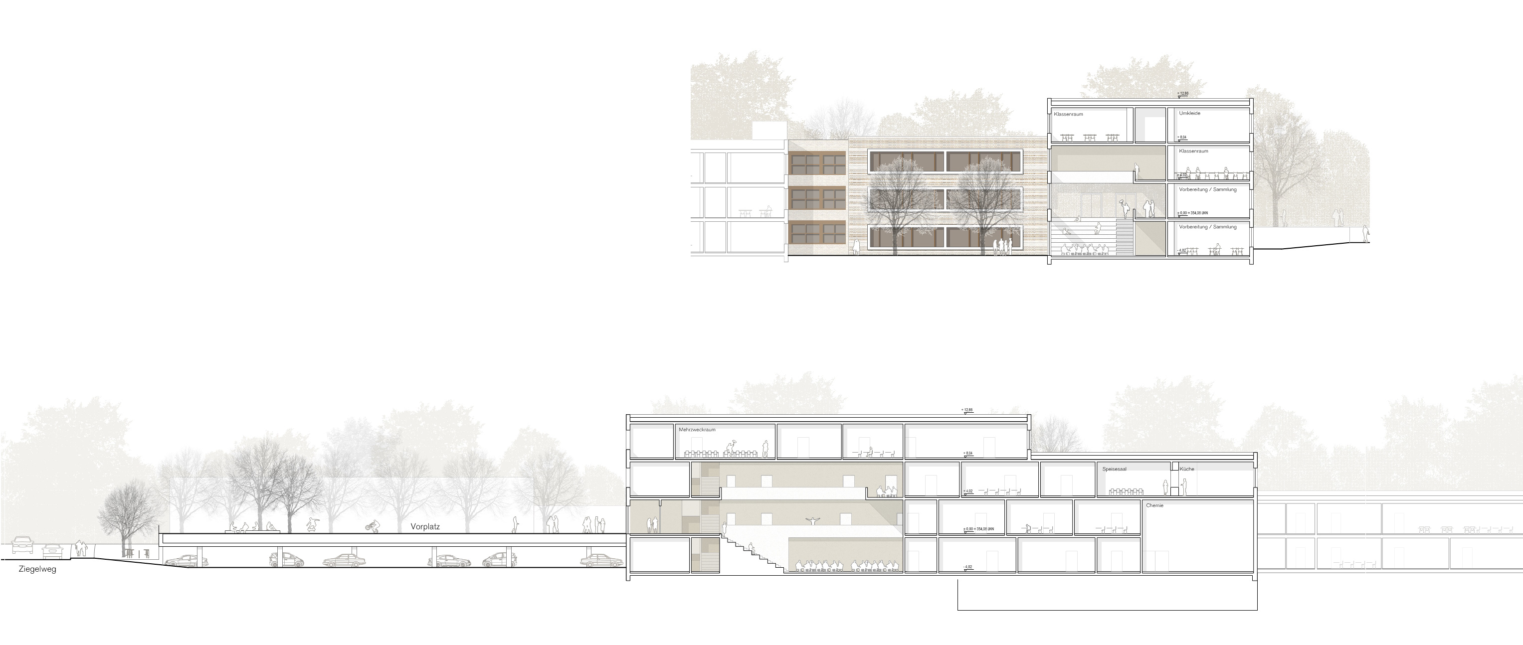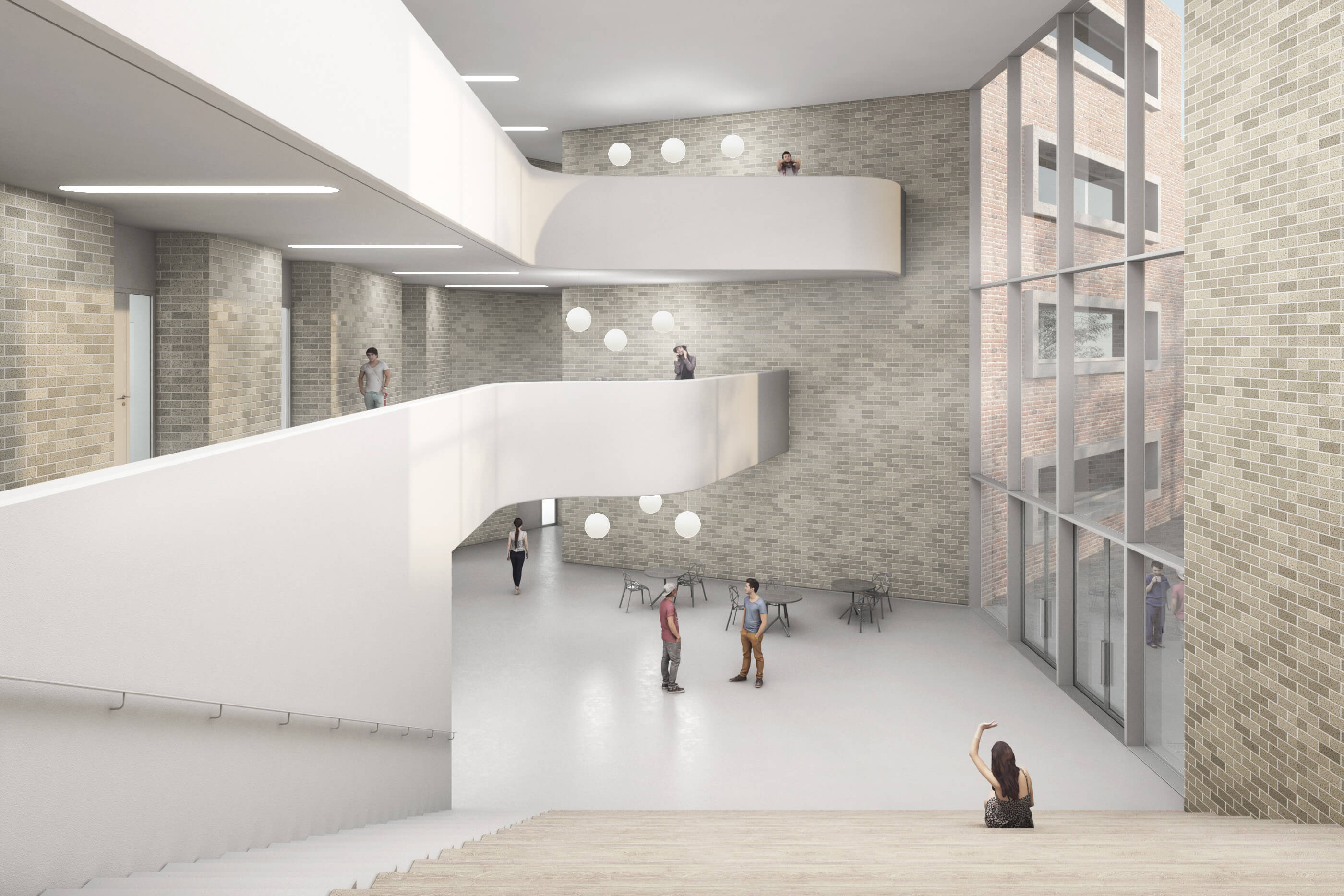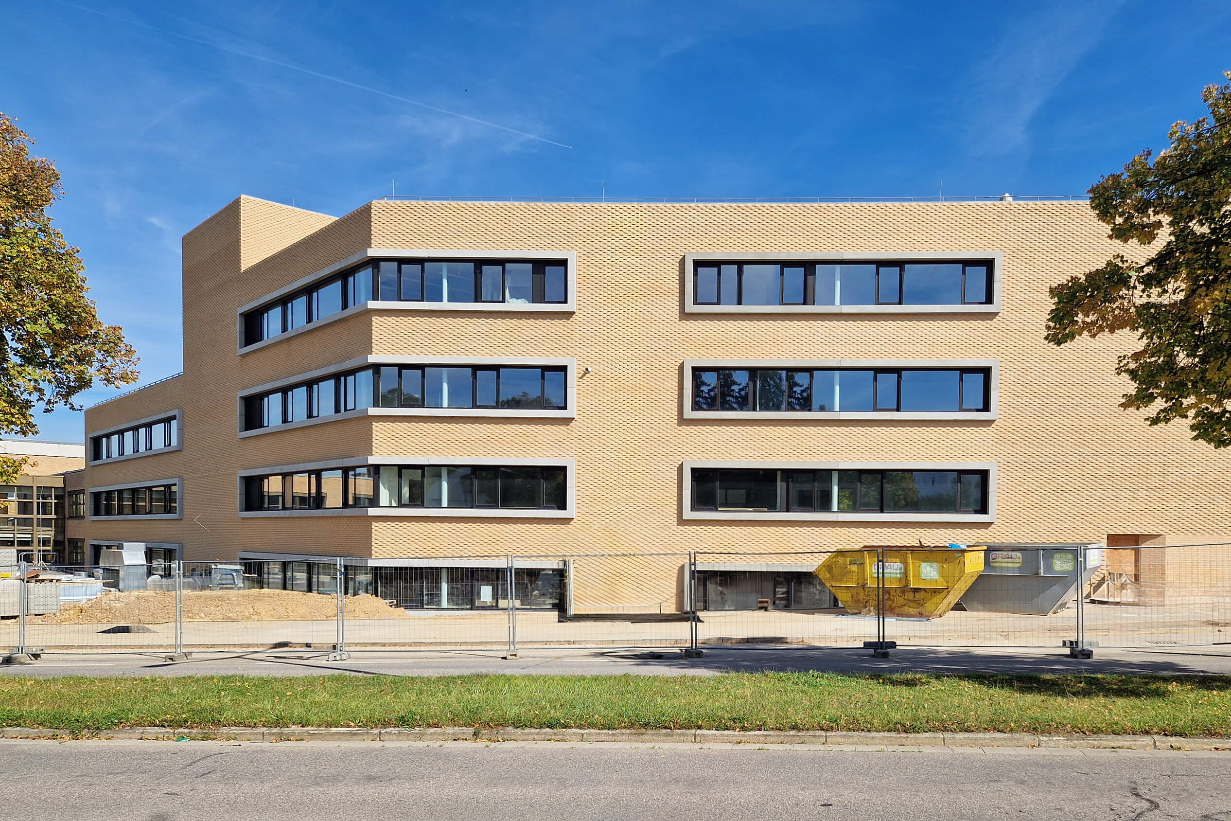 The extension to the Georg Kerschensteiner vocational school continues the history of the terraced existing building and adds a distinctive building head to the southern end. This inviting gesture has made the school, which was previously quite hidden away in the urban space of Regensburg, much more visible. The dead-end situation in the floor plan was converted into a structural ring closure, resulting in optimized functionality for the interior spaces of the vocational school. The new building was given a clinker brick façade: its horizontal stone layers were laid in three alternating colors, subtly echoing the color scheme of the existing building.