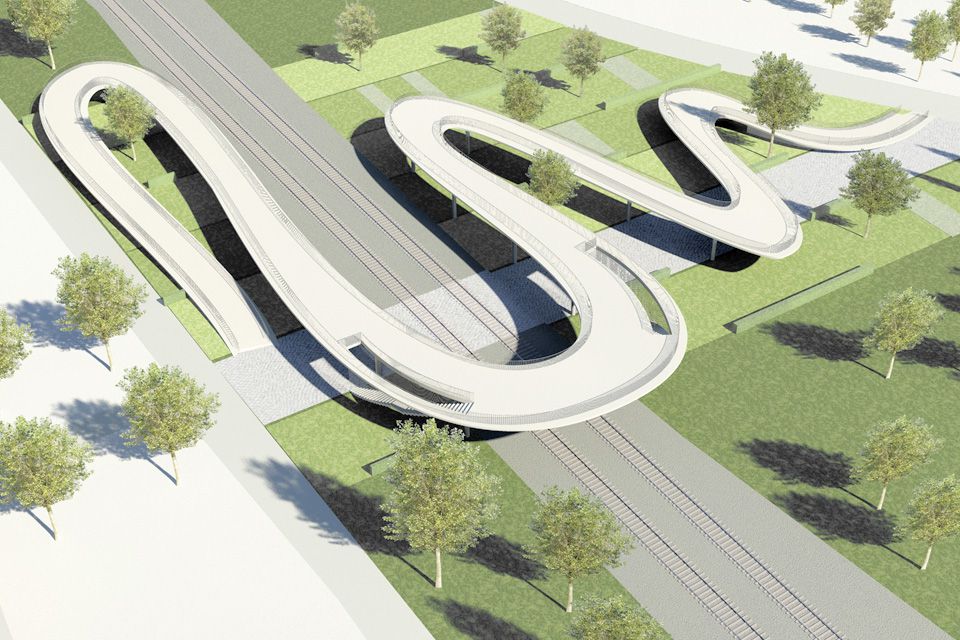 The bridge connects the Heidelberg districts of Kirchheim and Rohrbach, which are separated by the railway tracks, for pedestrians and cyclists. The ramps, caused by the desired accessibility, overcome the height in several serpentines. On the more urban west side the curves are very narrow, while they end in wide curves towards the more scenic east side. For pedestrians, two centrally located stairs create a convenient shortcut. The bridge rests as a slim white concrete slab on centrally arranged mushroom-shaped supports, the railing is slightly indented from the edge and is staged by concealed LED lights.