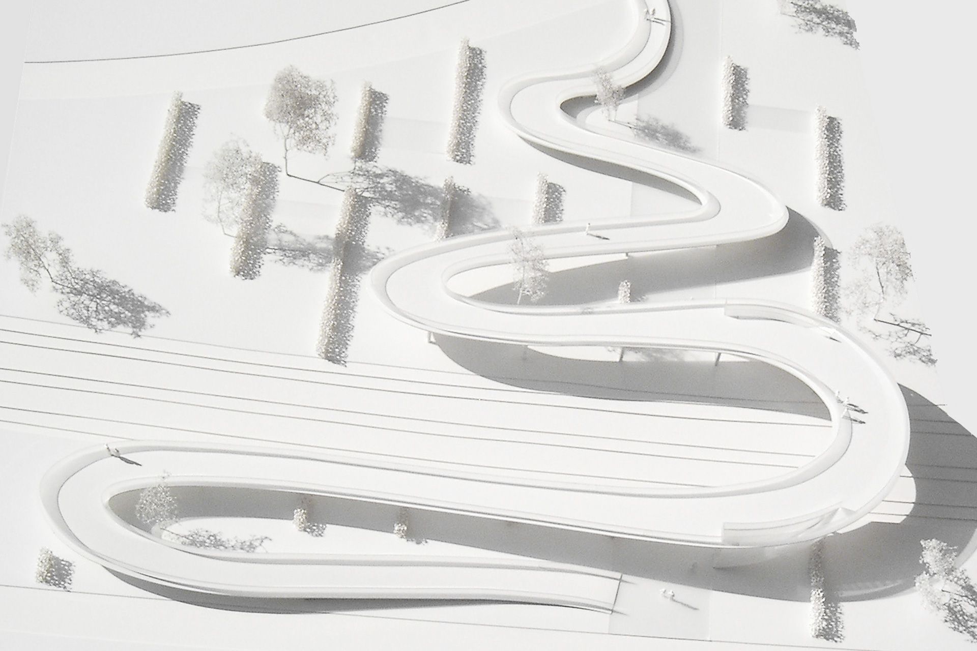 The bridge connects the Heidelberg districts of Kirchheim and Rohrbach, which are separated by the railway tracks, for pedestrians and cyclists. The ramps, caused by the desired accessibility, overcome the height in several serpentines. On the more urban west side the curves are very narrow, while they end in wide curves towards the more scenic east side. For pedestrians, two centrally located stairs create a convenient shortcut. The bridge rests as a slim white concrete slab on centrally arranged mushroom-shaped supports, the railing is slightly indented from the edge and is staged by concealed LED lights.