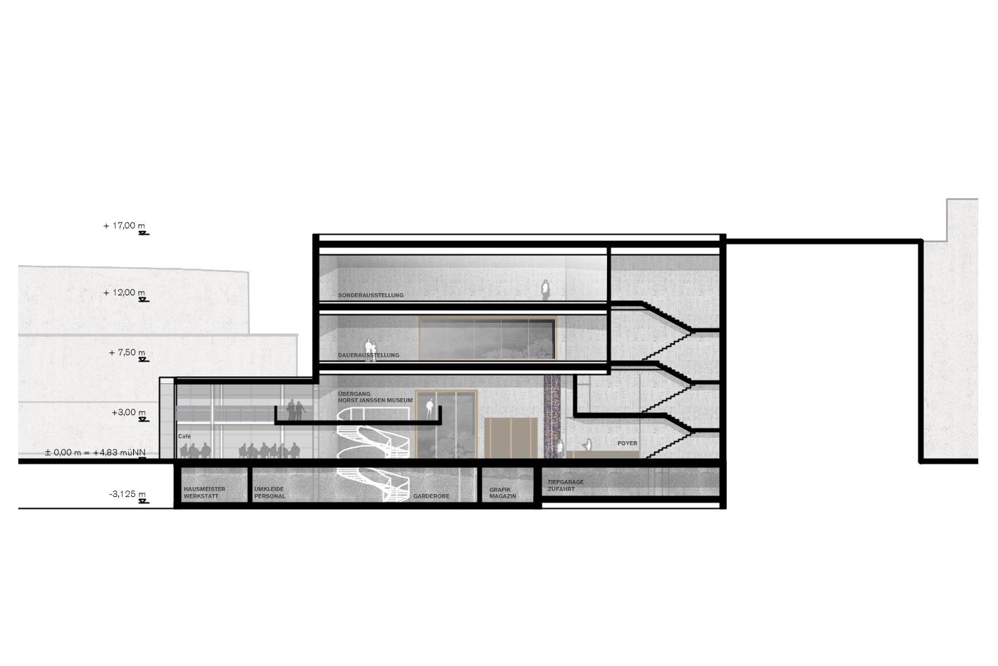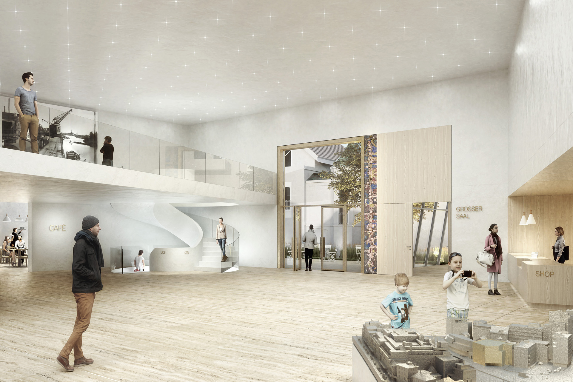 The polygonal structure of the Stadtmuseum emerges from the geometric logic of the site. It adjoins the neighboring buildings on both sides, accompanies the street Am Stadtmuseum and bends with its entrance front towards Lappan and the new forecourt of the museum planned at this location.
