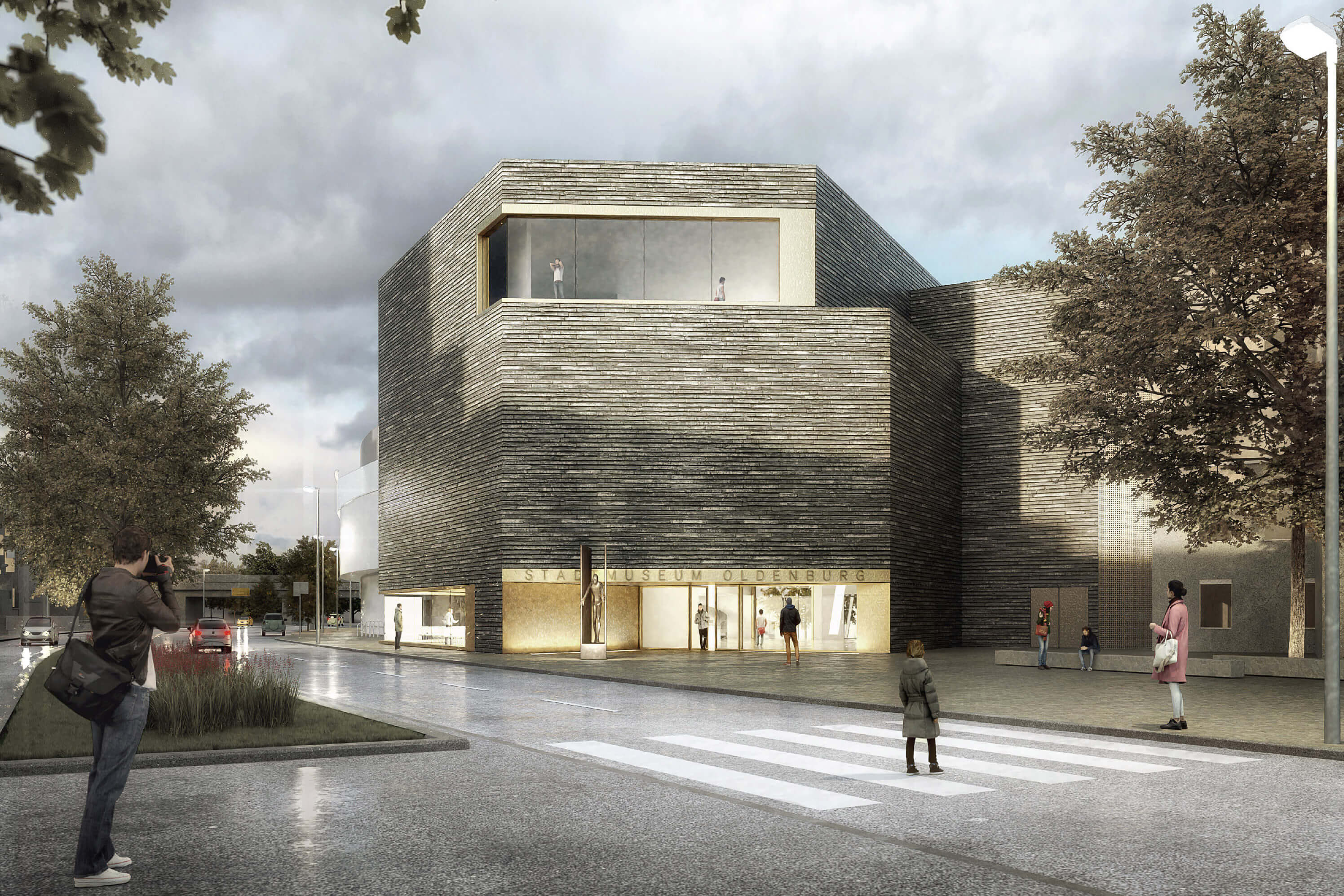 The exterior wall will use a handcrafted long form brick in a dark color that accentuates the horizontal layering of the structure. At the same time, this choice of material is a reminiscence of Oldenburg's great clinker tradition. Few, precisely placed openings stage targeted views in the direction of the old town or to the museum garden at the rear. The environment itself thus becomes an exhibit. The openings are framed by wide bronze-covered profiles, which together with the dark brick evoke a handcrafted and valuable impression.