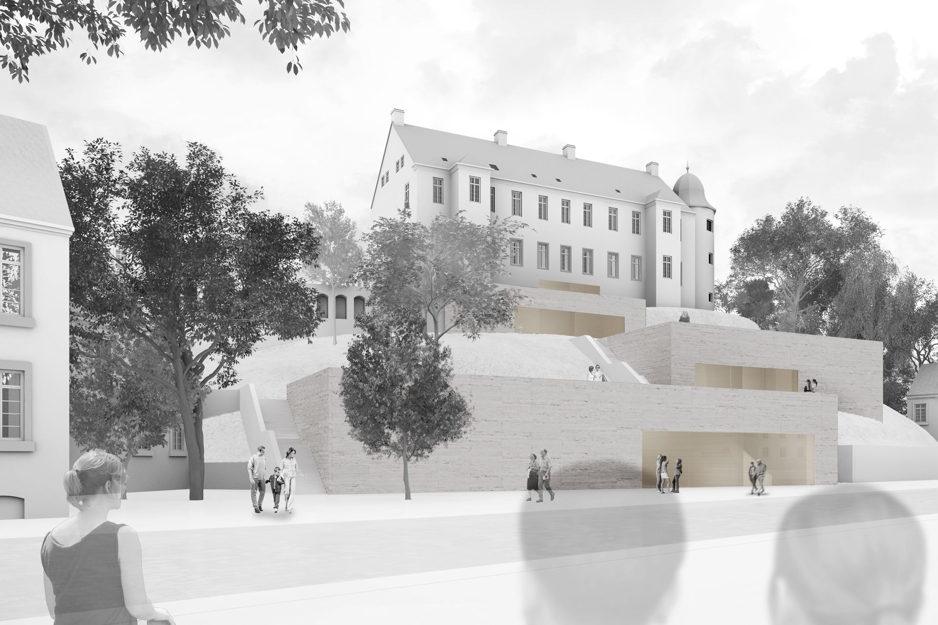 The Sauerland Museum housed in the Landsberger Hof will be expanded into the Museum and Cultural Forum South Westphalia as part of the Regionale 2013. The historic existing building will be renovated and the permanent exhibition housed there will be redesigned. The extension will meet contemporary requirements and will also enable the museum to host high-caliber temporary exhibitions in the future. On the valley side of the Landsberger Hof, three staggered structures will be pushed into the slope, which will be accessed via a central access axis from the main entrance of the old building on the Alter Markt. Two exhibition rooms of 250 and 550 m2 will be created, as well as a room for education. The new building volumes clad in natural stone enhance the urban development situation on Ruhrstrasse while retaining the dominance of the old building. The English promenade runs between the terraced buildings, and the roofs are made accessible as museum terraces with distant views.