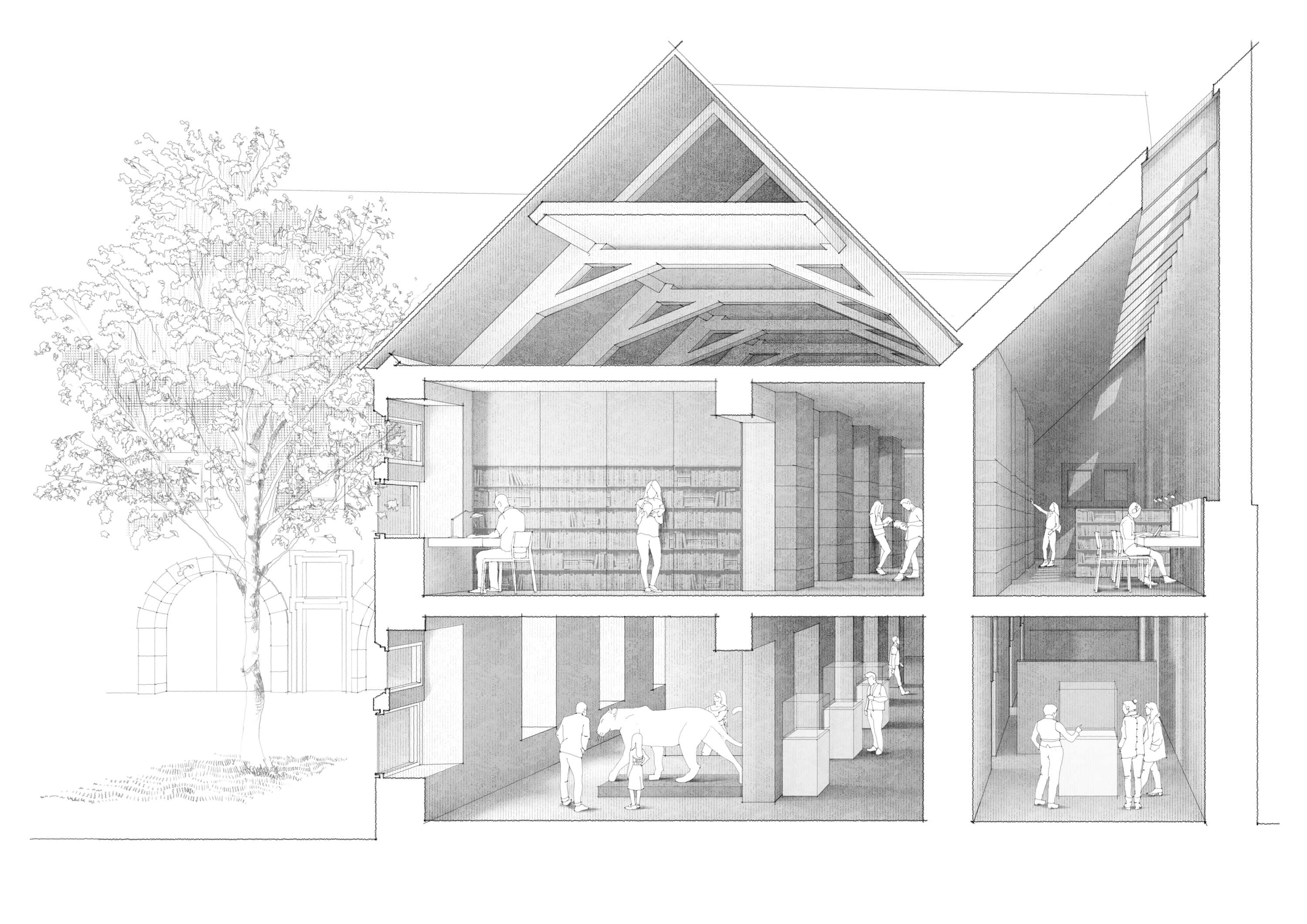The museum and library are carefully integrated into the existing spatial structures, so that structural interventions can be reduced to a minimum. The formative cell structure is largely retained. Structural extensions are only made where they remain invisible from the courtyard. Thus the single-storey southern extension is being extended and the rear part of the house at Storchengasse 8 is being renovated to create a functional delivery situation within the old contours.