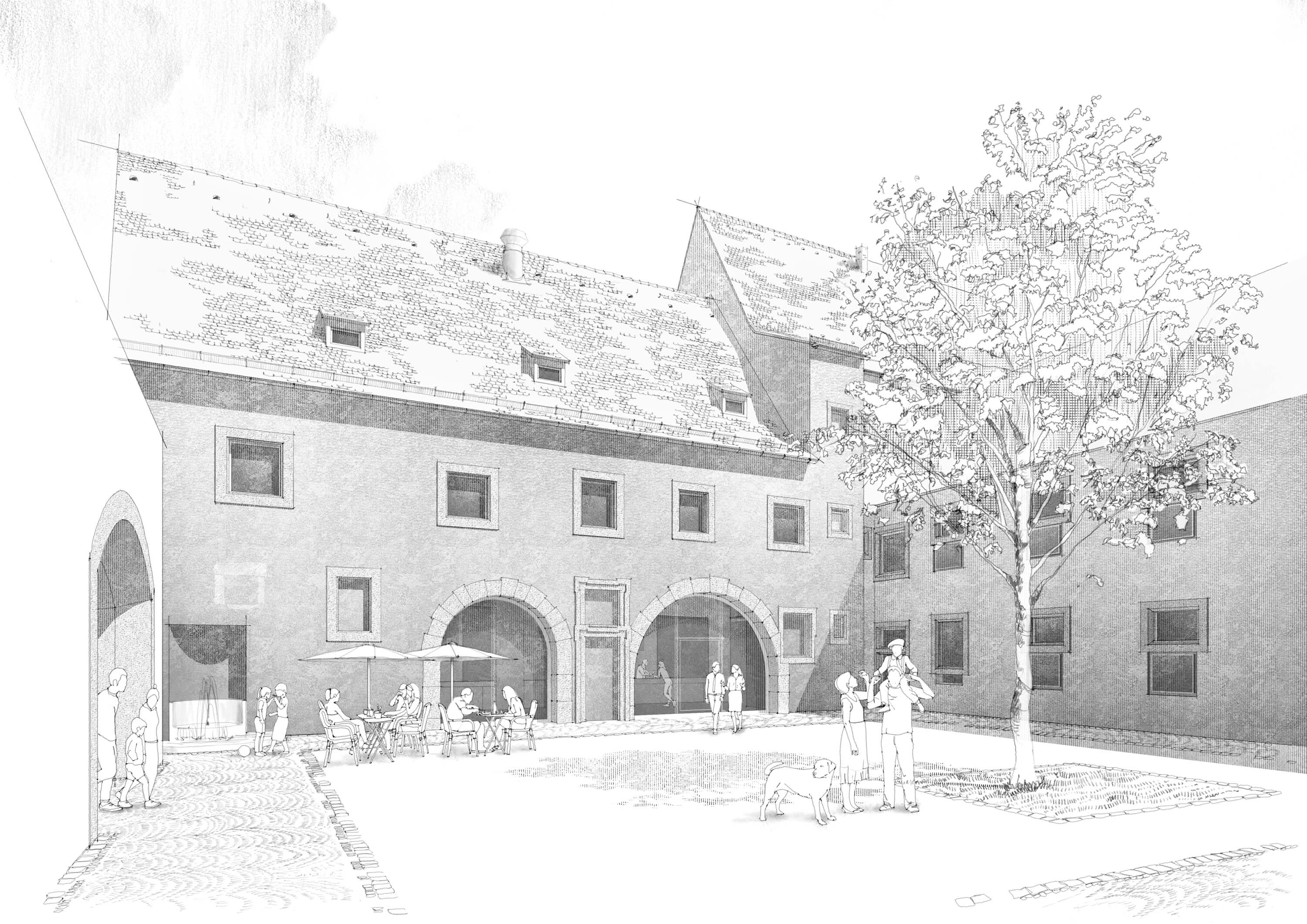 The museum and library are carefully integrated into the existing spatial structures, so that structural interventions can be reduced to a minimum. The formative cell structure is largely retained. Structural extensions are only made where they remain invisible from the courtyard. Thus the single-storey southern extension is being extended and the rear part of the house at Storchengasse 8 is being renovated to create a functional delivery situation within the old contours.