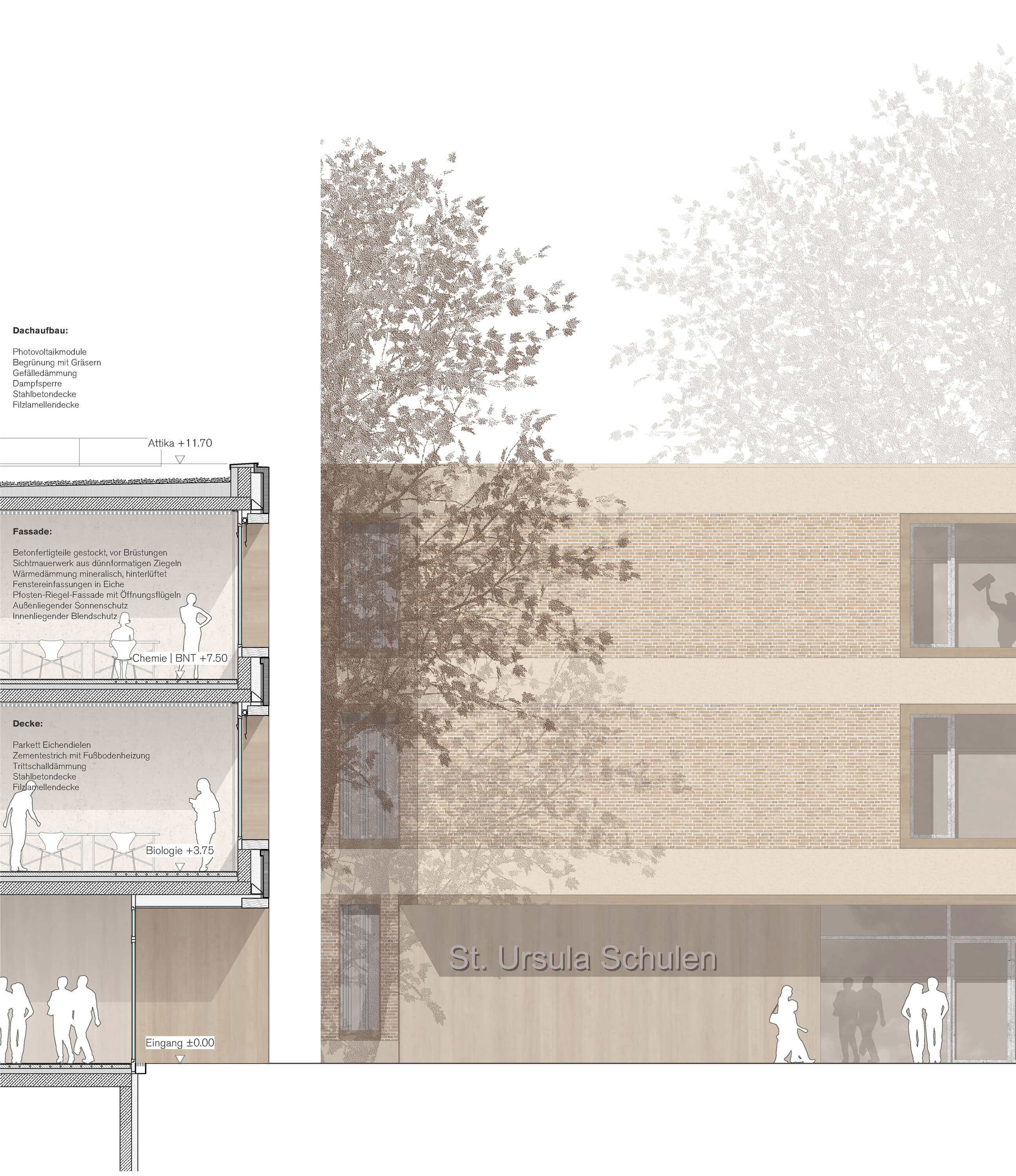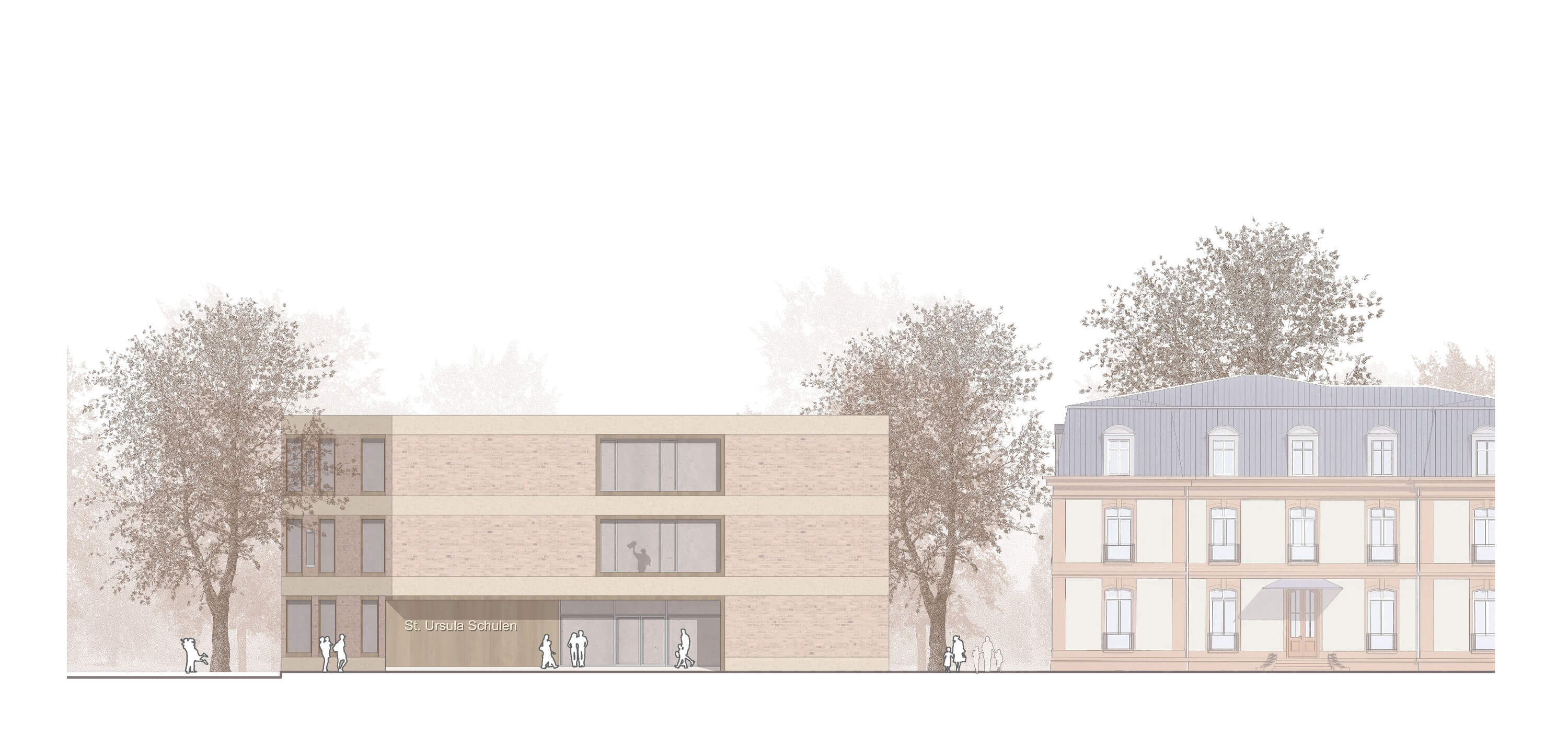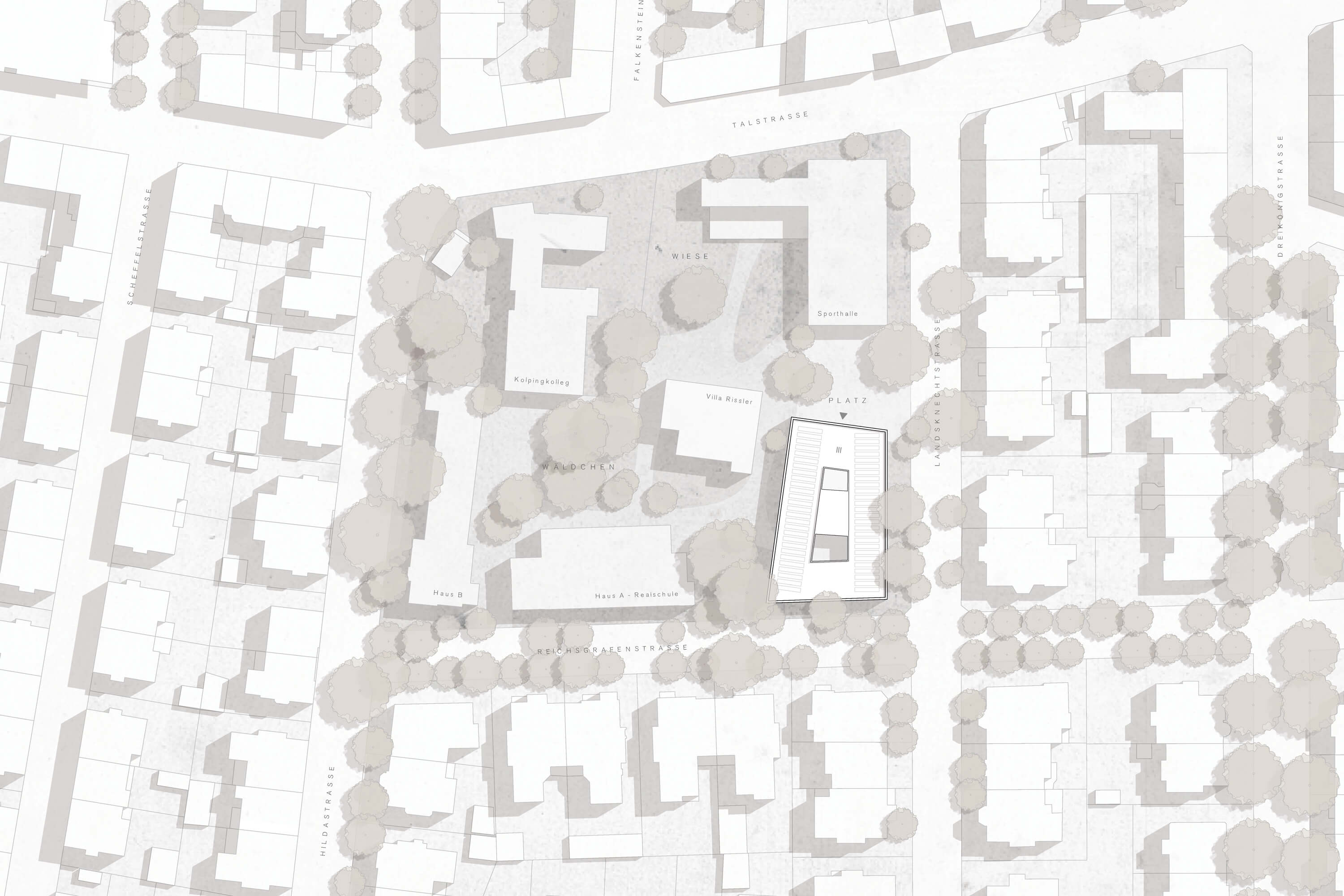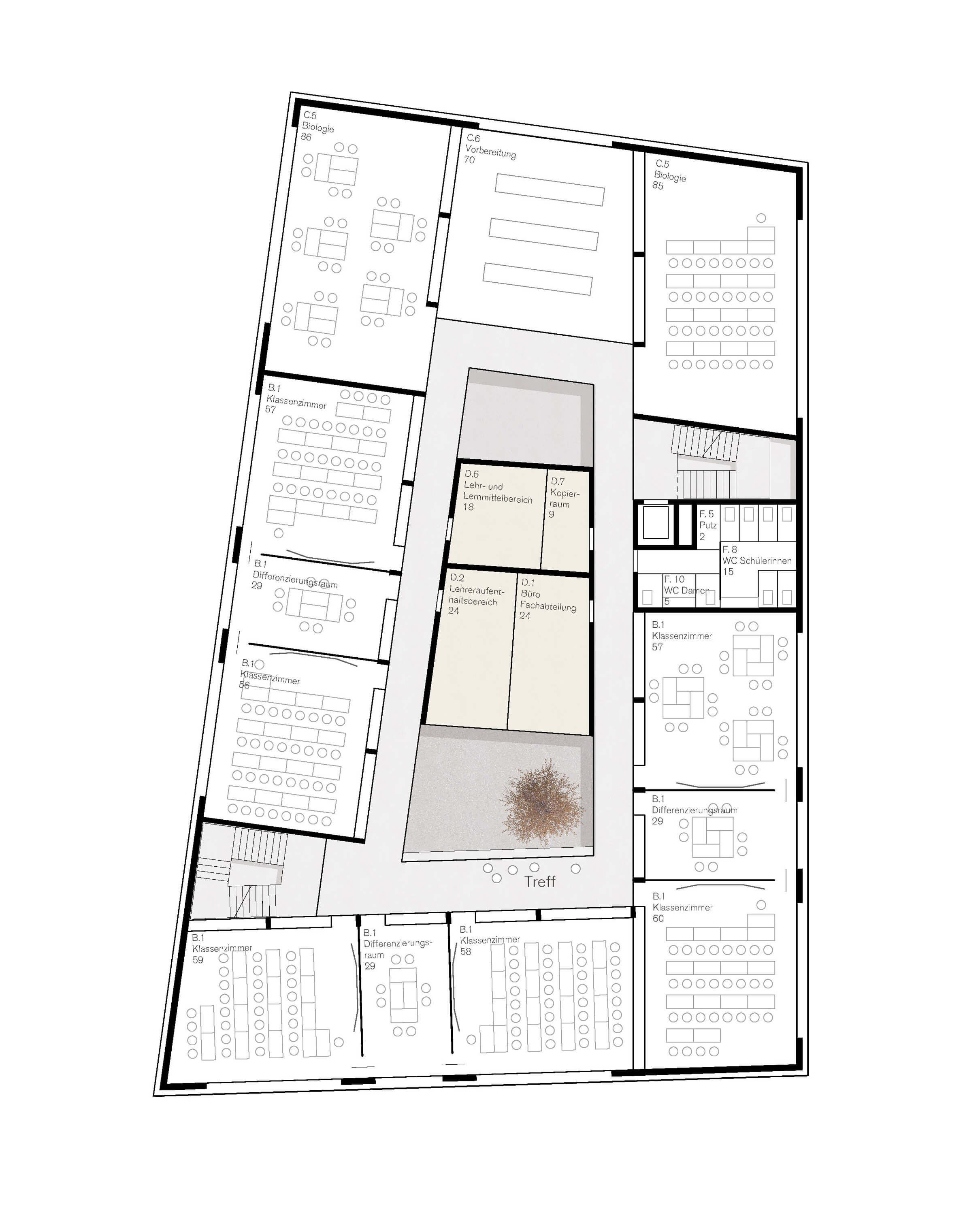 The new school building occupies the corner of the block edge as an irregular square. On the street side, it follows the course of the two adjacent streets, while on the block interior it picks up the twisted orthogonality of the historic villa. The result is a solitary house based on the existing geometries. The new building also strengthens the ensemble in its materiality by taking up the existing building materials and combining them in new ways. The horizontal bands in front of the floor slabs quote the light beige prefabricated concrete elements of the sports hall. Closed parts of the facade are bricked up in a light red clinker brick and are based on the haptics and color of the historic villa. The powerful wooden edgings of the classroom windows quote the carpenter-like interior design of House A. Thus, the new building becomes an integrating and identity-giving component of the school ensemble.