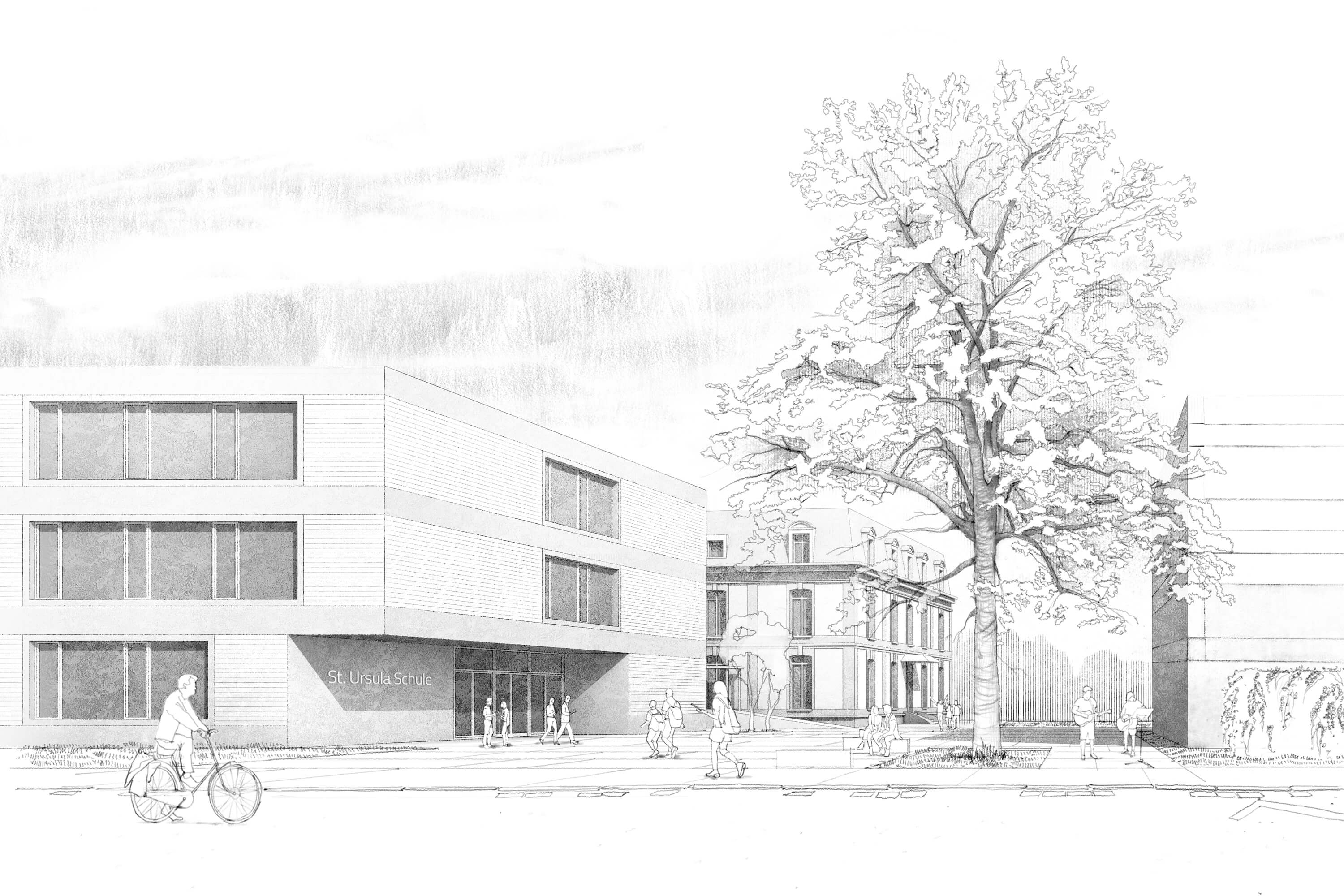 The new school building occupies the corner of the block edge as an irregular square. On the street side, it follows the course of the two adjacent streets, while on the block interior it picks up the twisted orthogonality of the historic villa. The result is a solitary house based on the existing geometries. The new building also strengthens the ensemble in its materiality by taking up the existing building materials and combining them in new ways. The horizontal bands in front of the floor slabs quote the light beige prefabricated concrete elements of the sports hall. Closed parts of the facade are bricked up in a light red clinker brick and are based on the haptics and color of the historic villa. The powerful wooden edgings of the classroom windows quote the carpenter-like interior design of House A. Thus, the new building becomes an integrating and identity-giving component of the school ensemble.