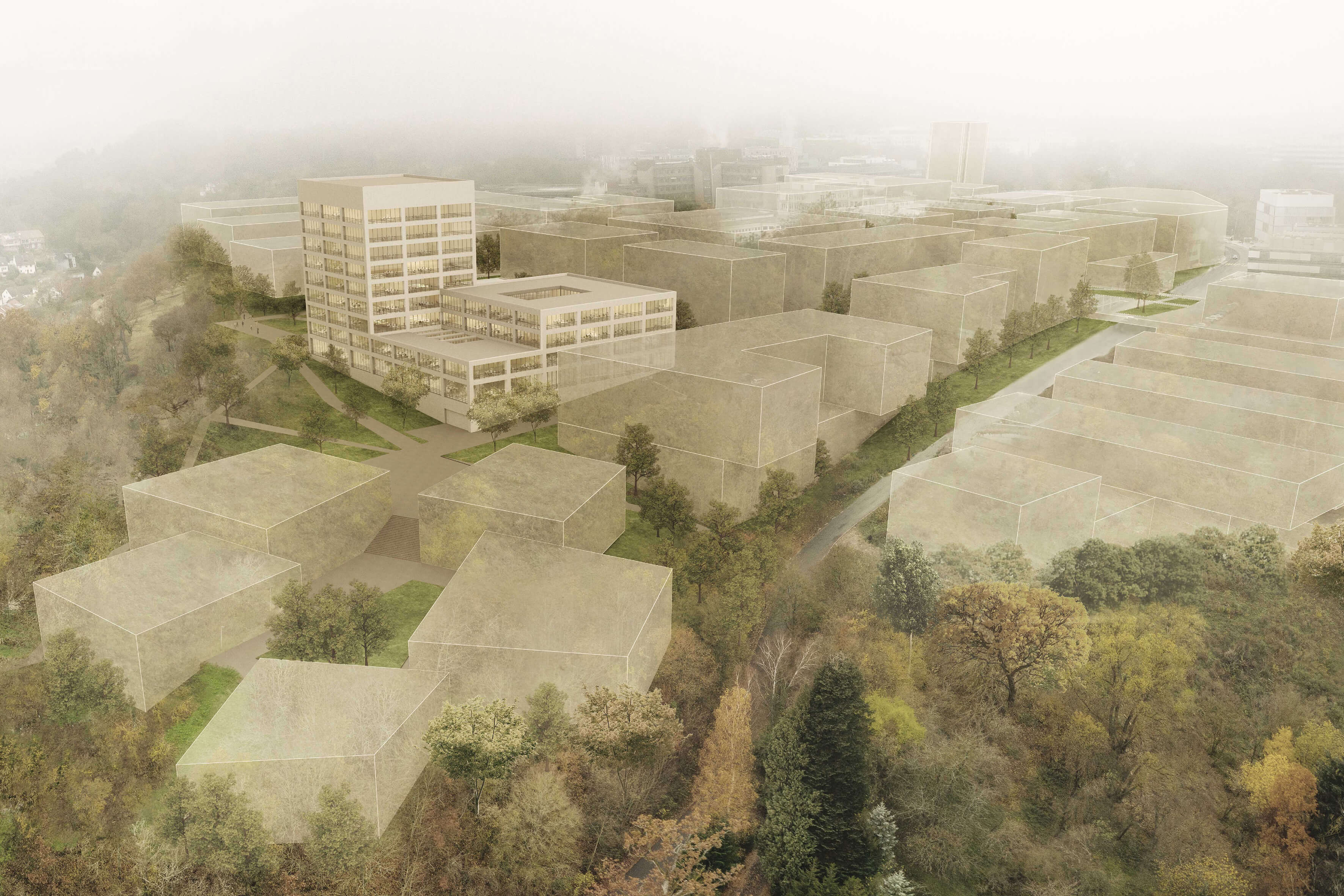 The new teaching and learning center (LLZ) of the University of Tübingen and the associated hospital marks the end point of the future north-south main road, which, according to the master plan, will form the central development axis of the hospital campus at Schnarrenberg. This main road develops from a newly created square on Schnarrenbergstraße to the south and connects the most important buildings of the campus. To the south, the main road ends in an almost spectacular viewpoint with a view of the old town and the Swabian Alb. In terms of urban space, however, this point has not yet been adequately elaborated in the current master plan.